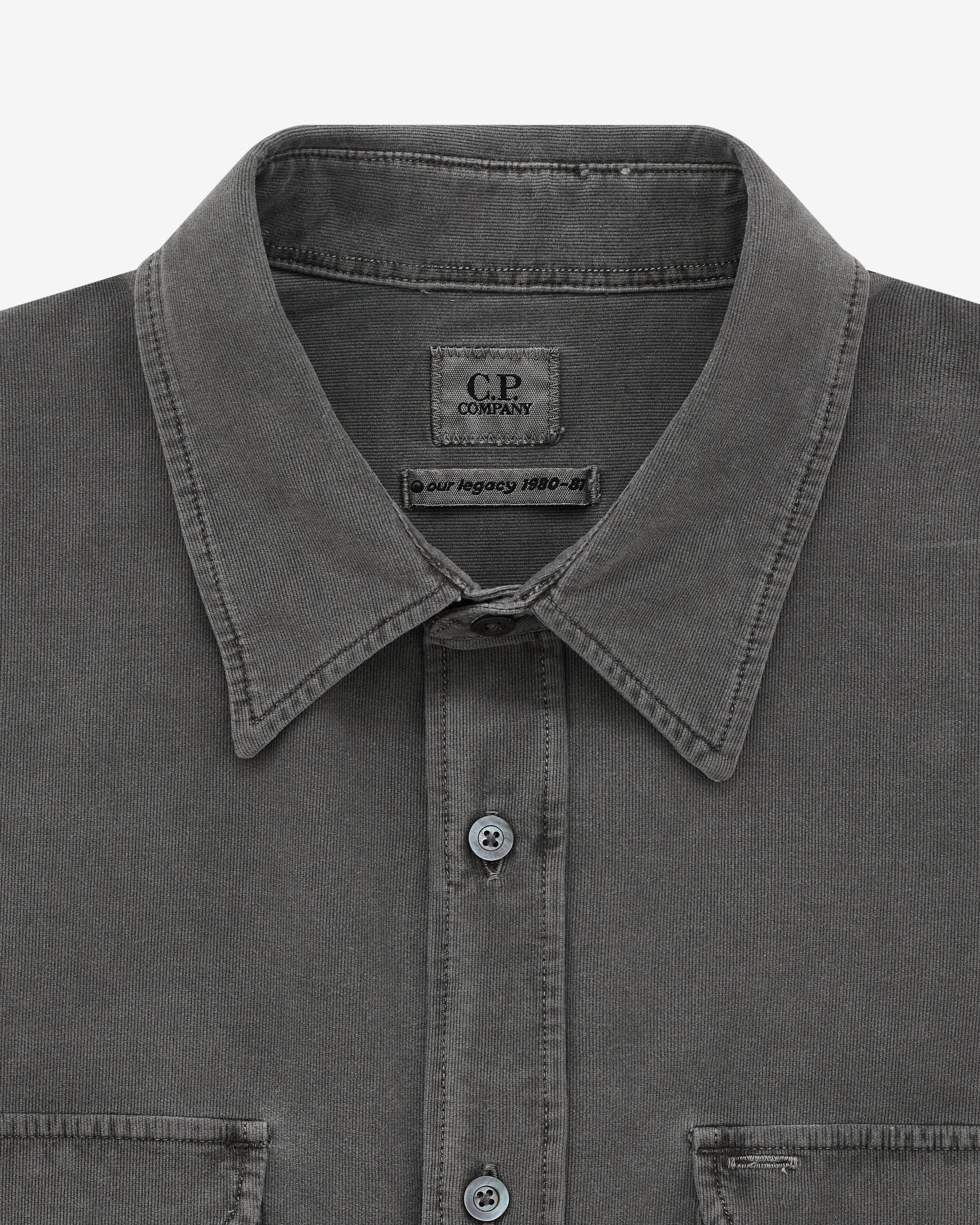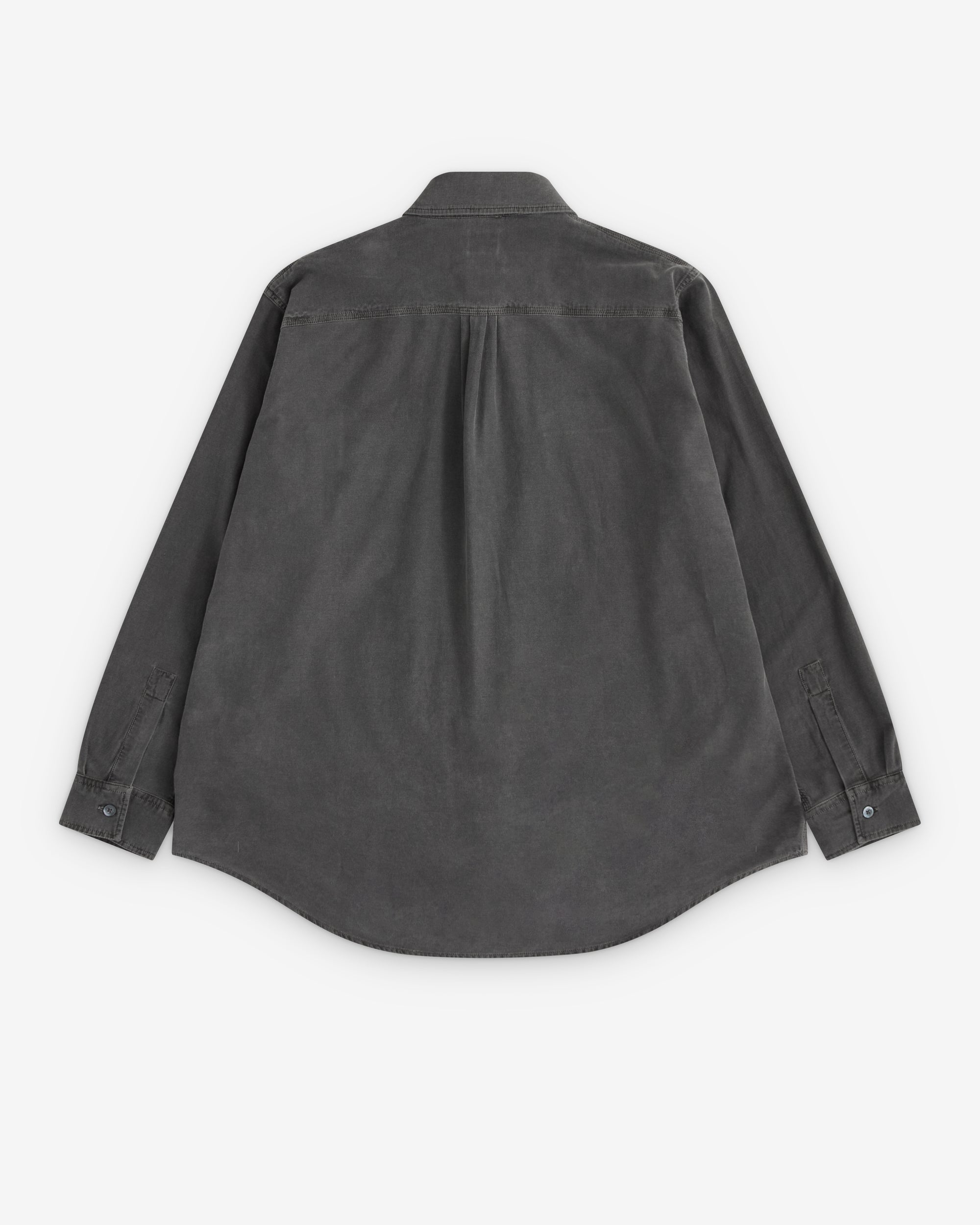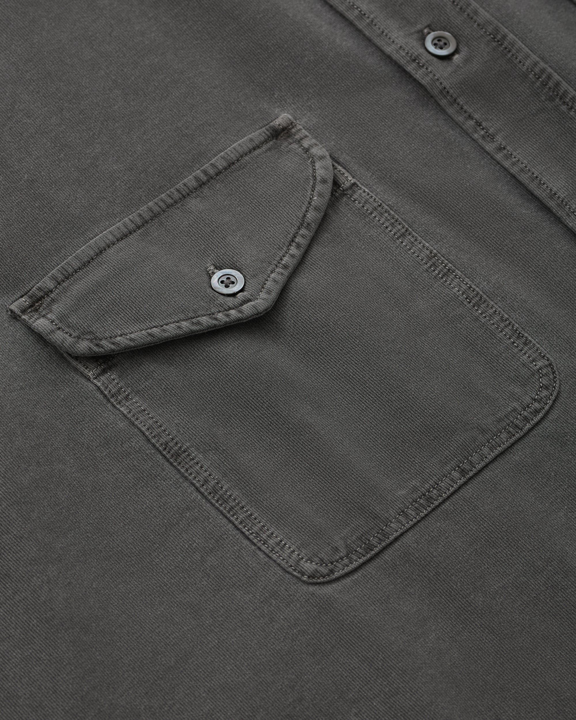 Classic shirting collarDual button close chest pocketsFront mother of pearl button closureCurved shirt tail hemGarment dyed fabricRear box pleatButton close cuffs