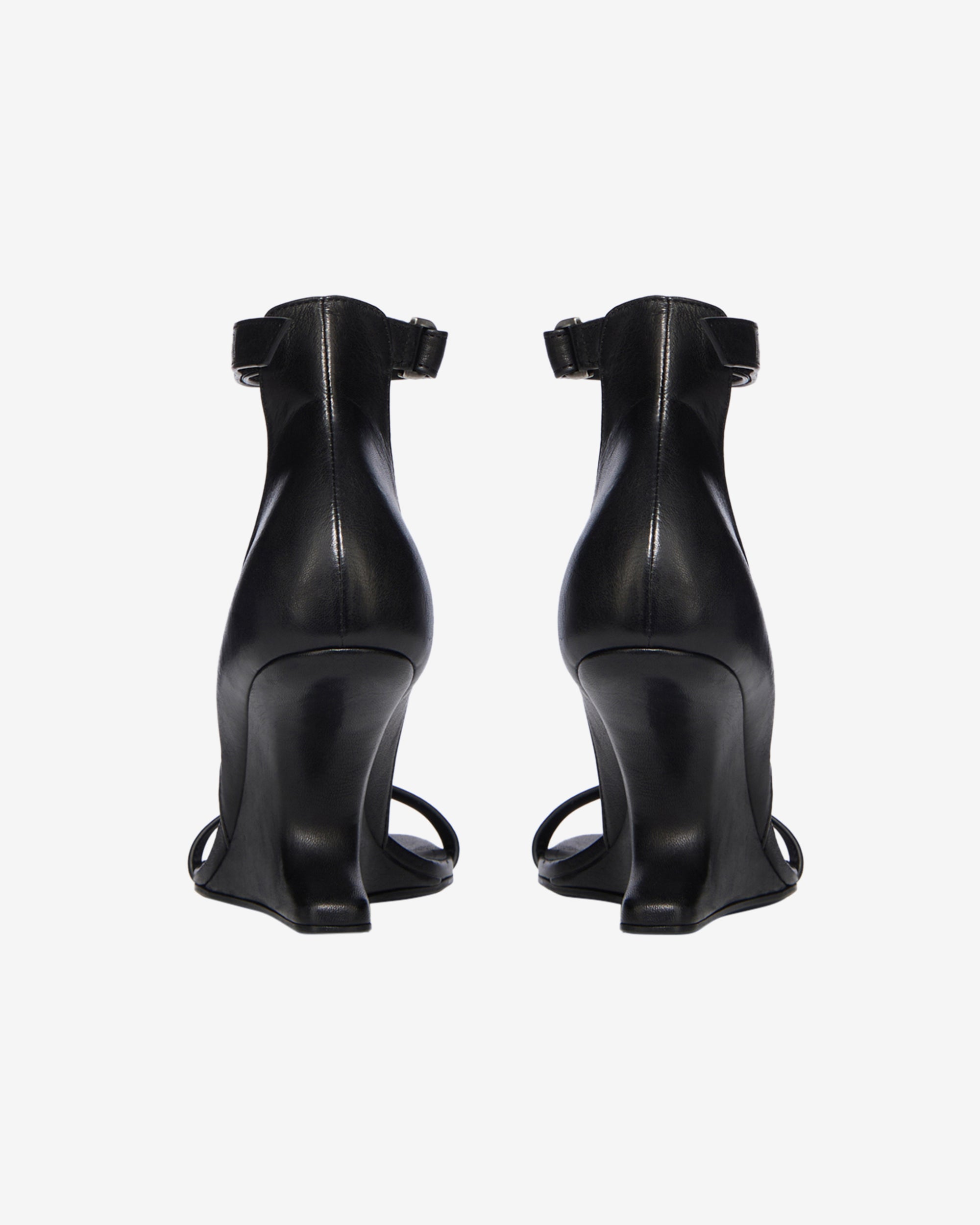 Open upperAnkle strapTall, cantilever heel100% Ram LeatherMade in Italy