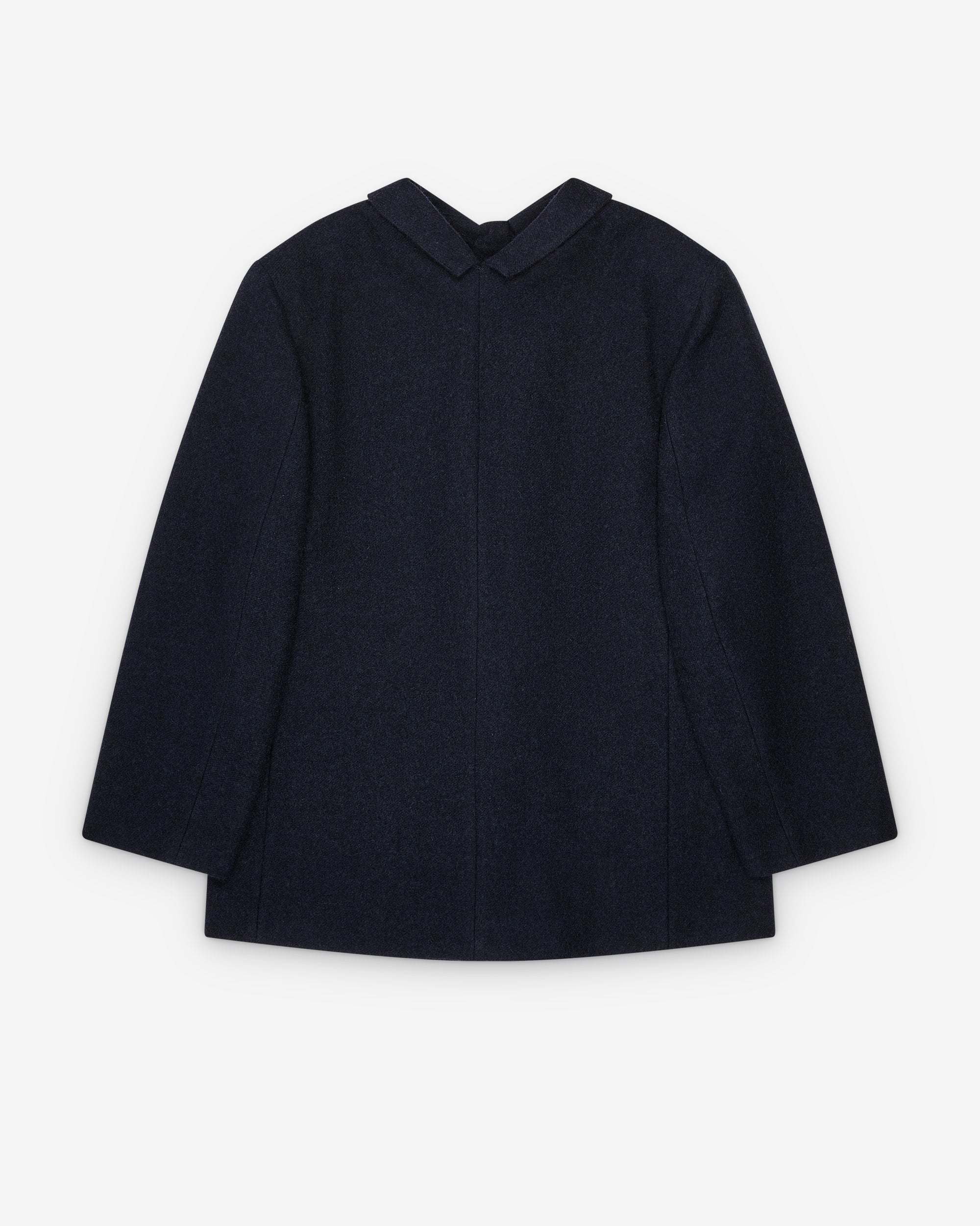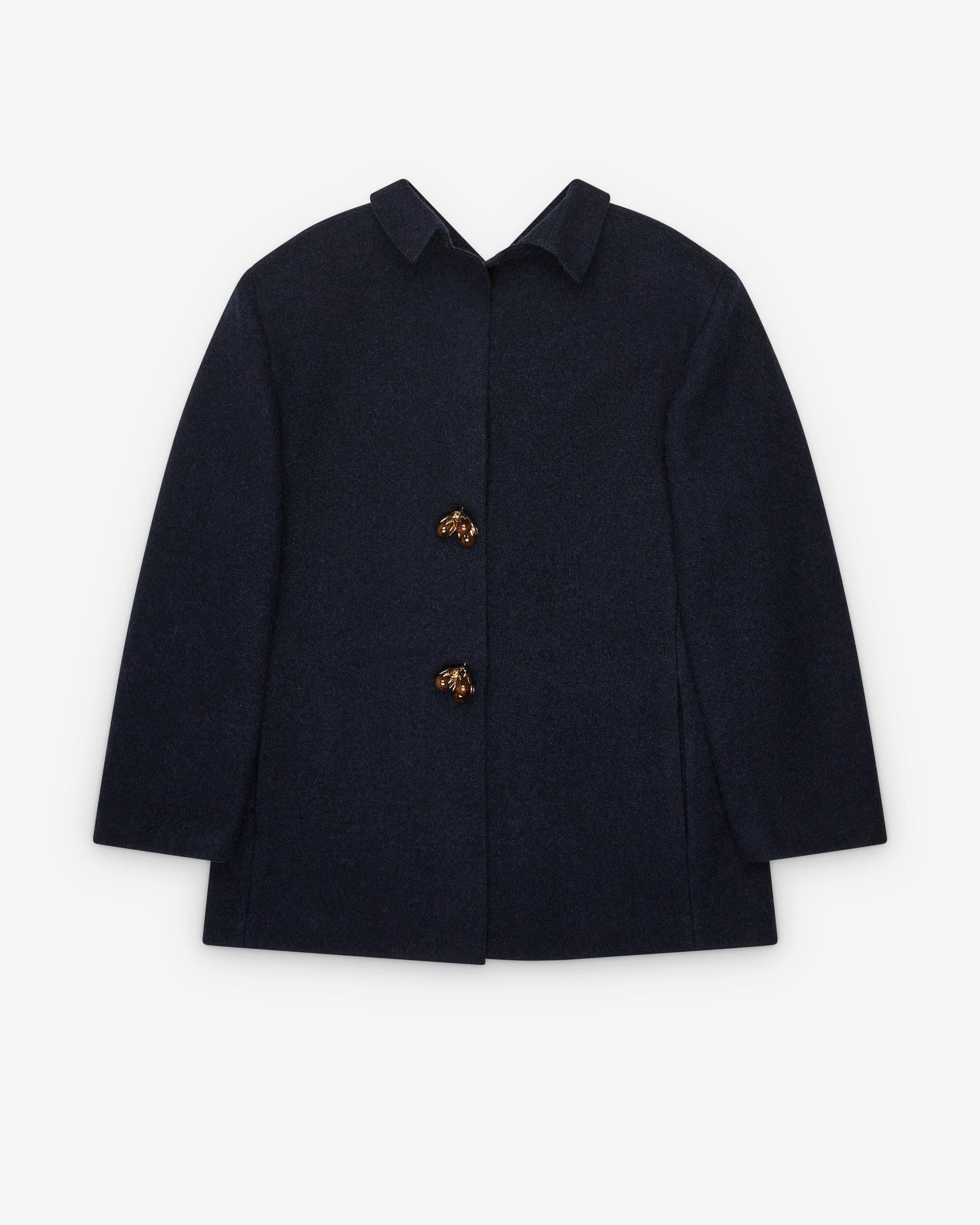 Straight fitLined garmentCollarFront closure with jewel buttonsSleeves with slitsSide pocketsBack slit100% Virgin Wool; 60% Brass, 40% MethacrylateMade in Italy