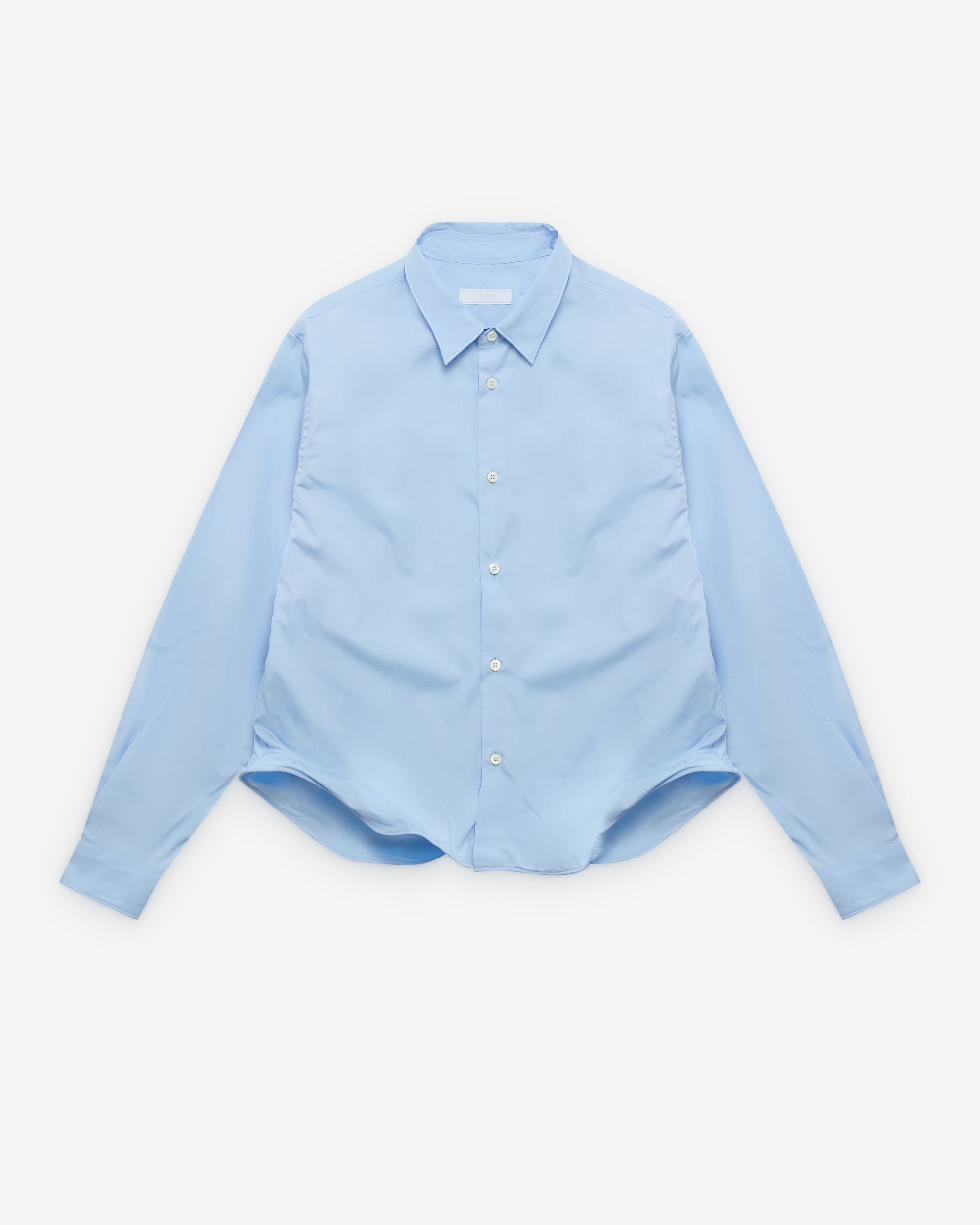 Straight fitClassic collarRounded hemWire hemClassic cuffMother-of-pearl button closureFabric triangle logo