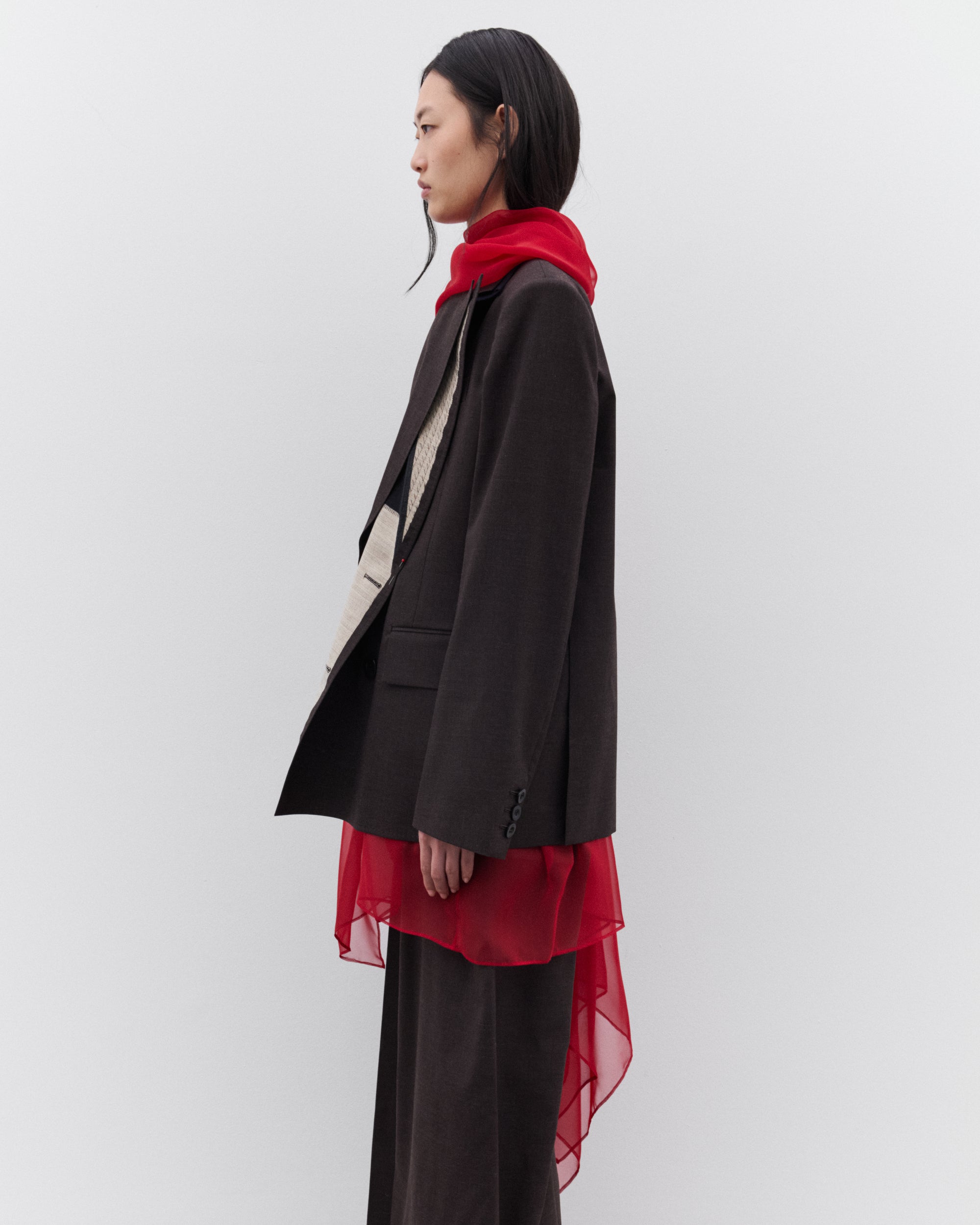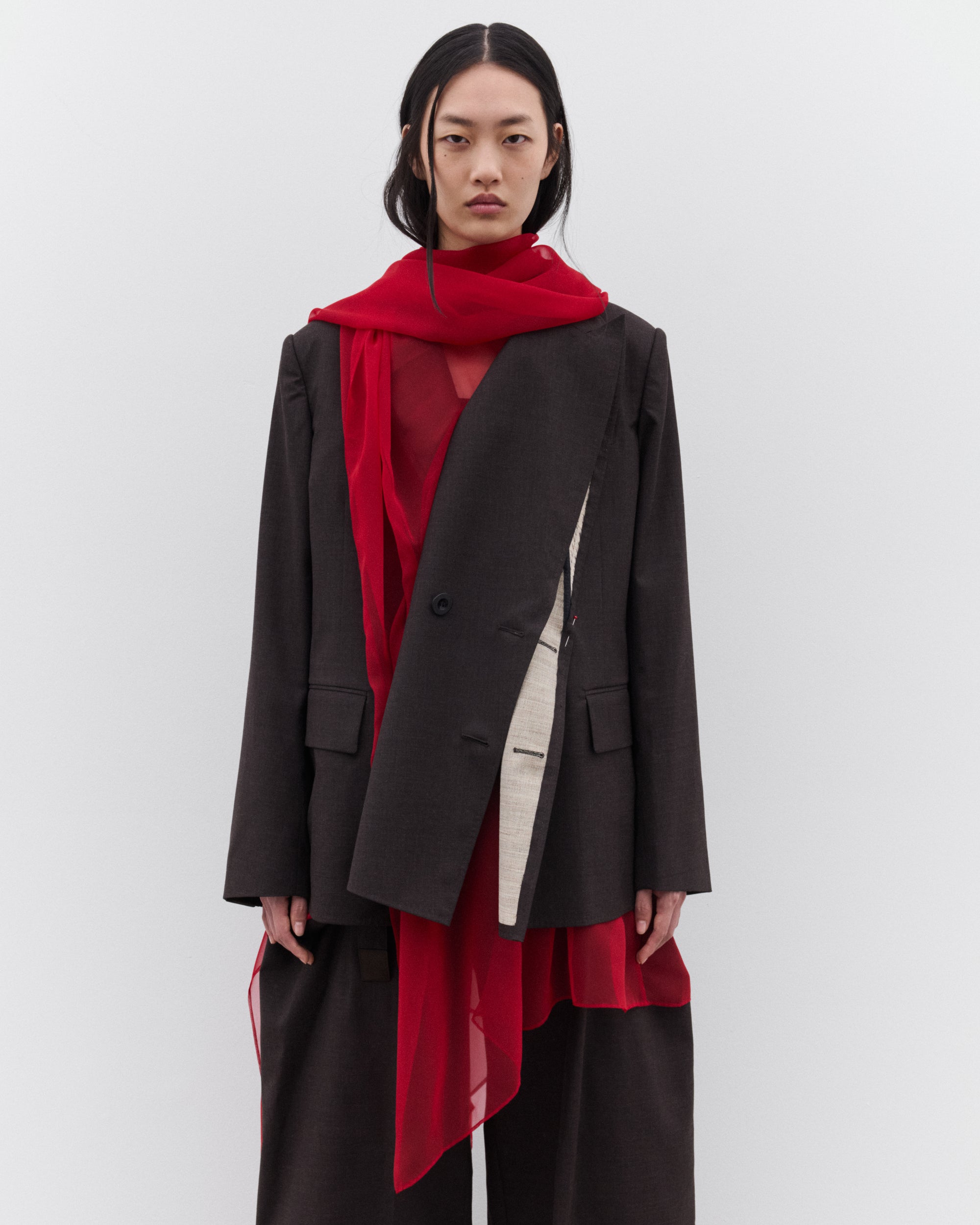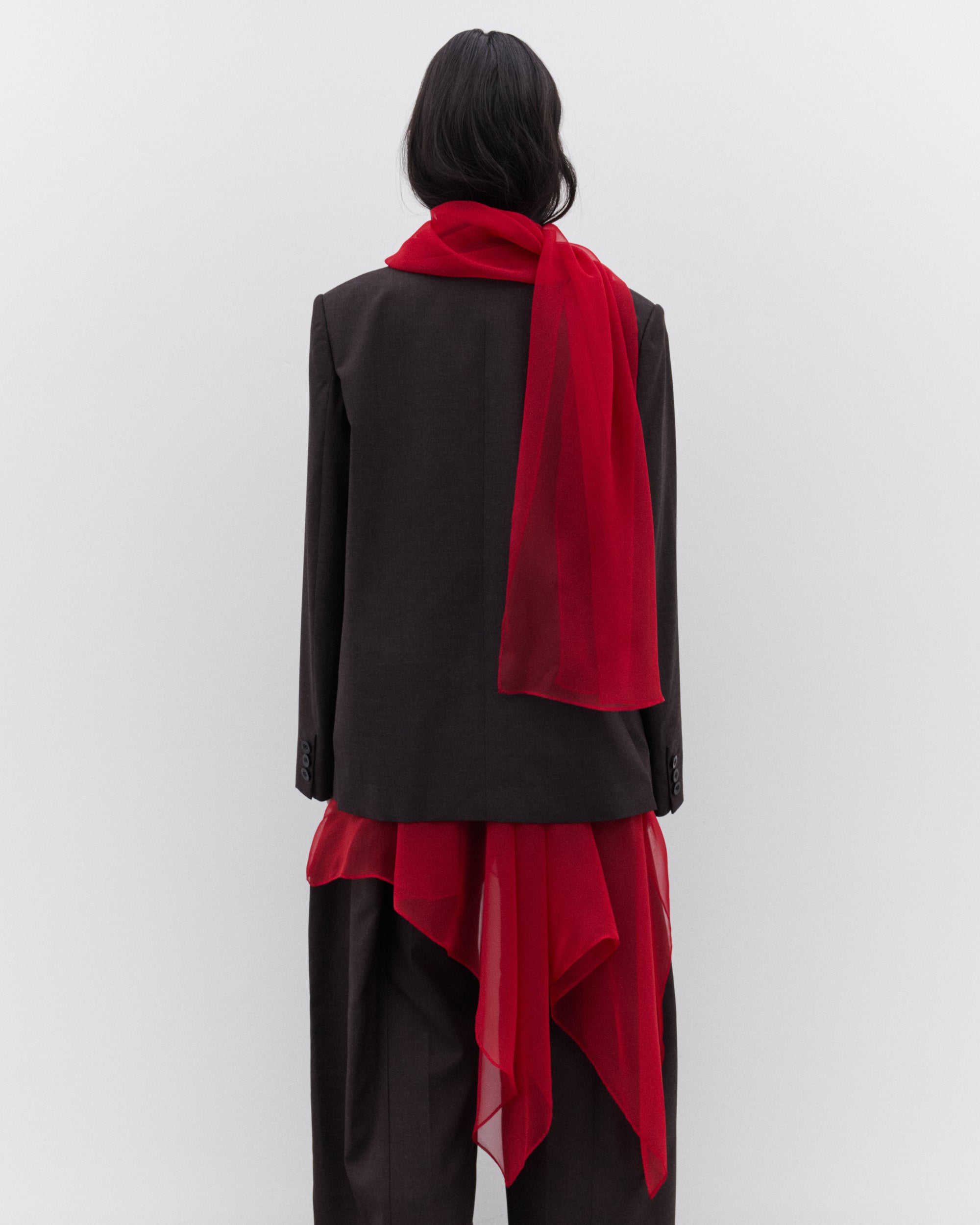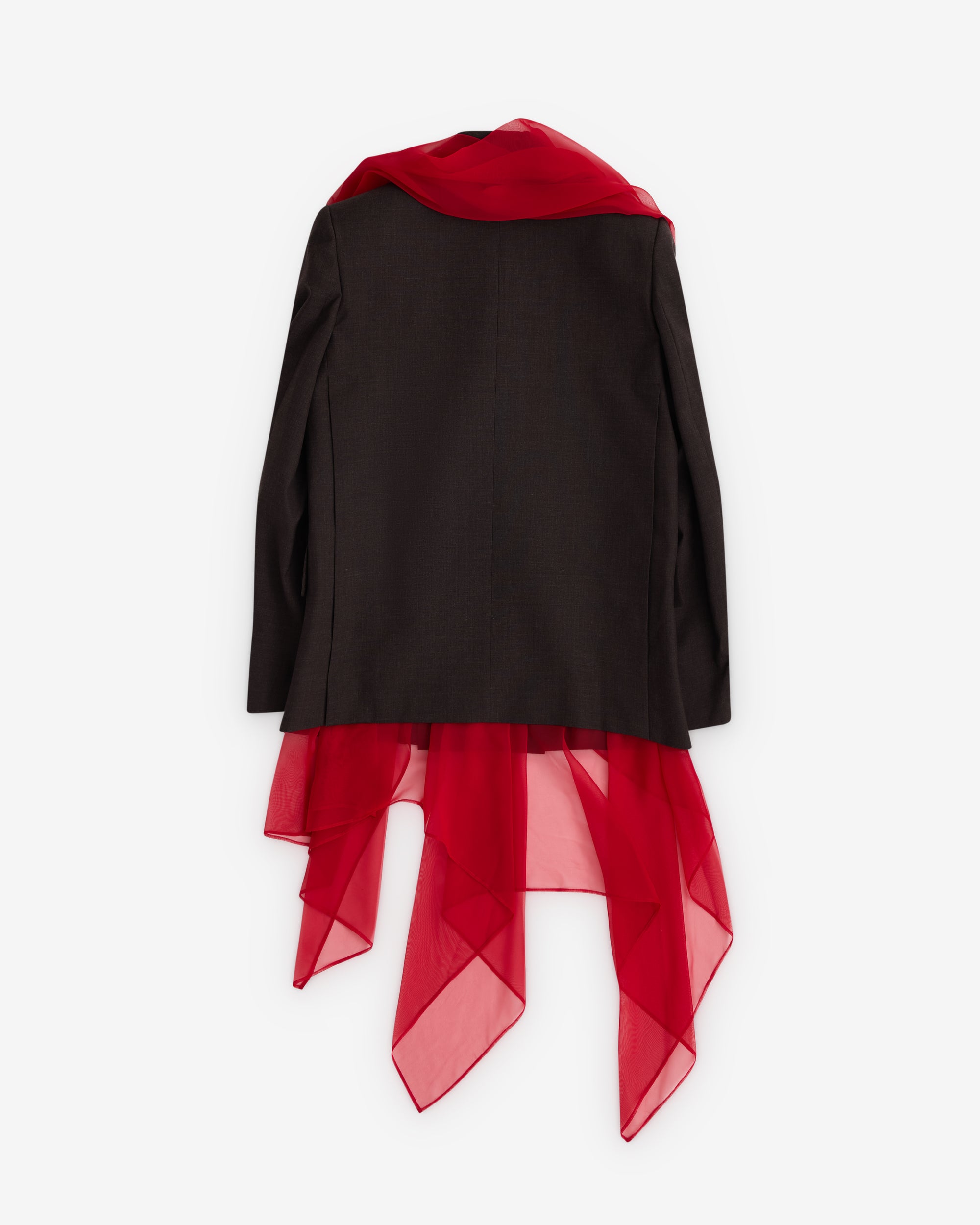 Double-breastedRed ruffle detail from hemFront flap pockets100% WoolMade in Japan