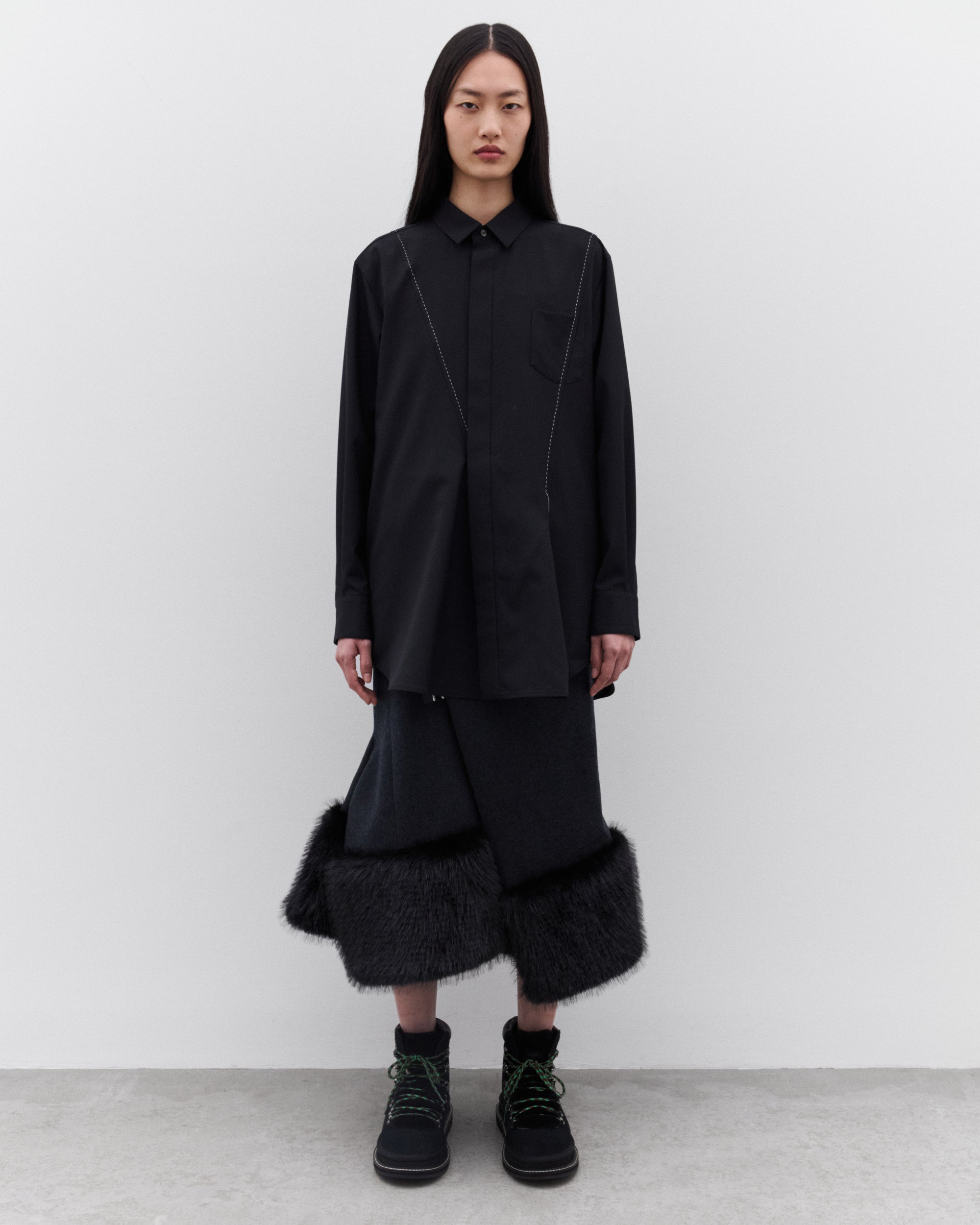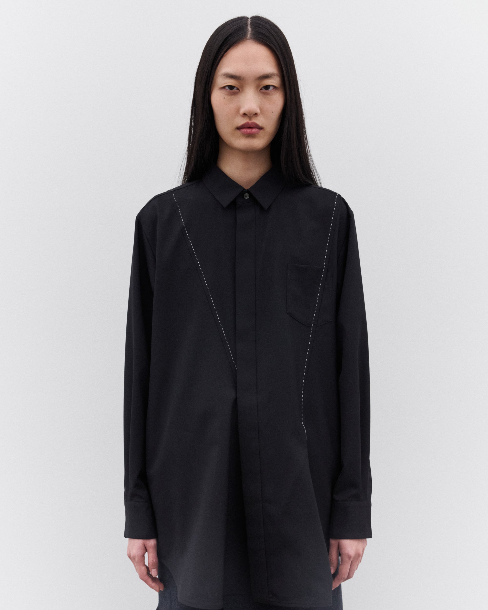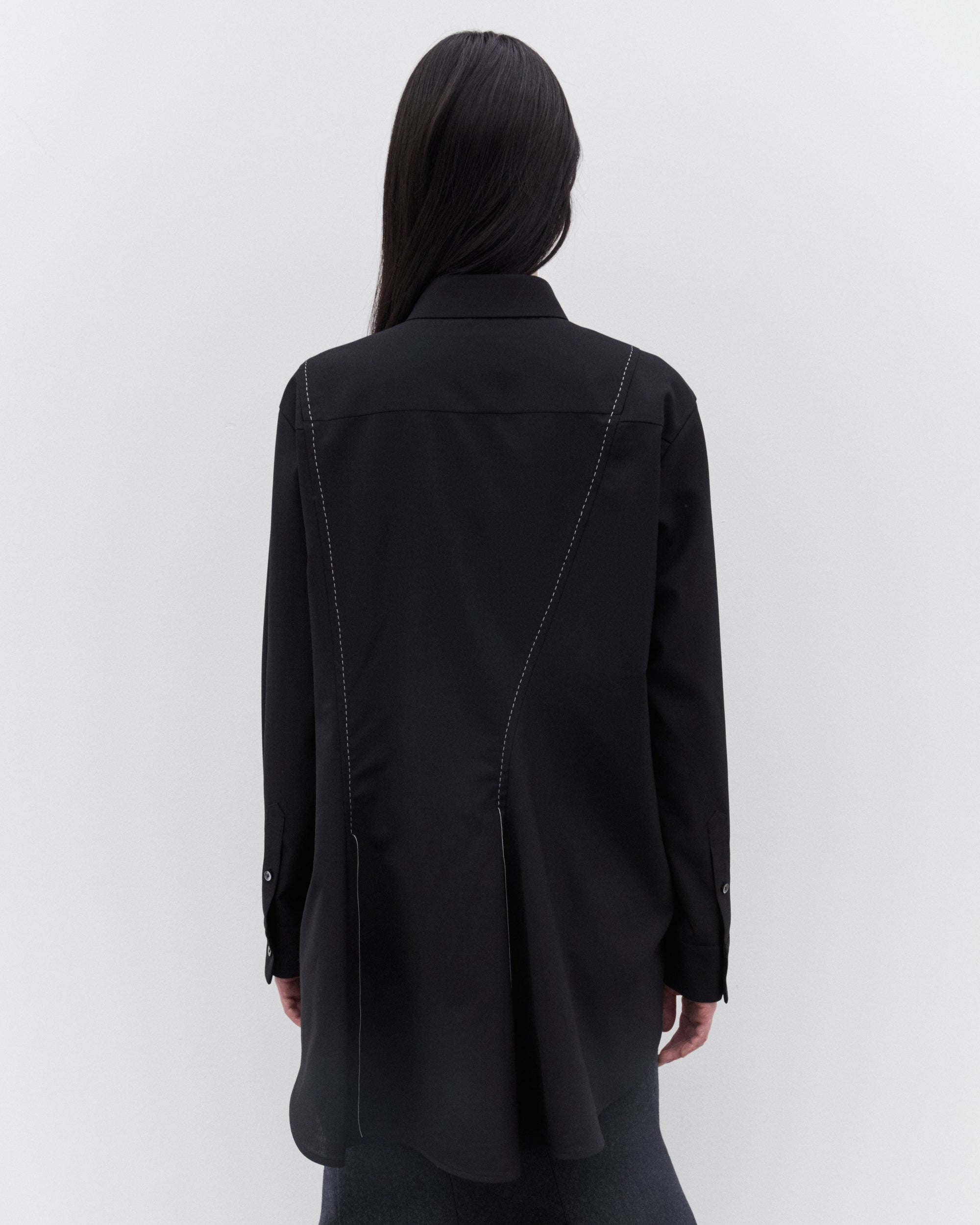 Contrast stitchingPleated details at backCollarCovered placketLong length70% Polyester, 30% WoolMade in Japan