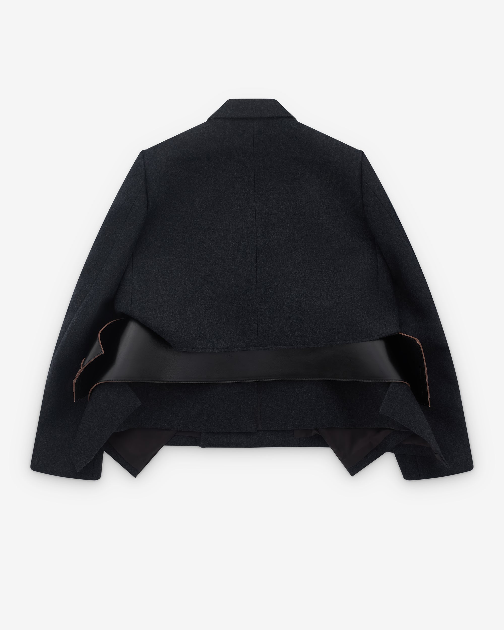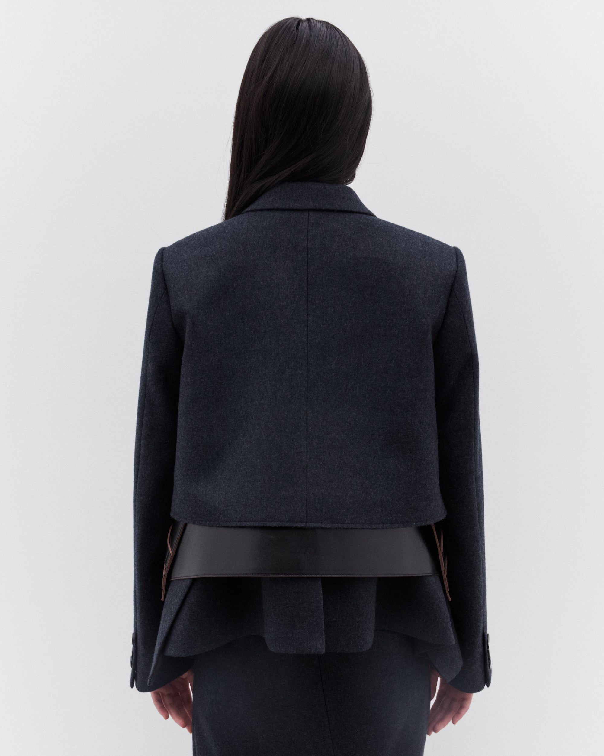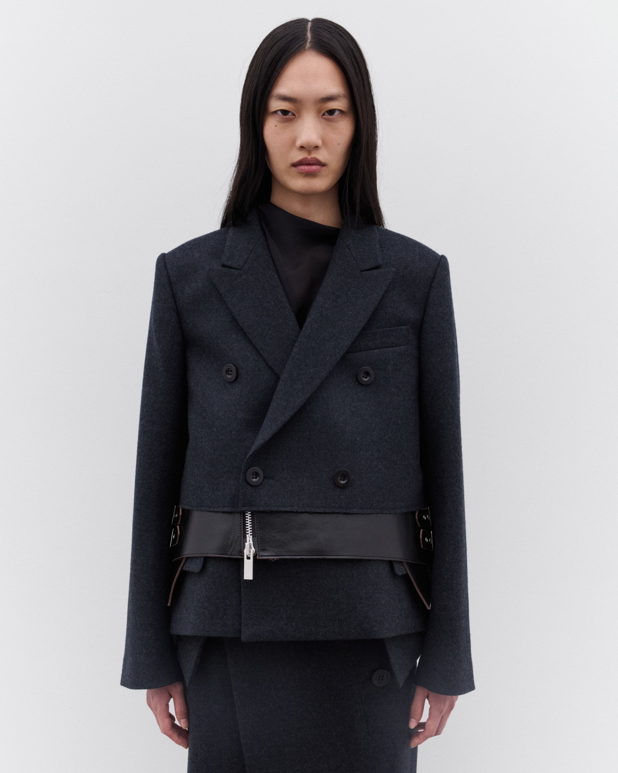 Double breasted closurePeak lapel collarInternal liningLeather panelling