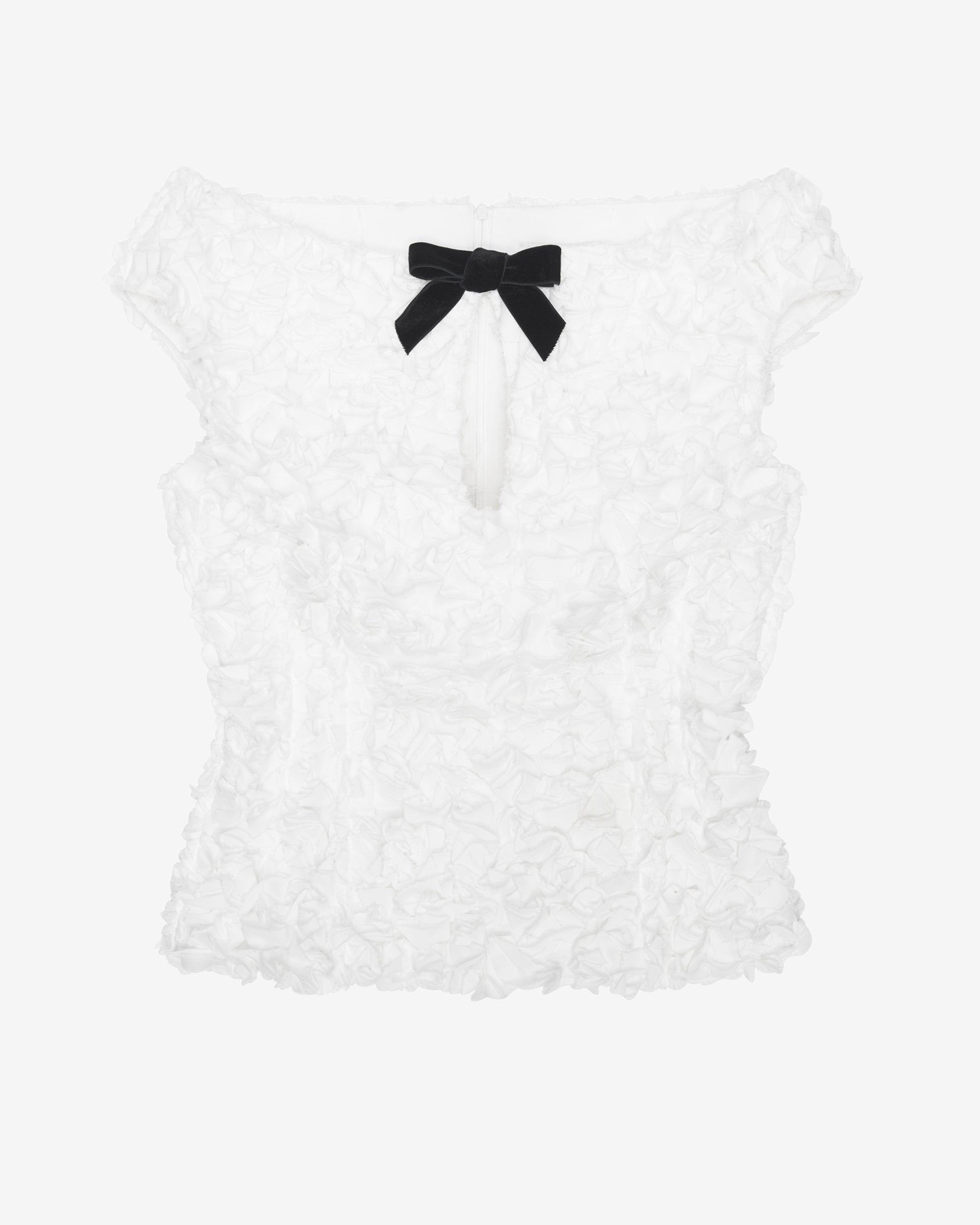 Sleeveless off shoulder topBow detail at chestBack zip closureCut out at chestCropped fit
