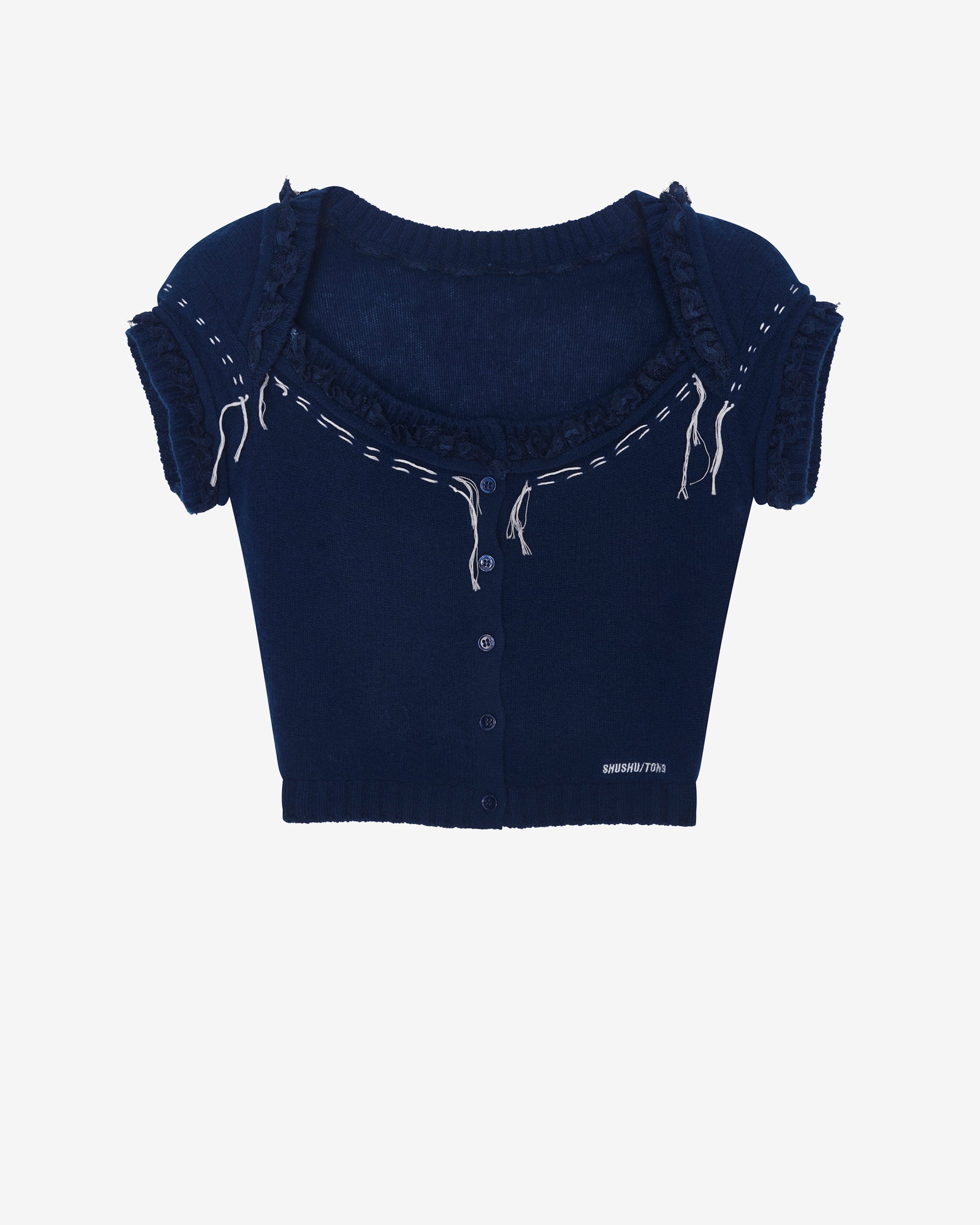 Square necklineShort sleeves with ribbed trimKnit ruffle trim at neckContrast stitch detailsFront button closure