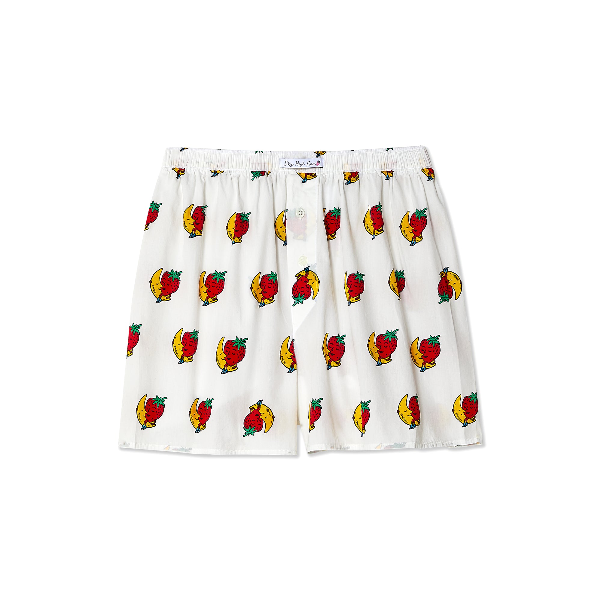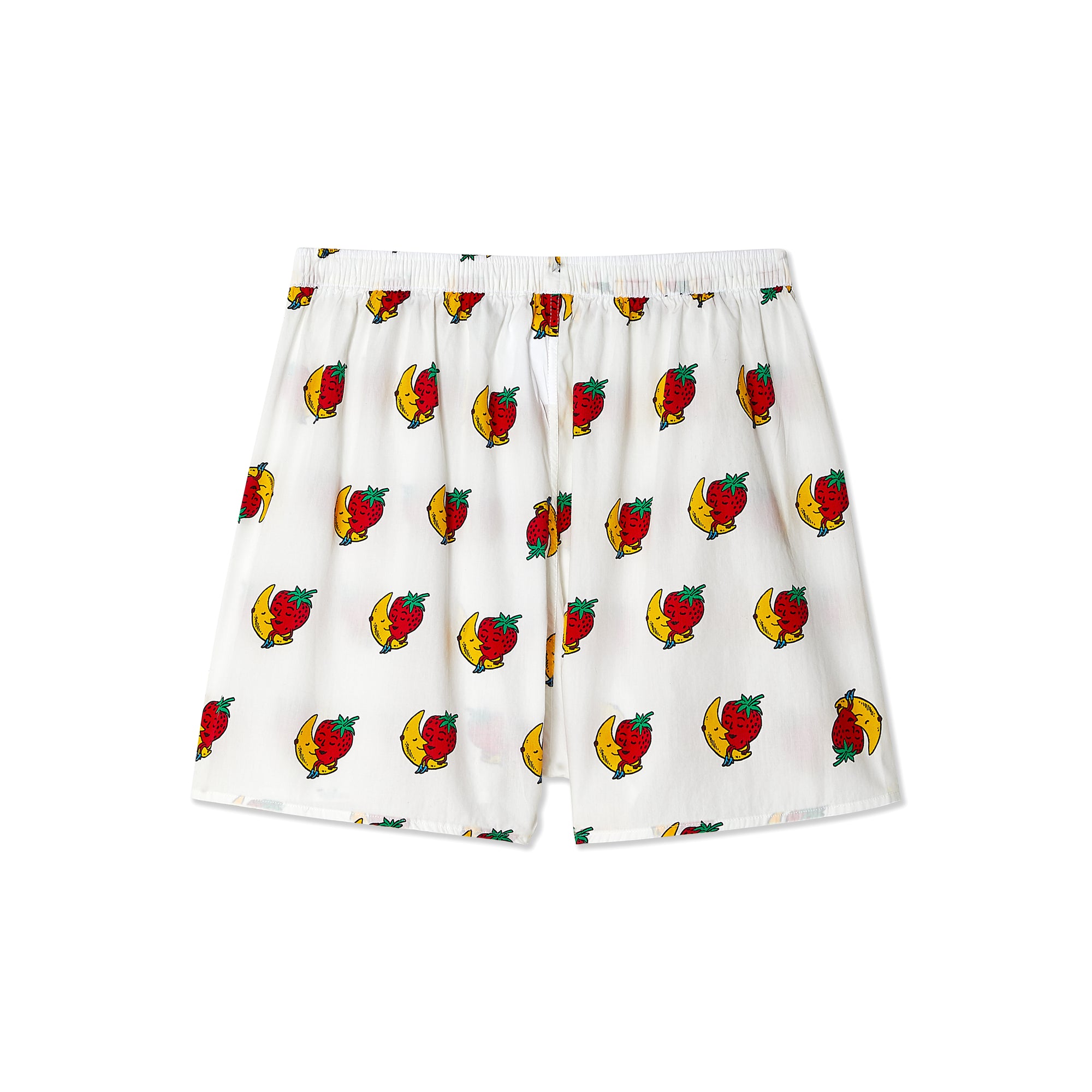 White, red and yellow Sky High Farms logo printed woven boxers with strawberry moon print throughout and button fly featuring brand tag.