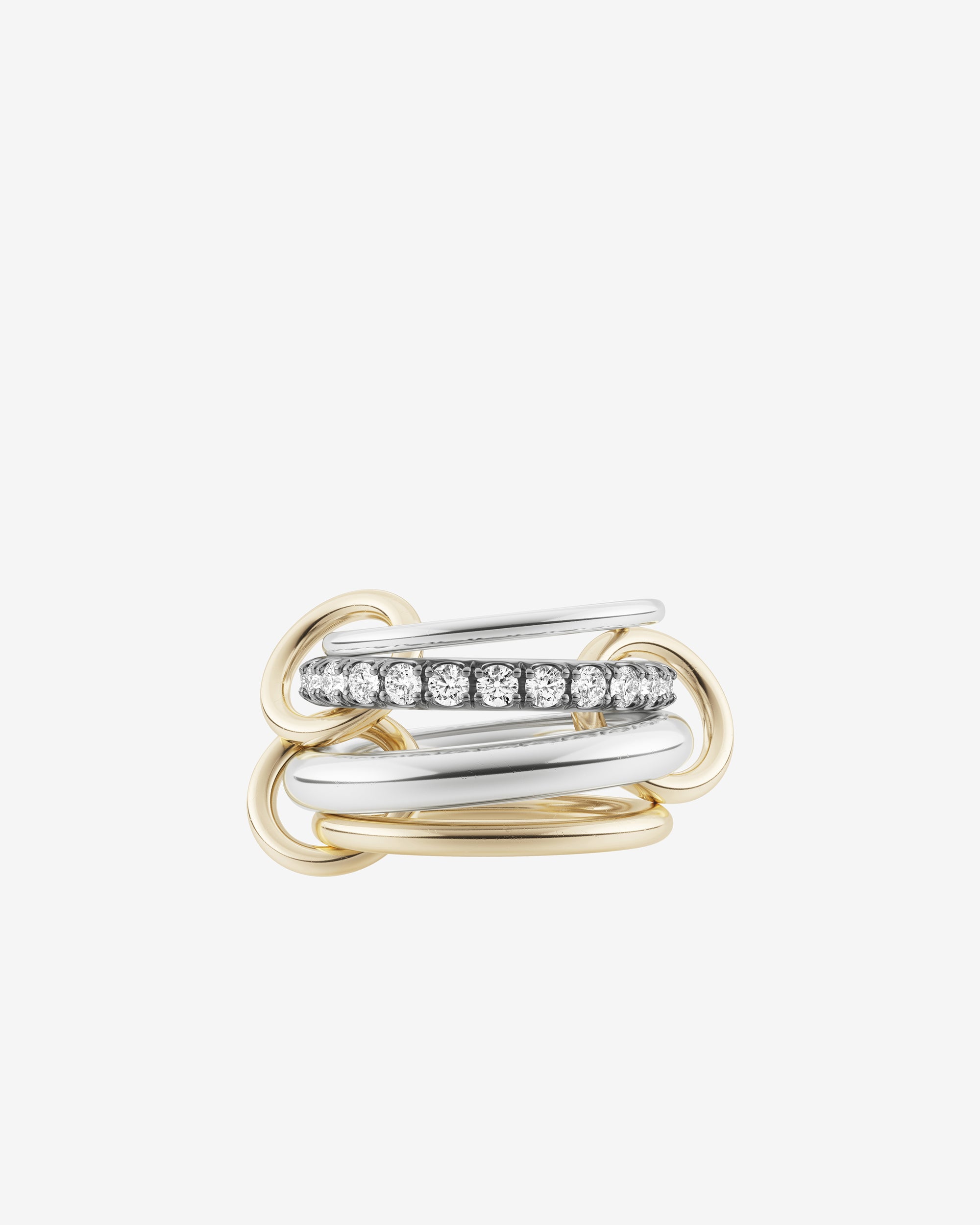 The Janssen SG features four multi-gauged linked bands with u-pavè set diamonds and orbiting 18k gold connectors. Each Janssen SG is individually handmade in Los Angeles.