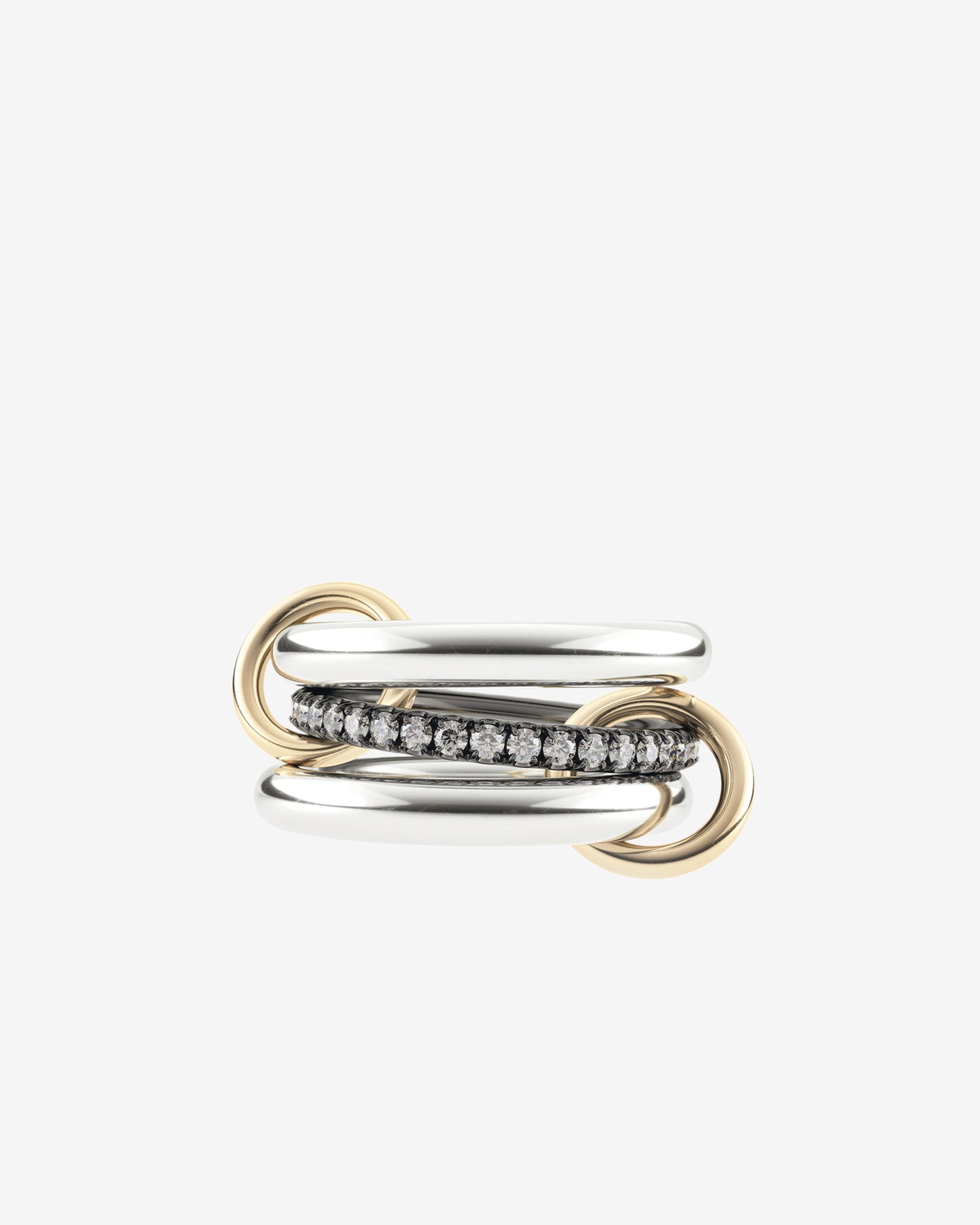 One of our signature pave styles, the Libra ring emulates balance and poise. A core band of pave diamonds is framed by two substantial bands of 18k gold or lustrous sterling silver, and linked by two 18k gold connectors. Many paths lead to harmony, and the Libra is available in diverse colorways for perfect balance. Each Libra is individually handmade in Los Angeles.