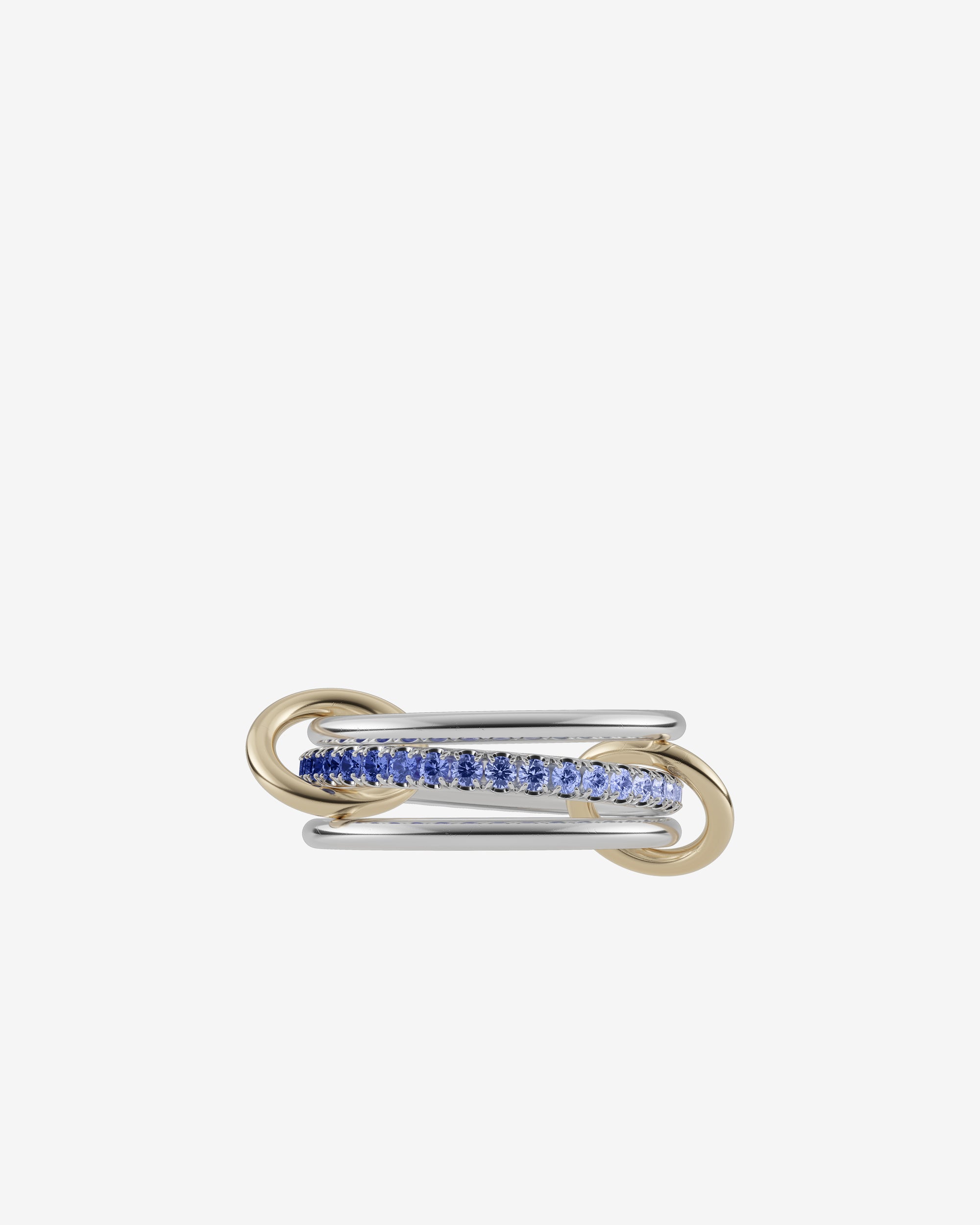 The Tigris is expertly crafted with a central band of u-pavé diamonds or ombré sapphires, framed by two equal-gauged bands of .925 sterling silver or 18k yellow gold. All bands are linked by orbiting 18k gold connectors, resulting in an elegant and lightweight complement to any ensemble. Each Tigris is artfully handmade in Los Angeles.