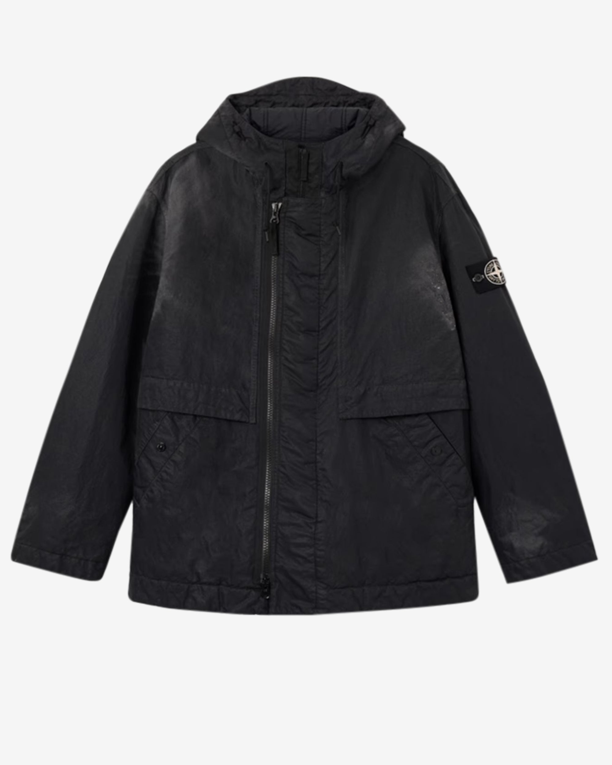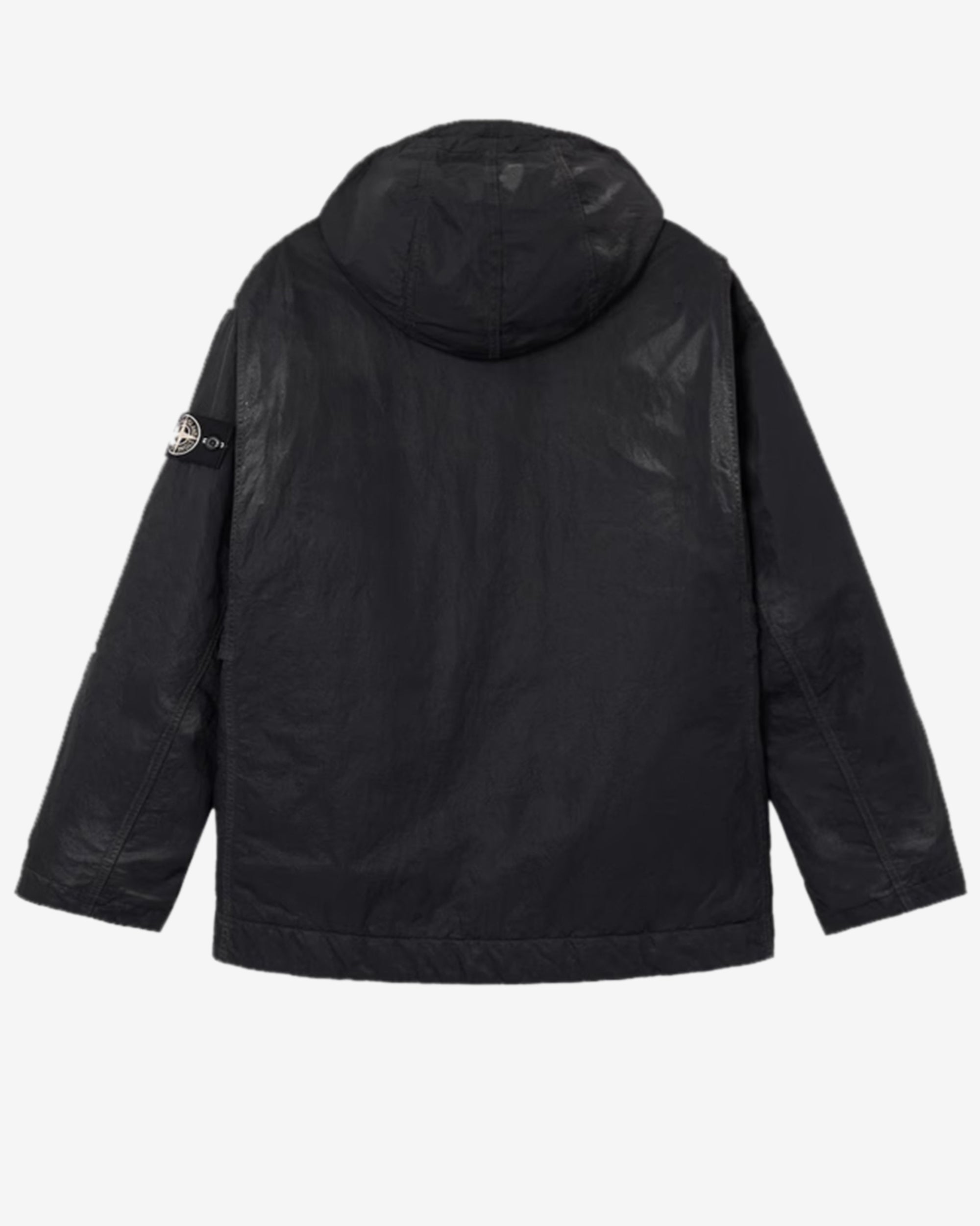 Shaped hood with visor and drawstring Angled hand pockets with snap Internal top-entry pocket with button and Compass logo embroidery Overlay flap at shoulders White Stone Island research badge on left sleeve Two-way zipper fastening