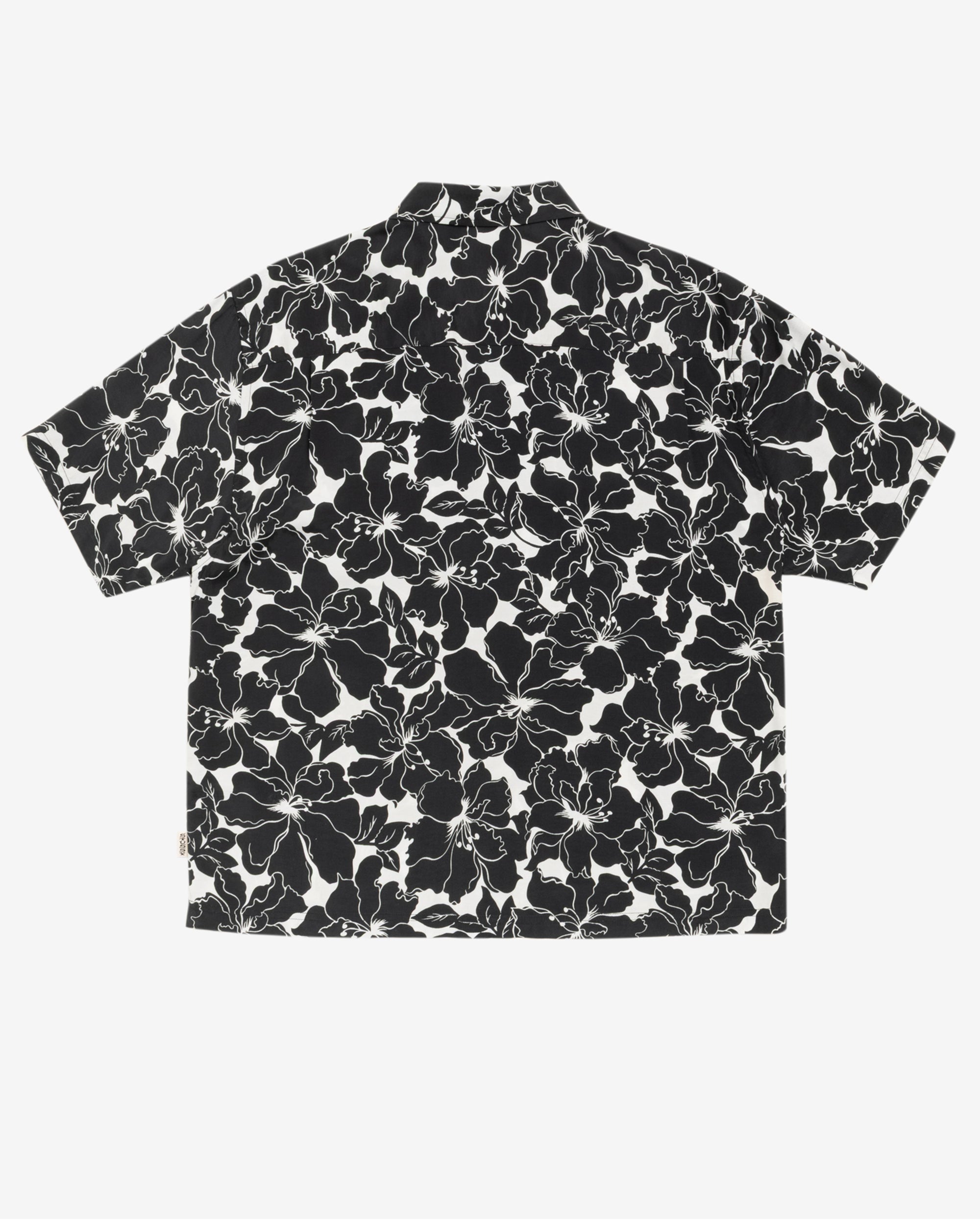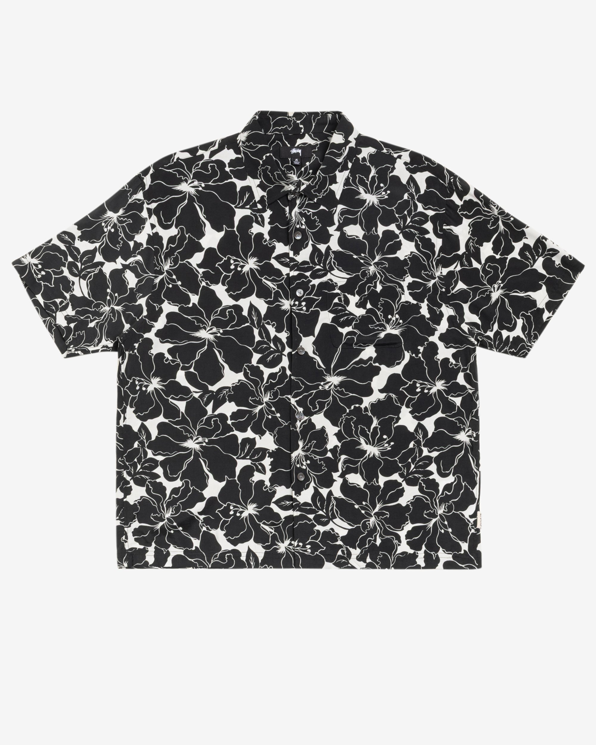 Allover Hawaiian printShortsleeveMother of pearl button closureTopstitch detailingChest patch pocketStüssy serif flag label at side seamPleated back yokeStraight hemUnisex