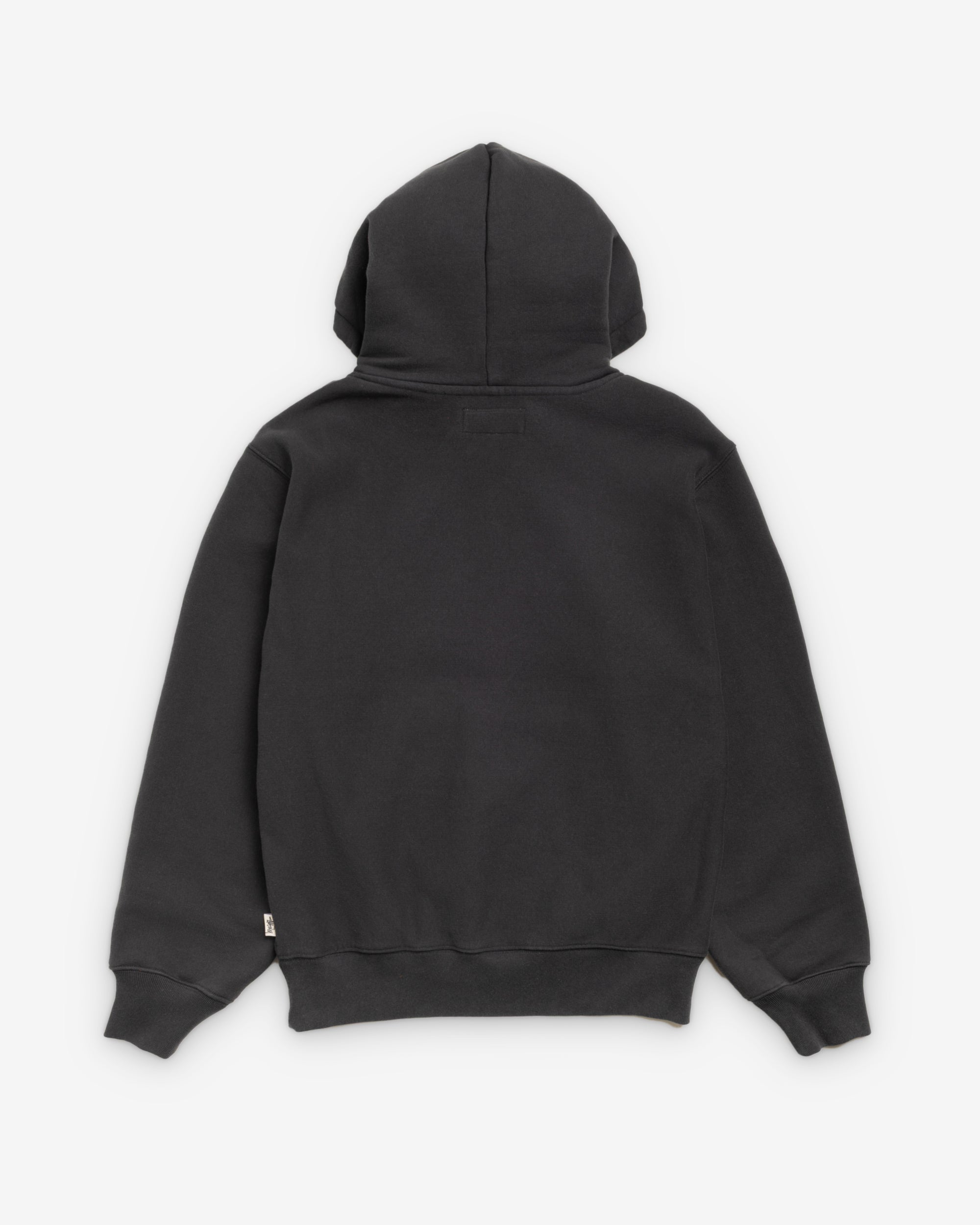 Relaxed fit hooded fleece sweatshirt Heavyweight 535gsm cotton blend Round woven drawcord in hood Ribbed cuffs and hem Kangaroo pocket Stüssy big basic flag label at side seam Unisex Material: 66% cotton / 34% polyester Imported