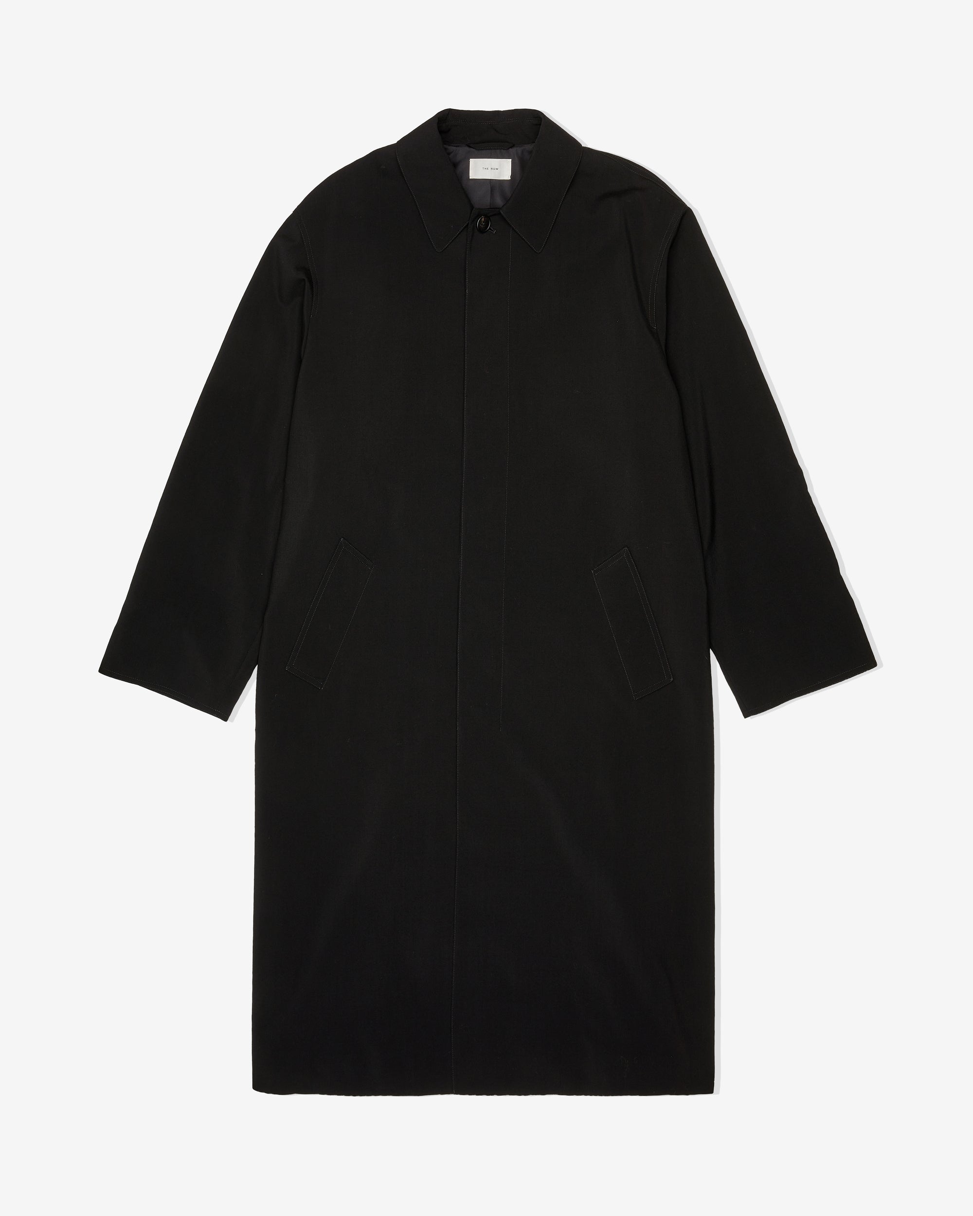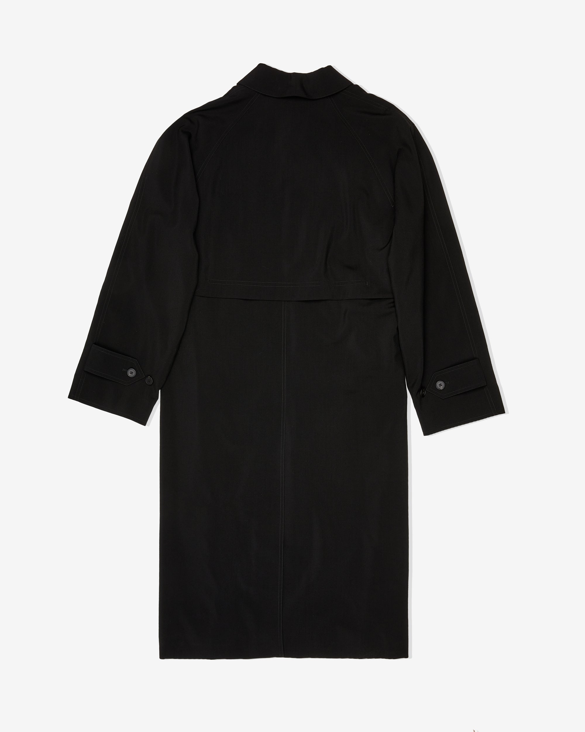 Single-breasted trench coatCrisp tropical woolBack storm flapFront welt pocketsConcealed front placketHorn button closure100% Sheep WoolMade in Italy