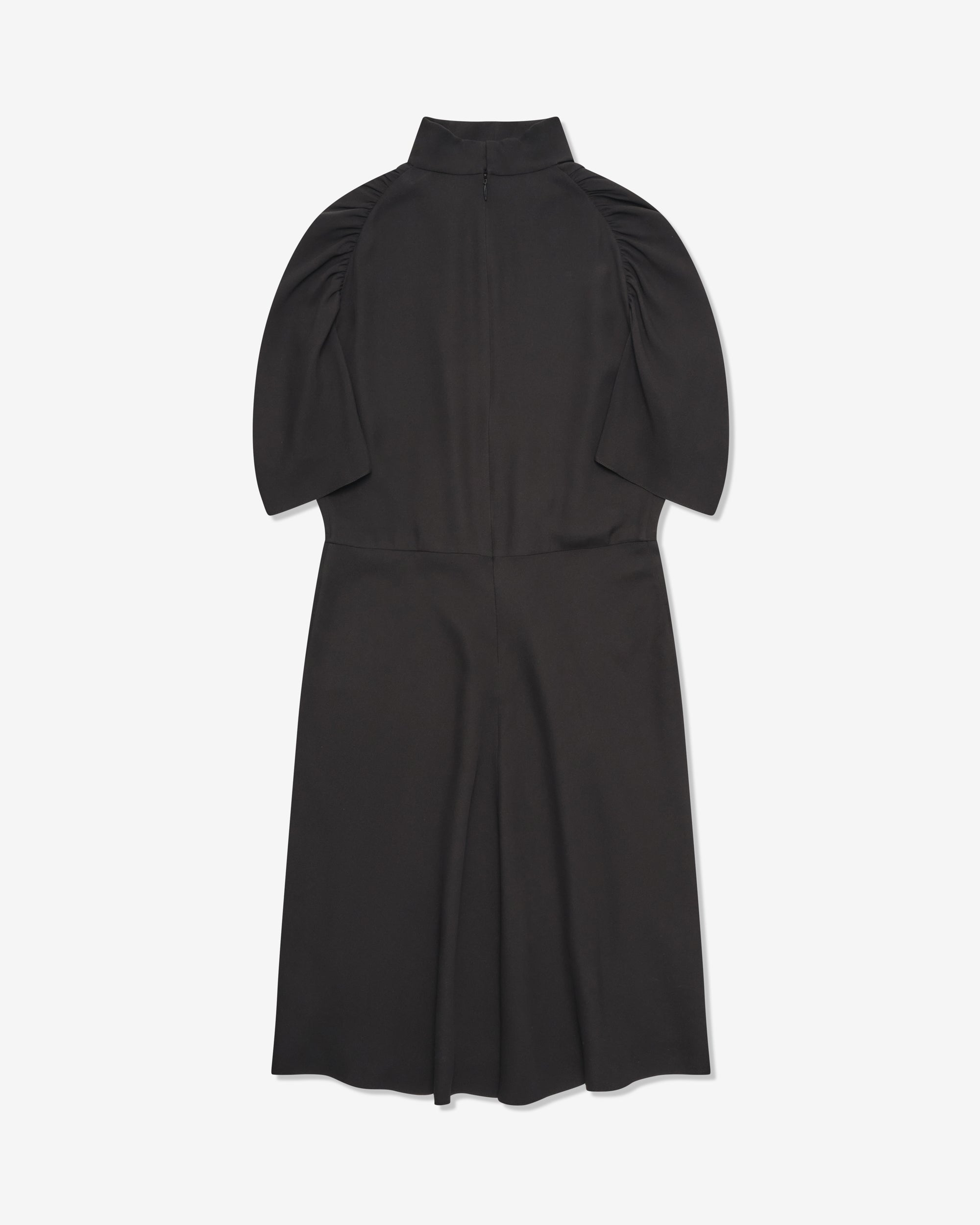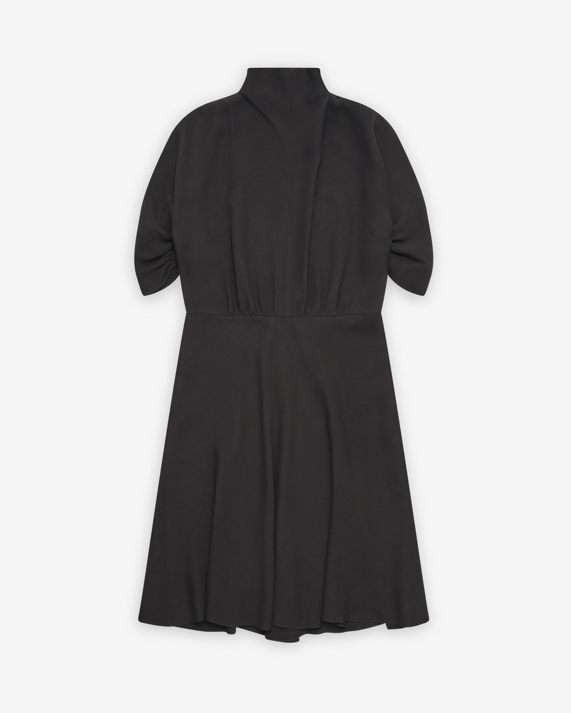Flared calf-length dressSilk crepe cadyHigh funnel necklineFitted waistElbow-length dolman sleeves with gathered detailingConcealed back zipper closure with hook and eye at neckline100% SilkMade in Italy