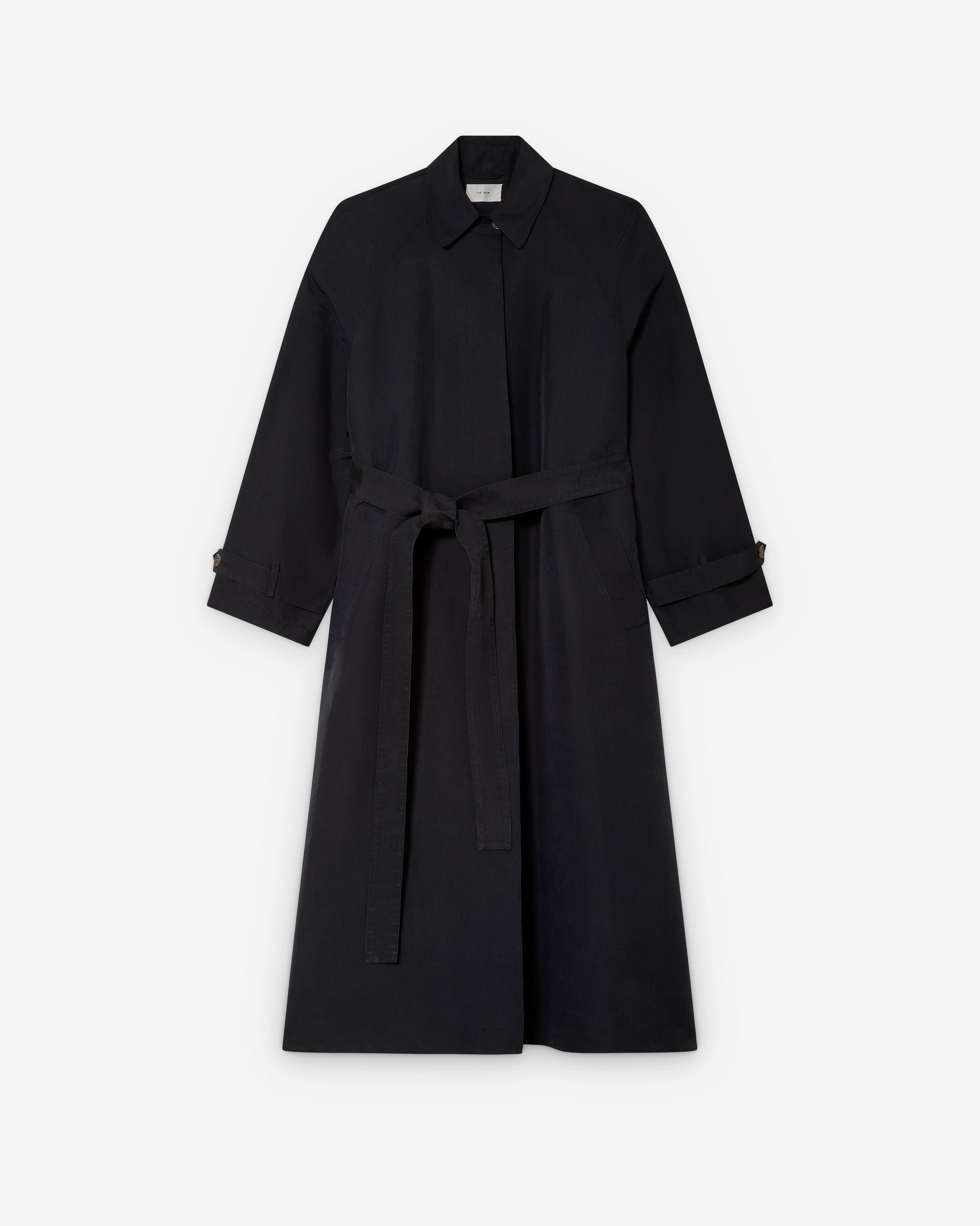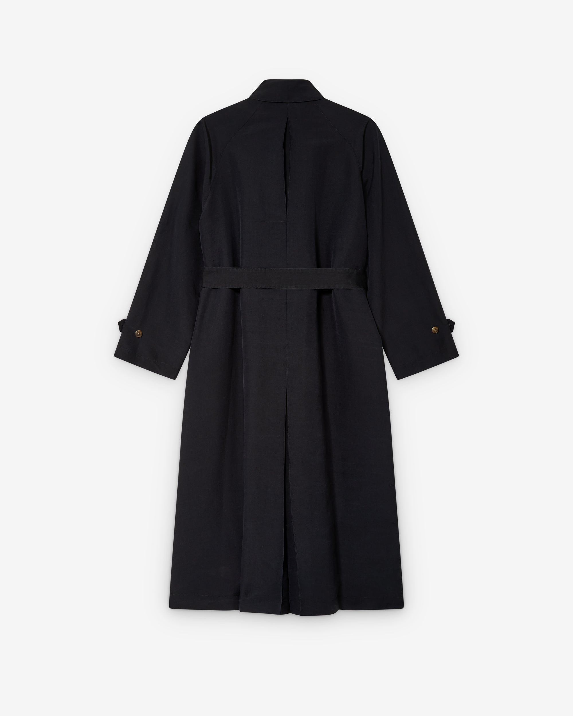 Ankle-length trench coatSelf beltFront welt pocketsConcealed front placket with horn button closures100% SilkMade in Italy
