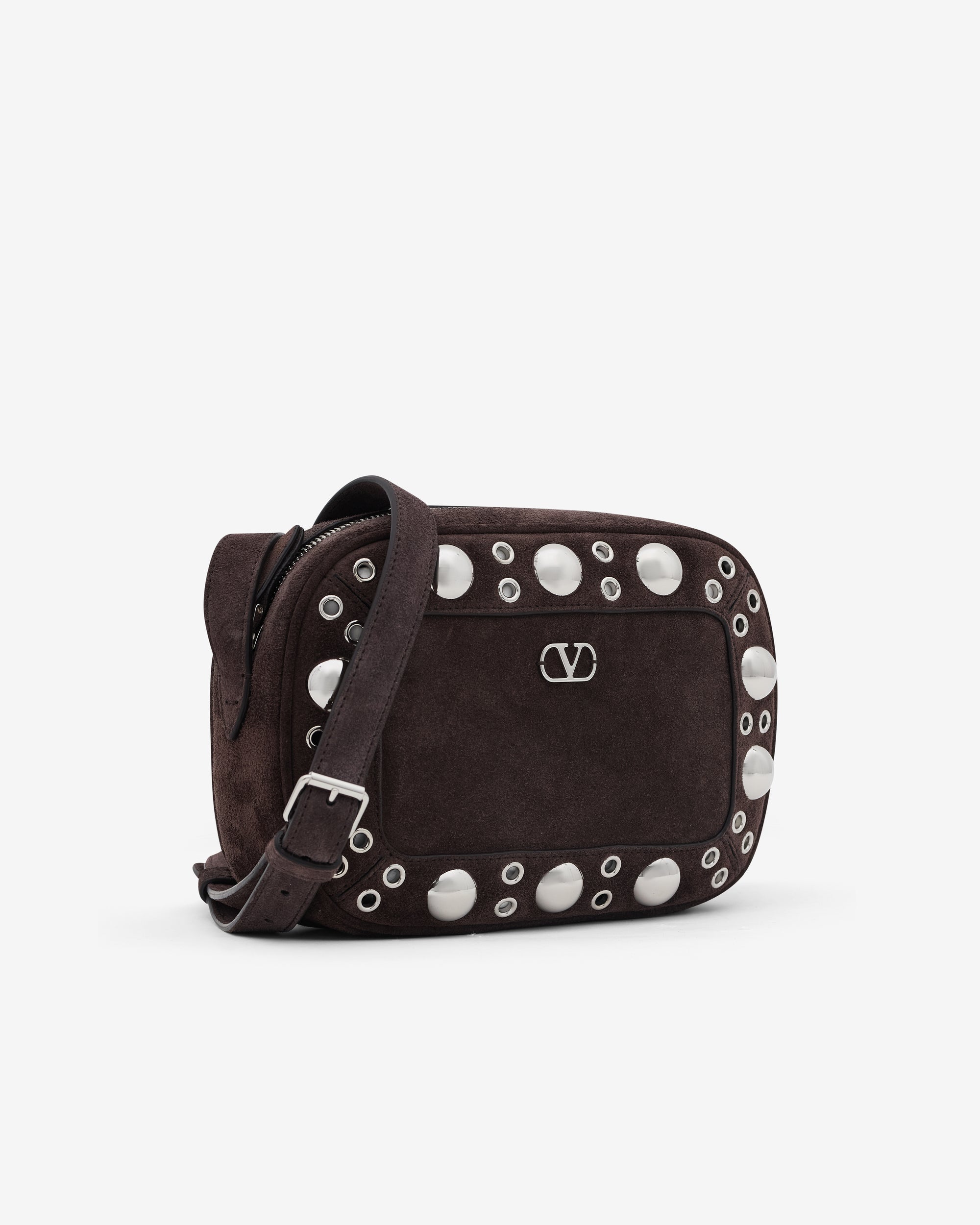 Valentino Garavani Nellcôte chain shoulder bag in suede with trim decorated with ball studs and rivets. The bag can be worn on the shoulder/cross-body thanks to the adjustable leather shoulder strap.