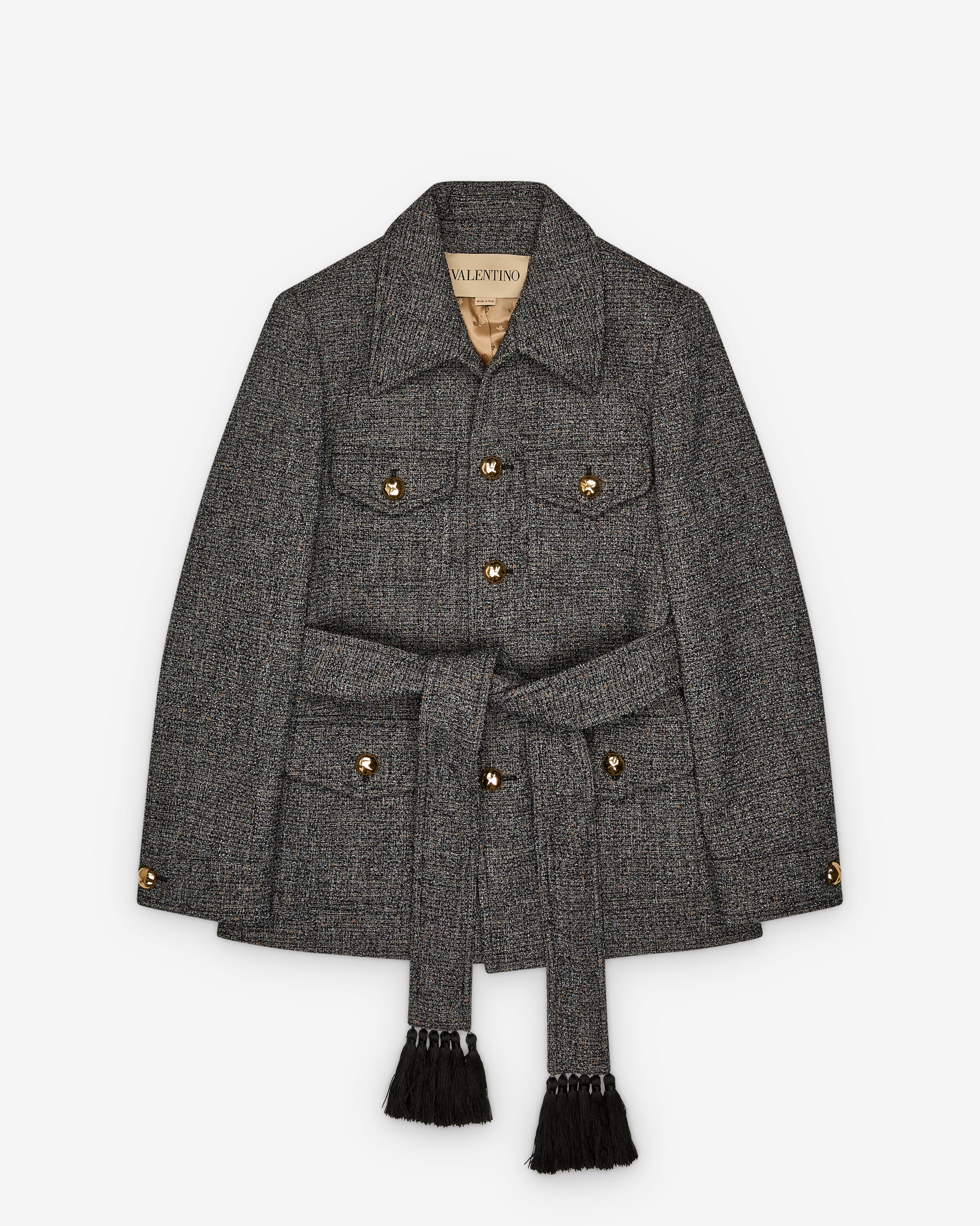 Valentino safari jacket with belt in boutonné wool Regular fit Lined Button closure and tassel belt Two front patch pockets with flap Two patch pockets with flap on the chest