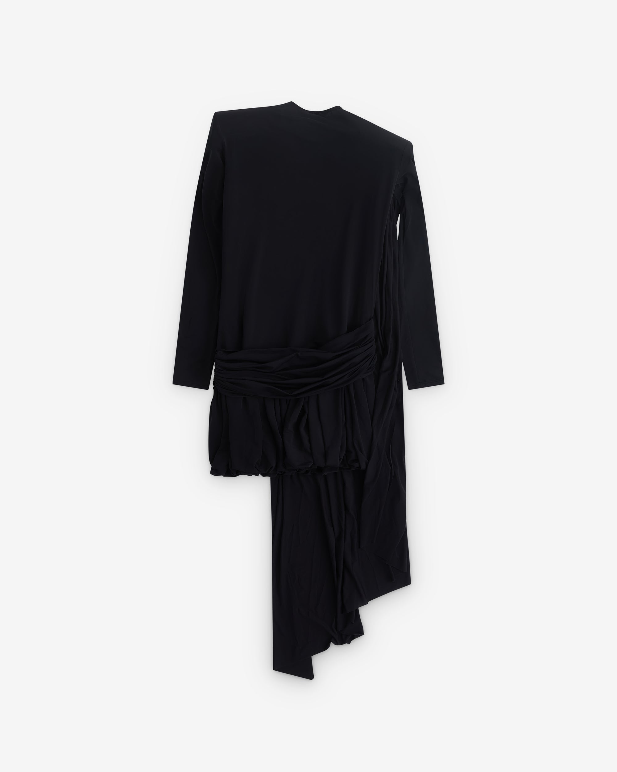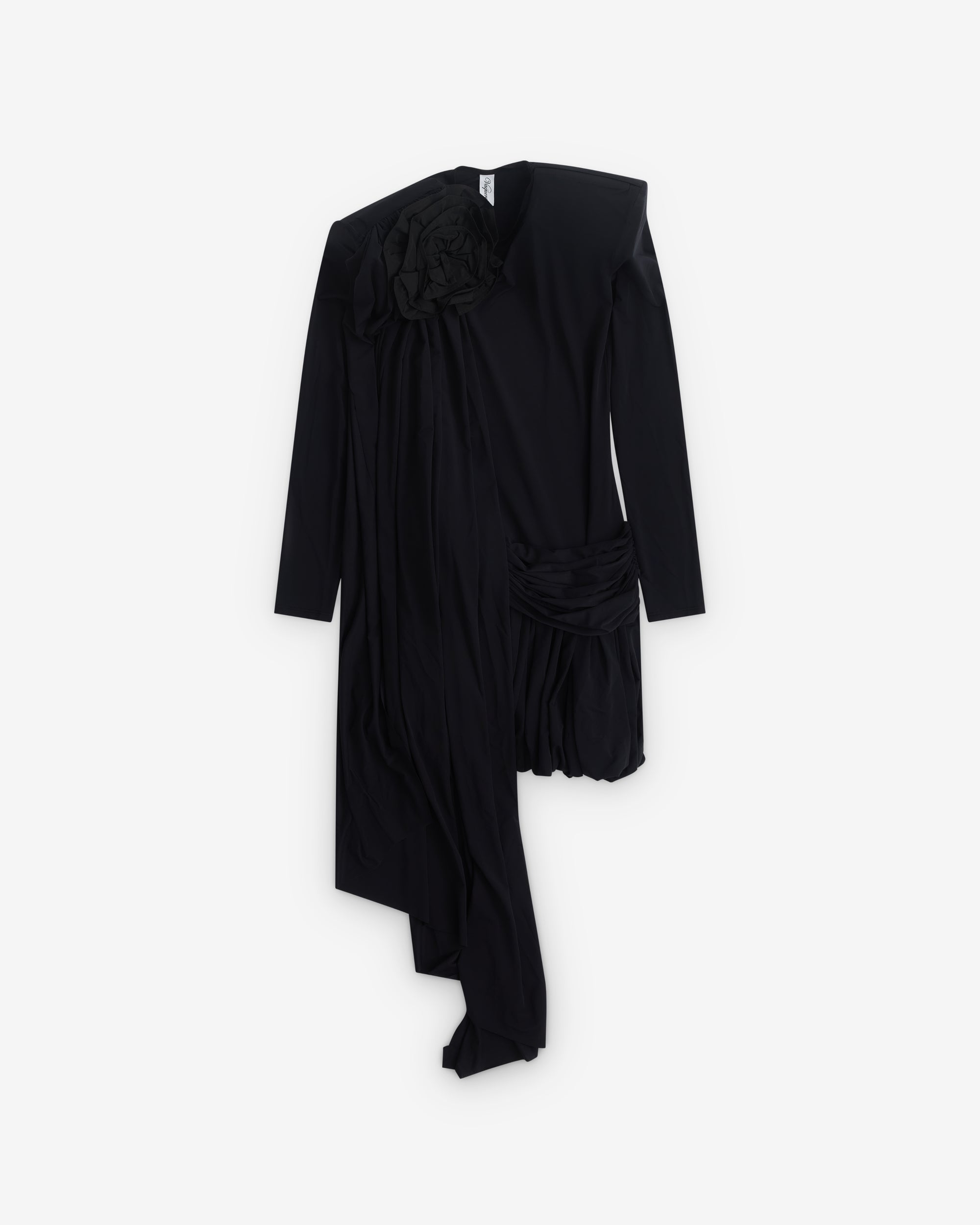 Draping throughoutApplique flower at necklineAsymmetric hemLong sleevesPadded shouldersMini-length