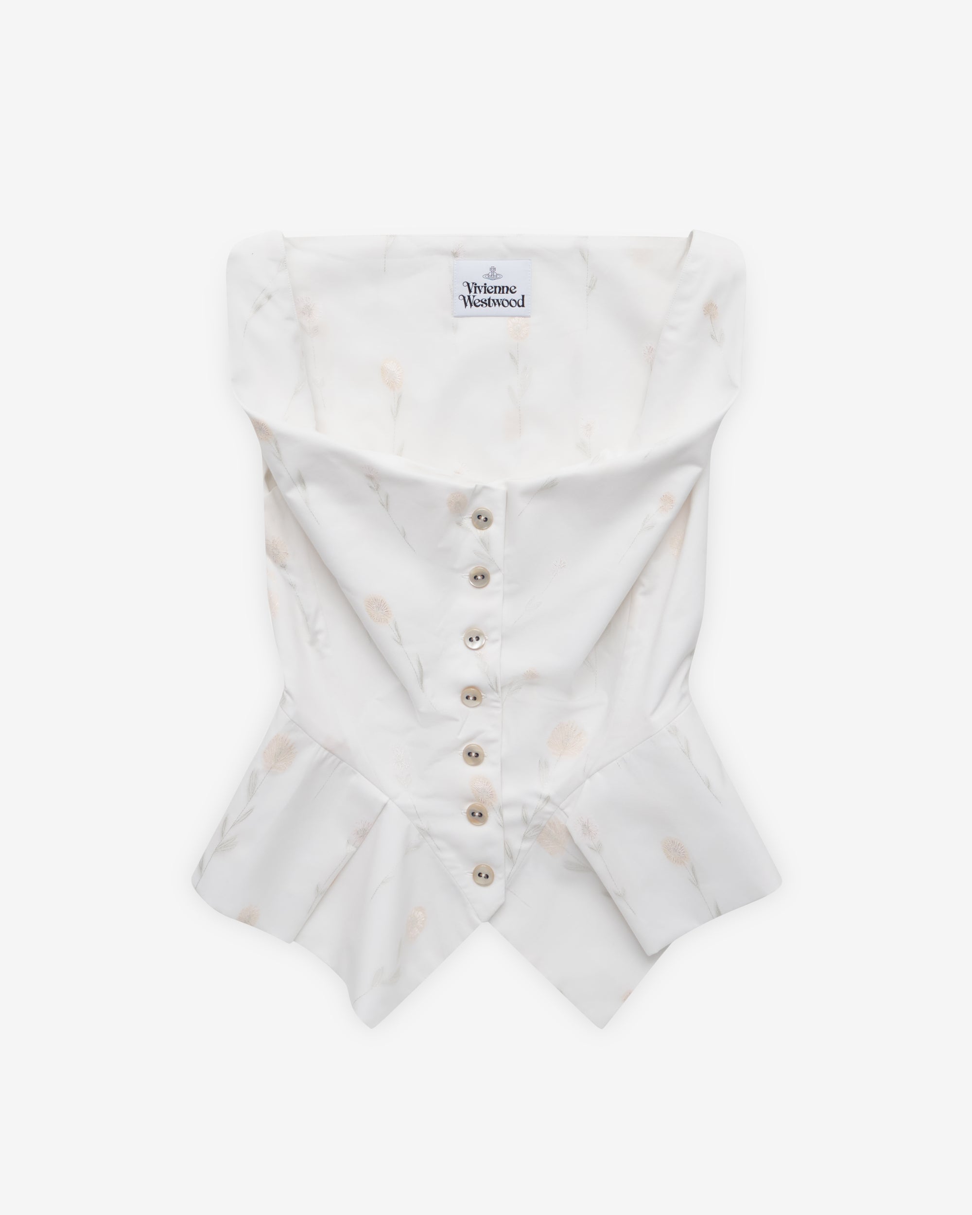 Archival silhouetteOrigami-like foldsButton front fasteningSweetheart necklineFitted bodicePleated waist extension93% Cotton, 7% ViscoseMade in Italy