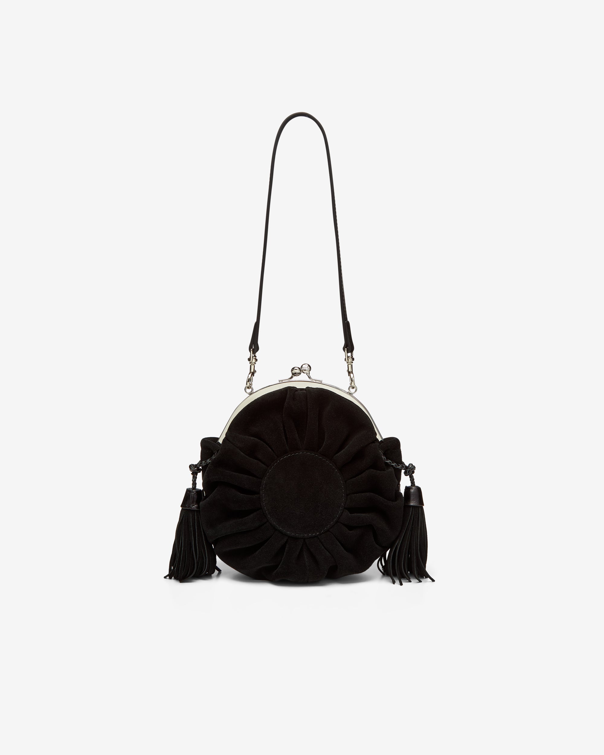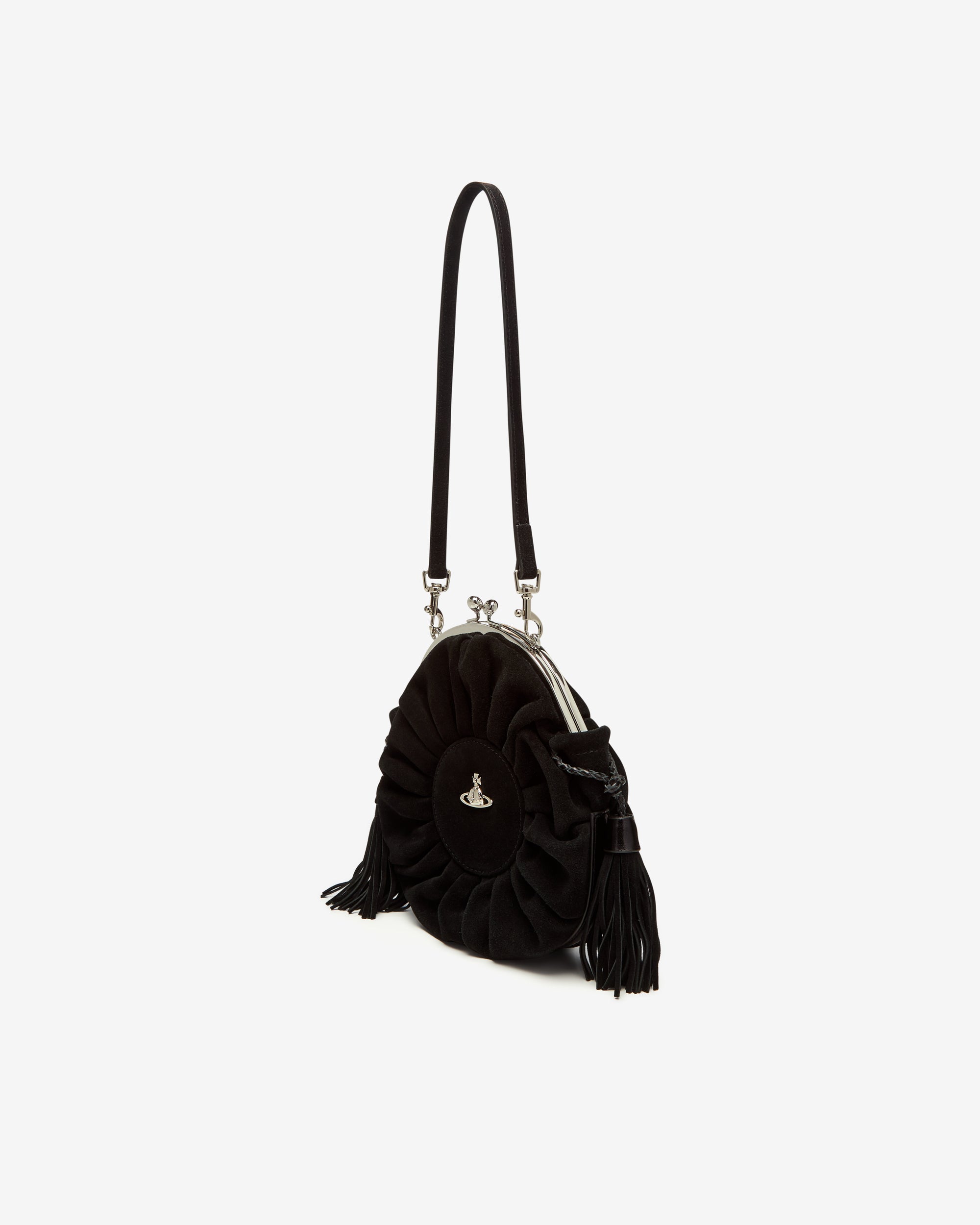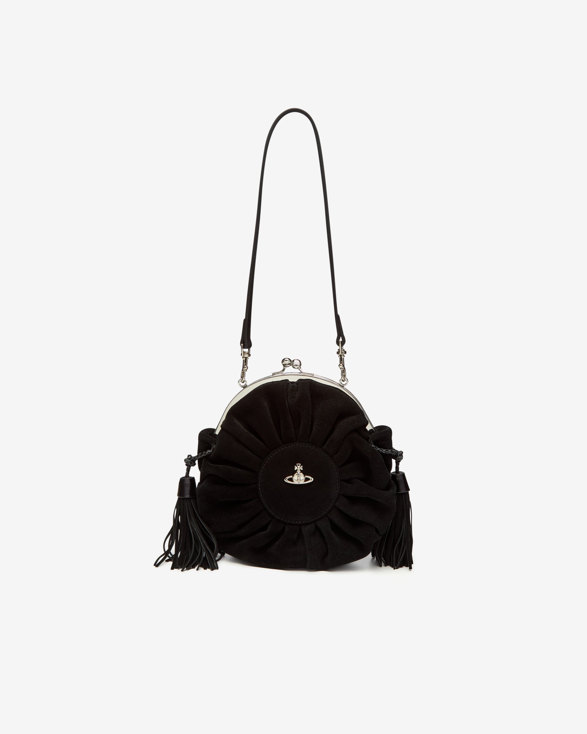 Features a kiss-lock closureSilver-tone hardwareTonal stitchingCircular silhouetteBas relief orb motif'Broken Pinstripe' interior liningTassel detailing Removable strap Height 21cm, depth 8cm100% Calf LeatherMade in China