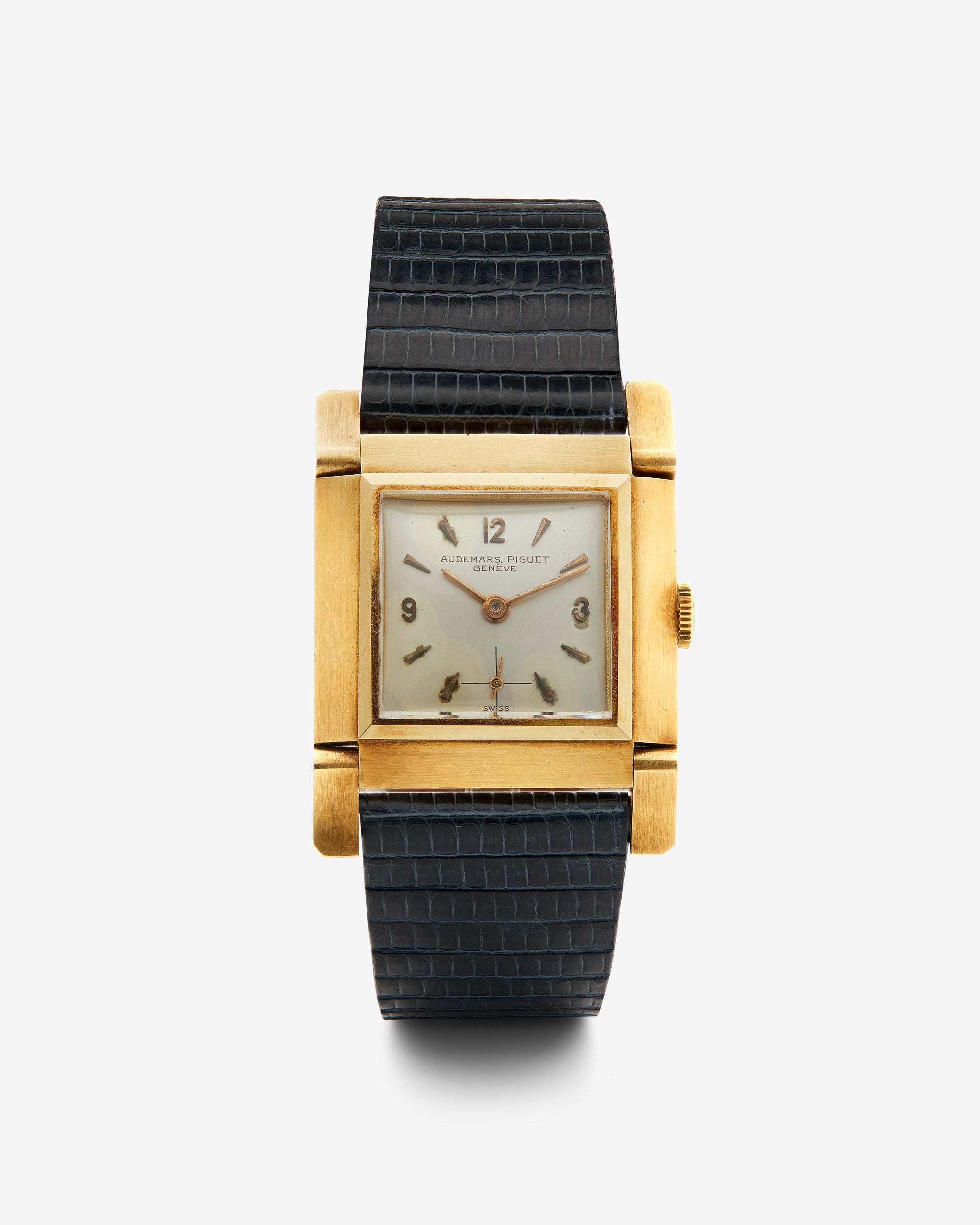 A truly unique Audemars Piguet tank from the 1950s, crafted in 18k gold with rare flexible lugs—a design detail you rarely see. This piece stands apart from typical vintage dress watches, blending elegance with an unusual construction that speaks to AP's innovative spirit.
