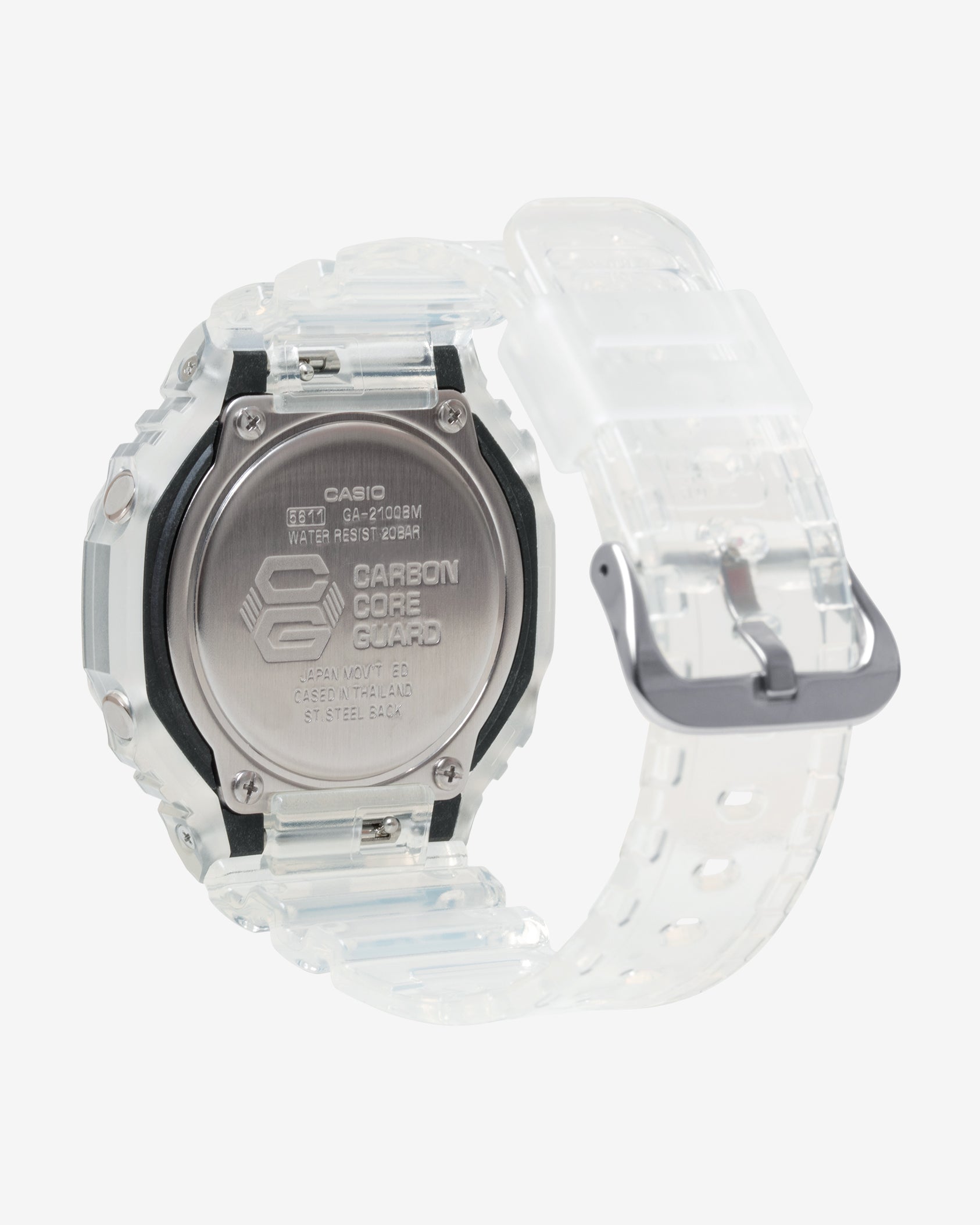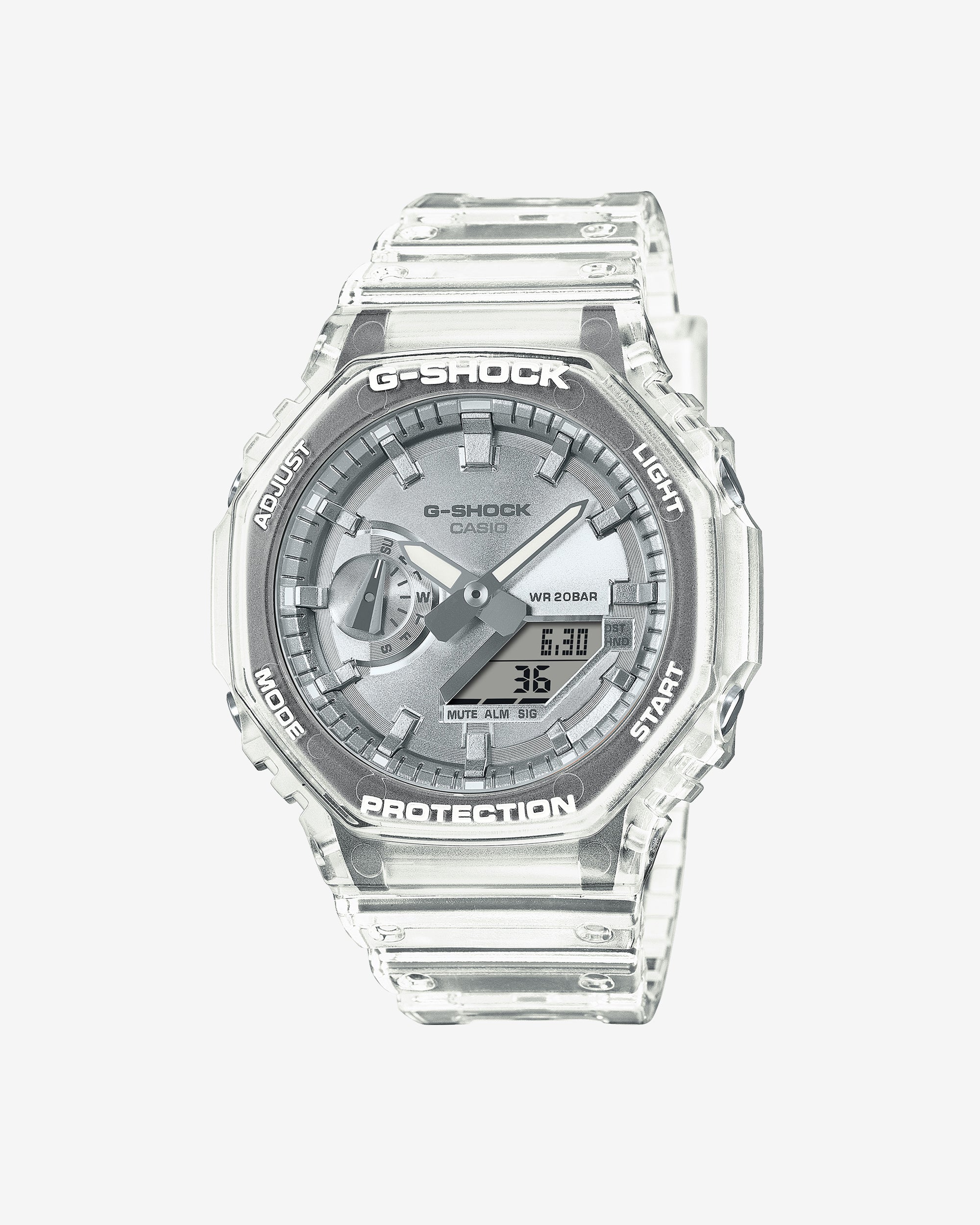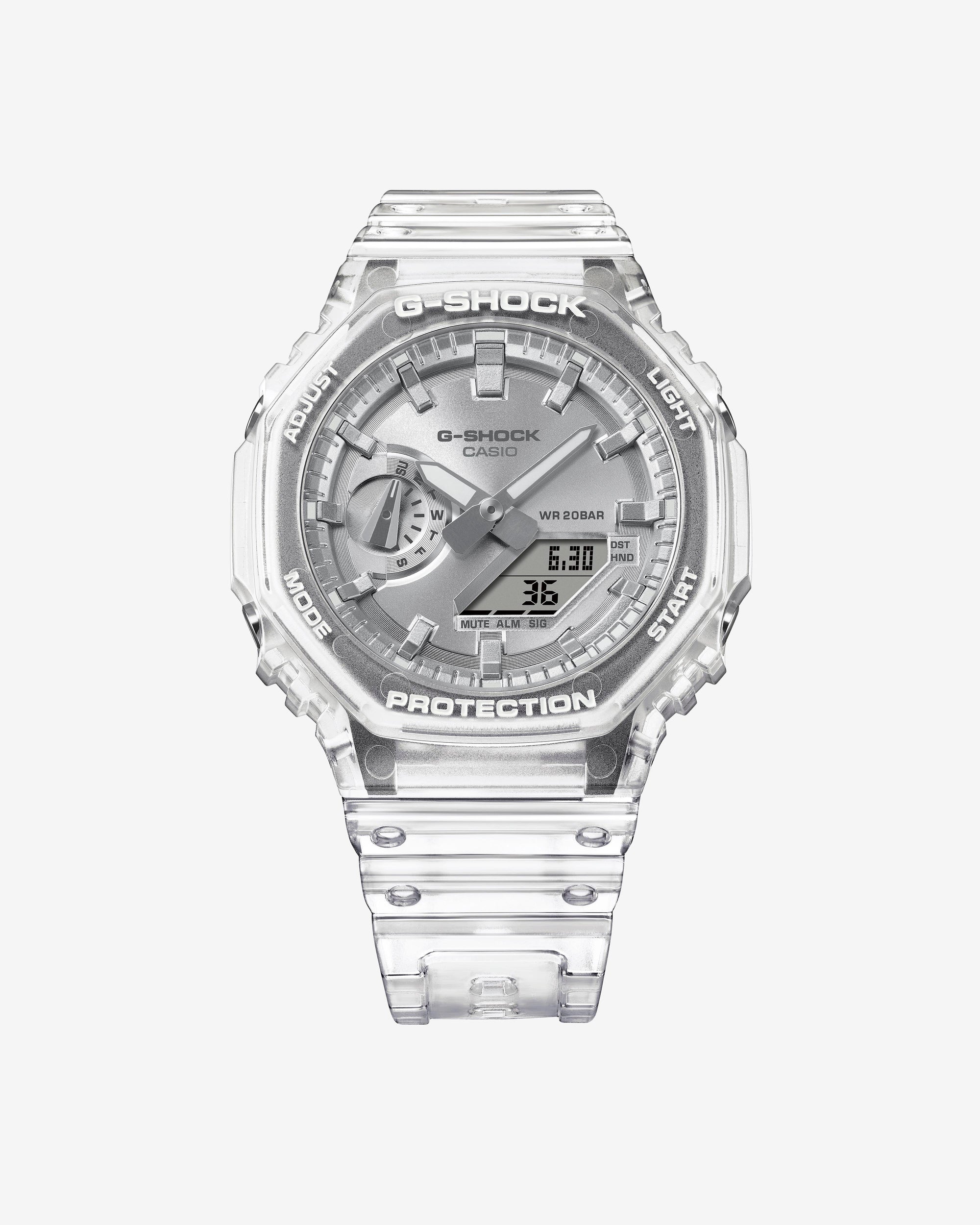 The GA2100 with octagonal bezel is paired with a dial finished in metallic vapor deposition in popular color — silver — offset by a translucent band for a confidently cool look.
