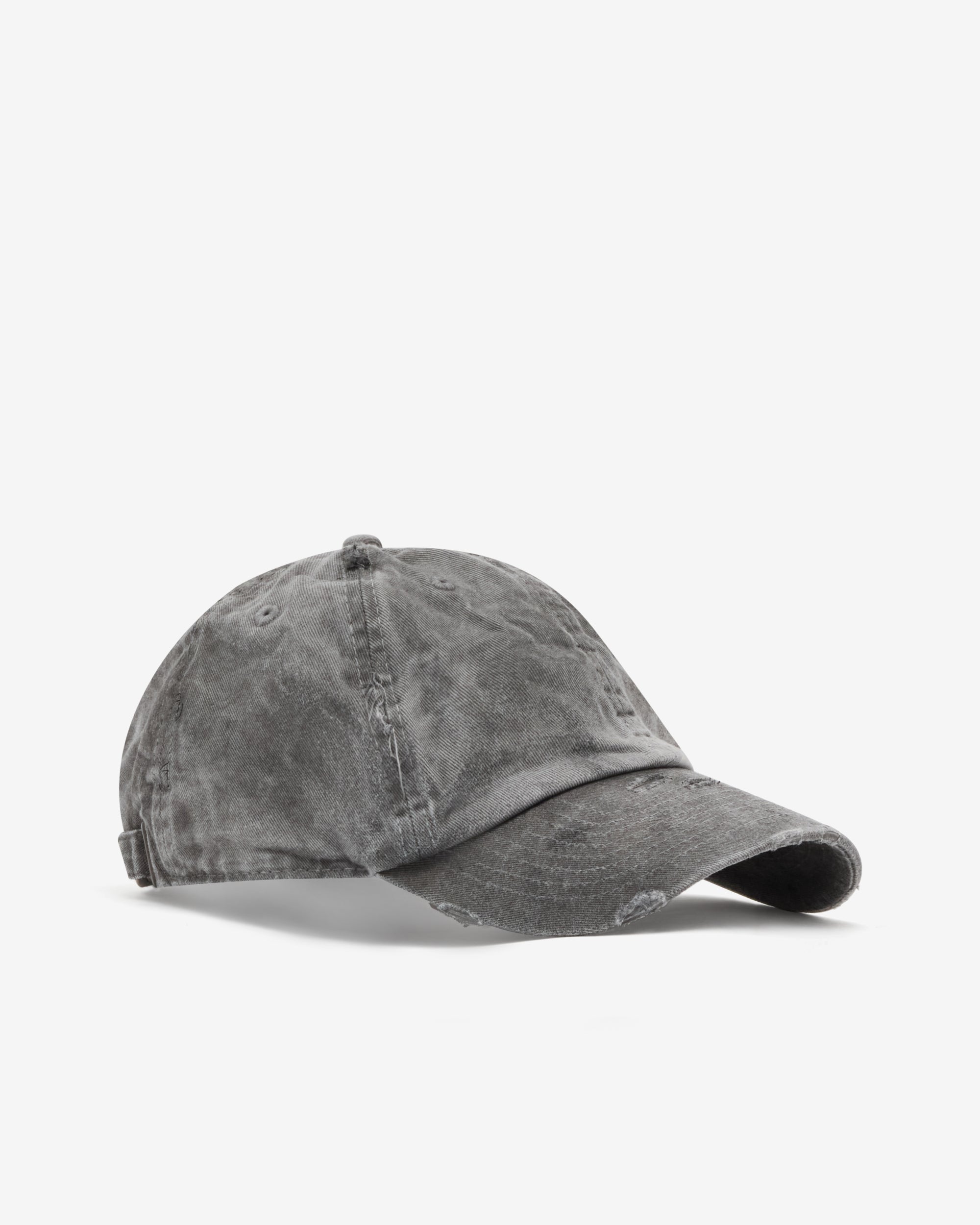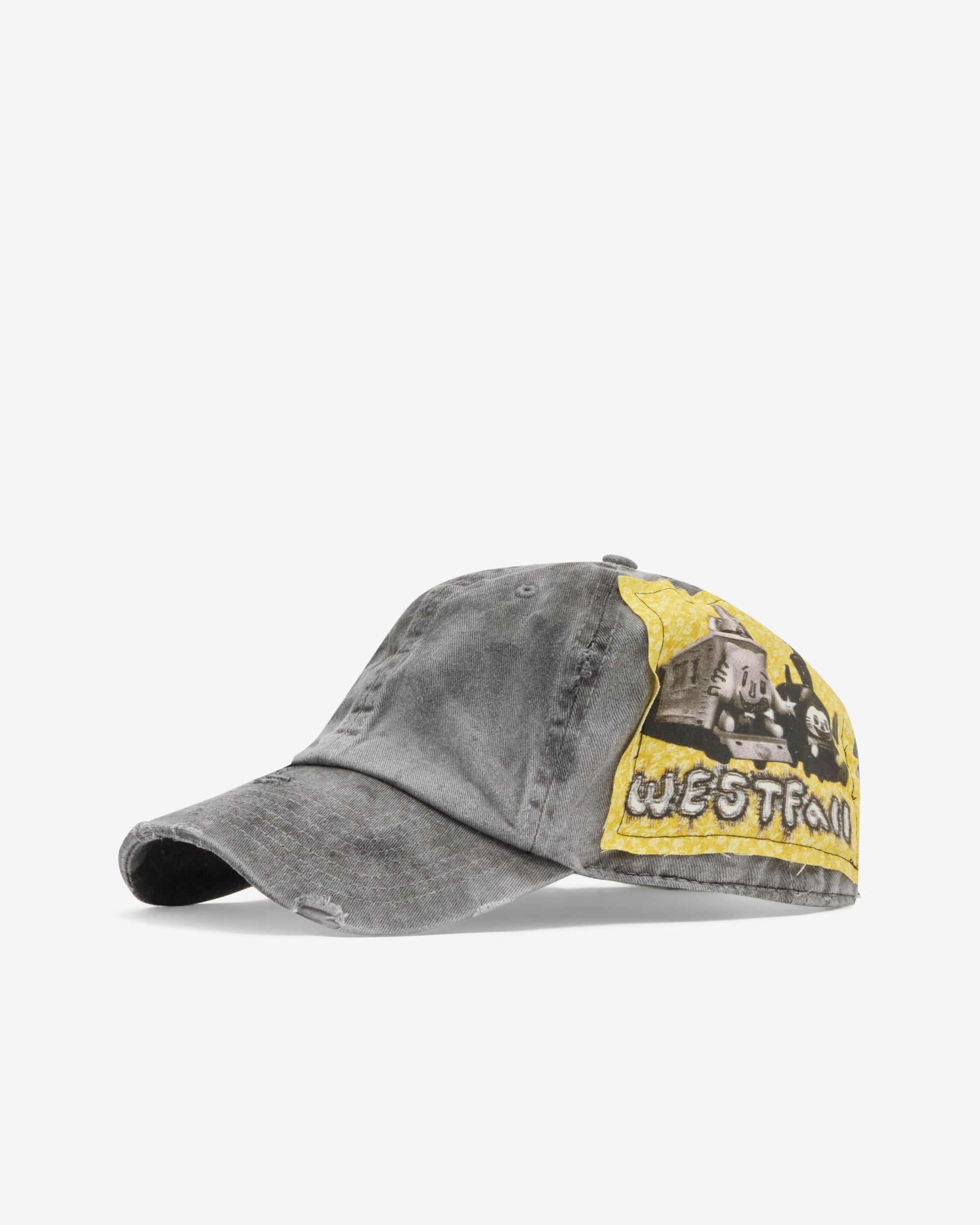 Curved brim6 panel construction Distressed fabric Adjustable back strapStitched graphic patch at side