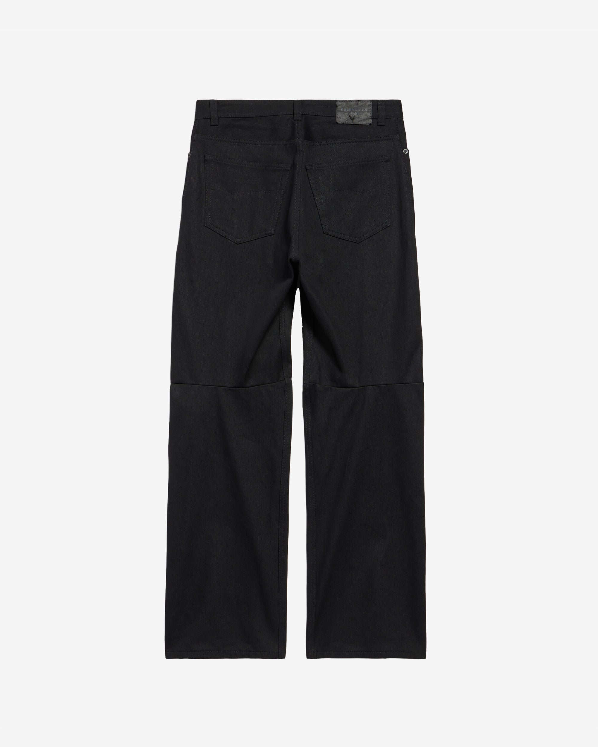 Cotton denimMid-waistCovered button fly5 pockets5 belt loopsTone-on-tone yoke behind the kneeBalenciaga engraved flex buttonBalenciaga Jeans patch at back with worn-out effect100% CottonMade in Japan