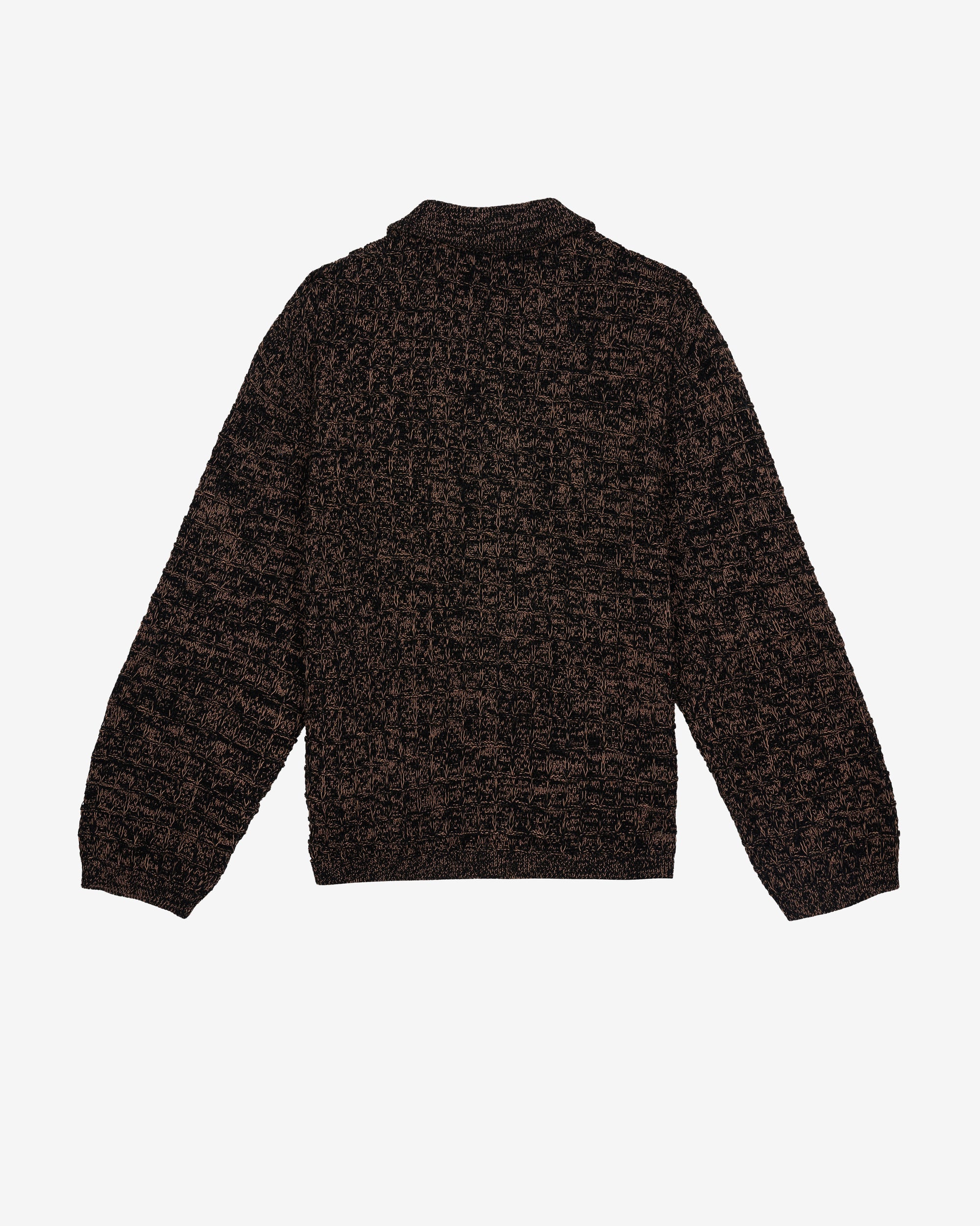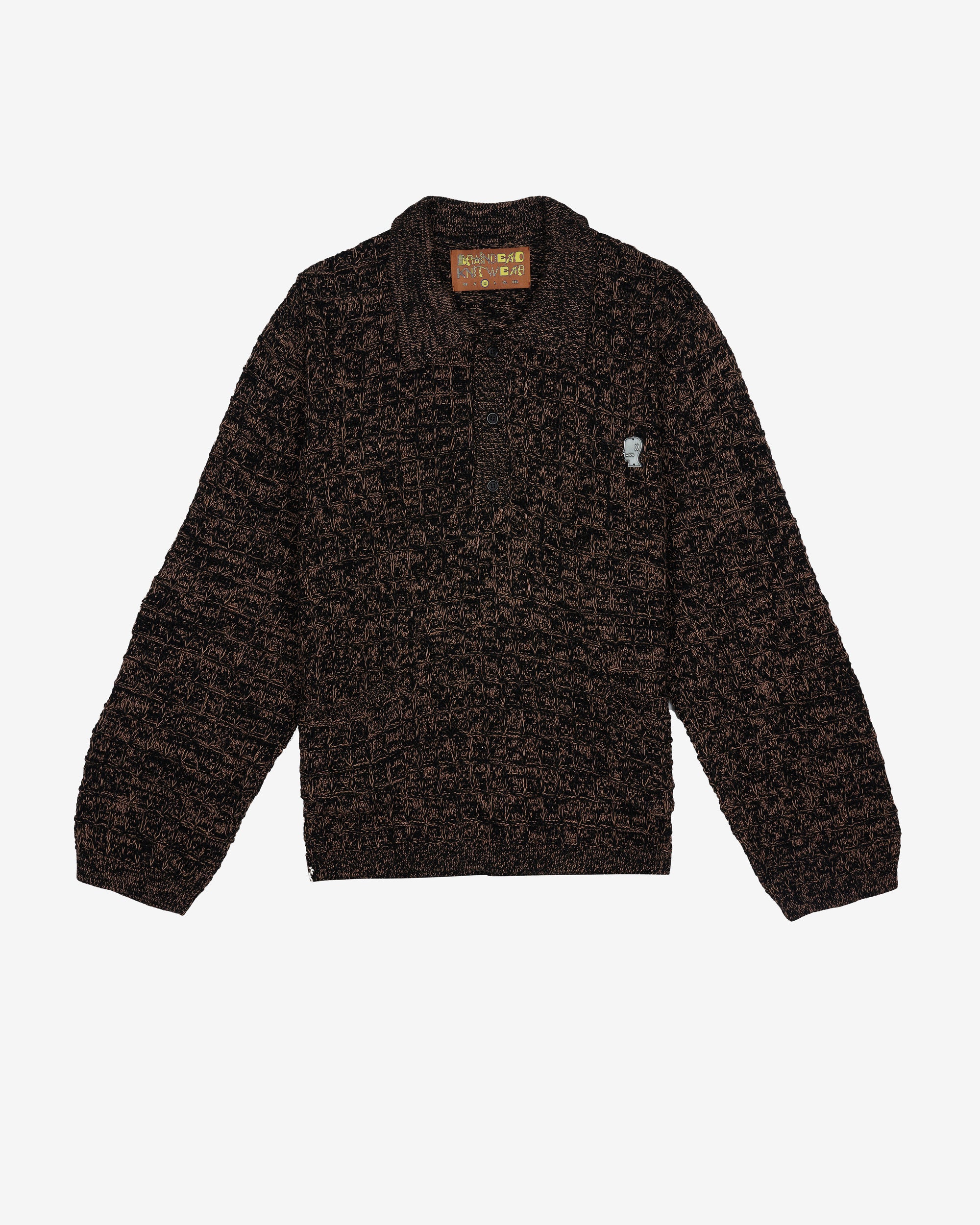Lightweight marled knit long sleeve pullover. Features a partial button-front and collar, two front pockets, and a metal lapel logohead.100% Pima CottonMade in Peru