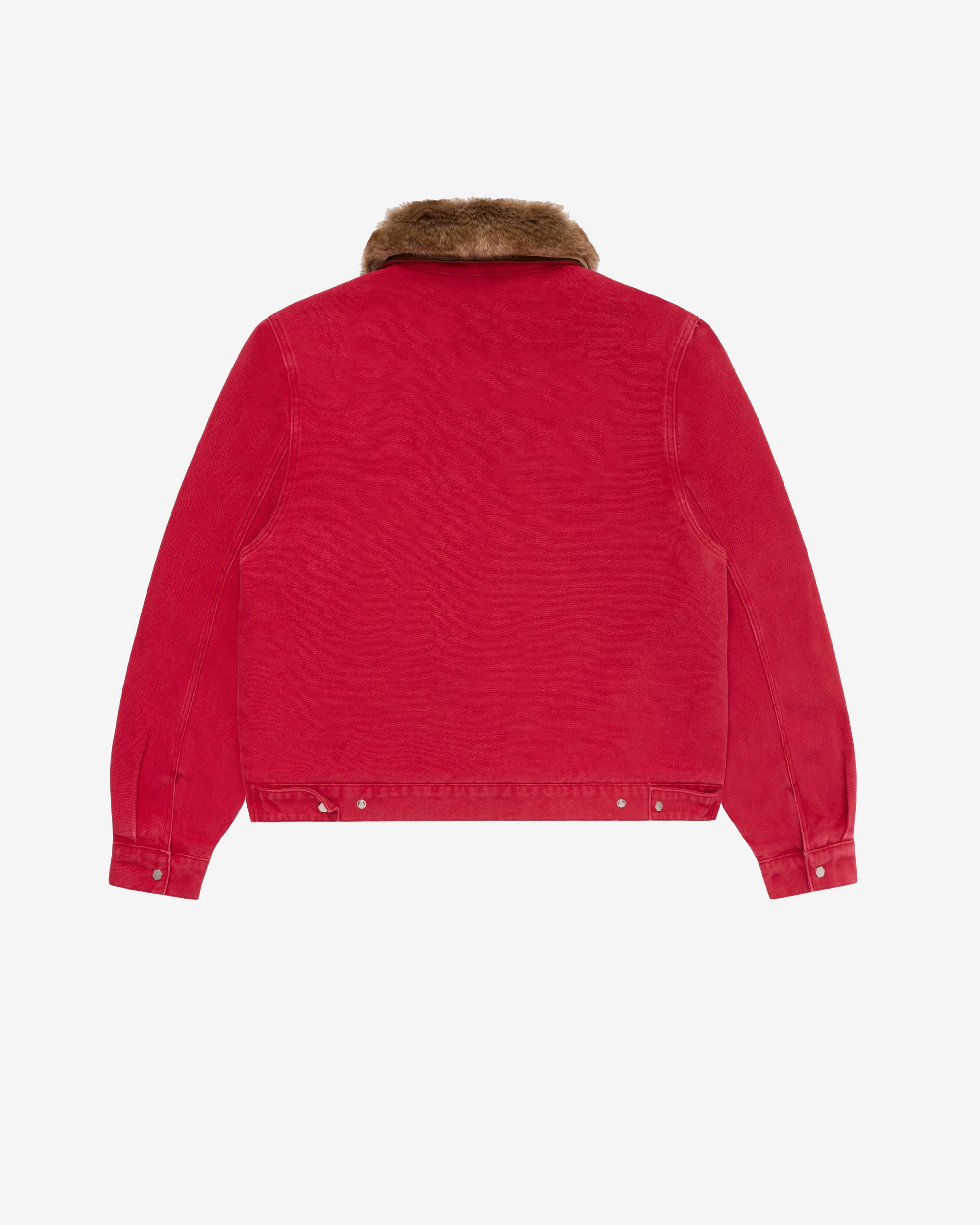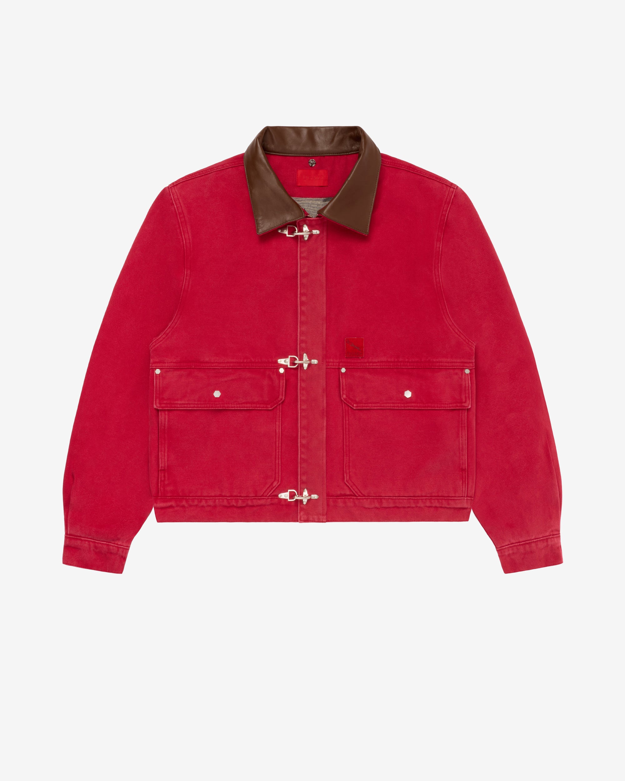 Leather collar with detachable furFireman clasp closureFront flap close patch pocketsLogo patch at frontBoxy fitButton close cuffs