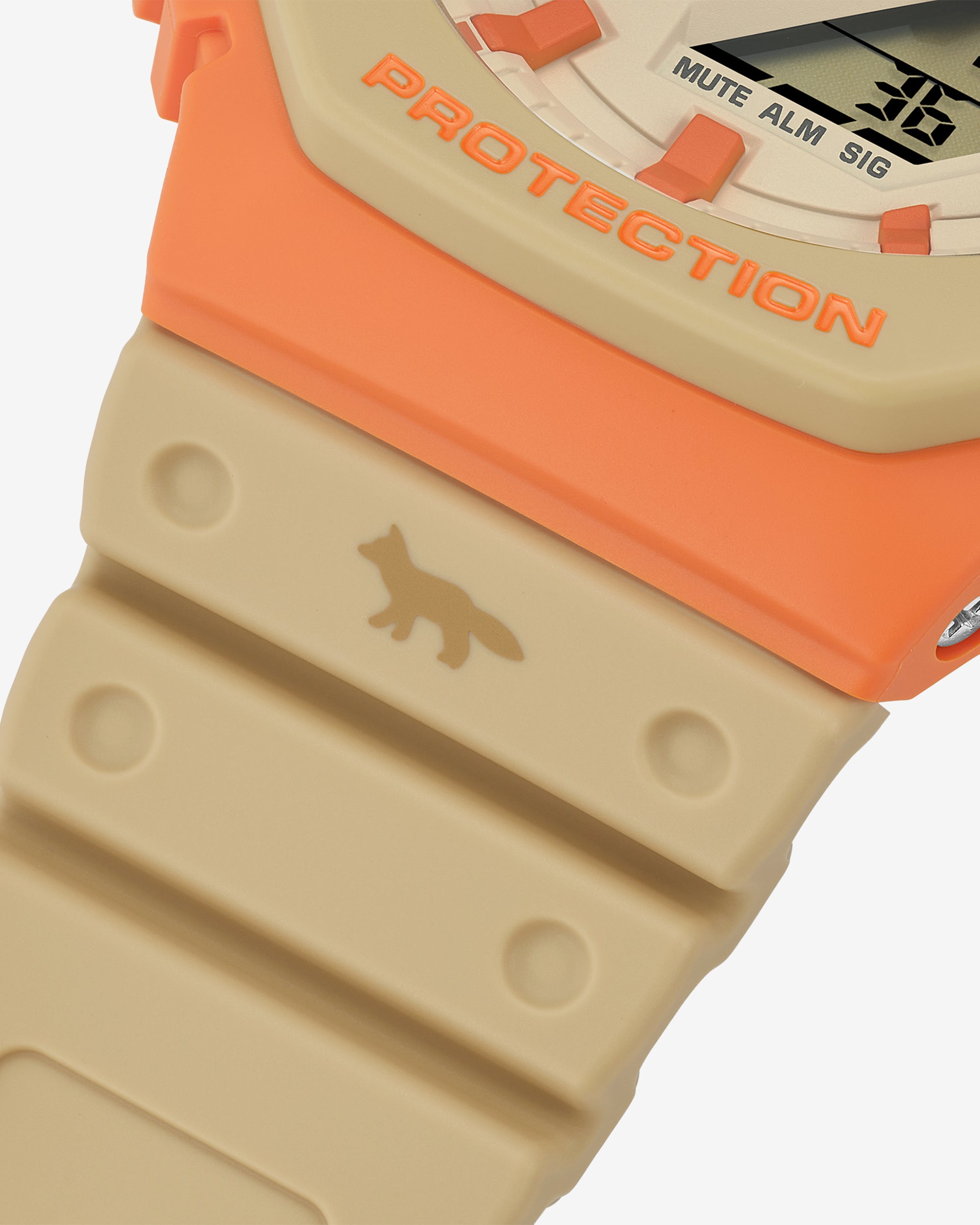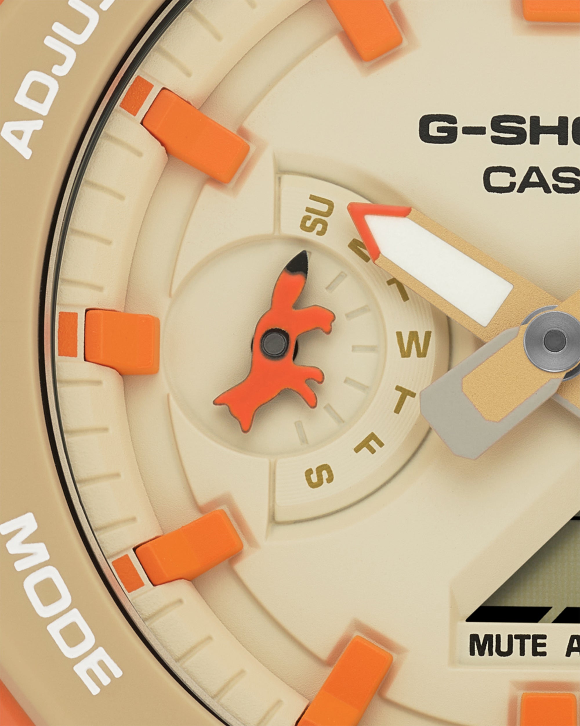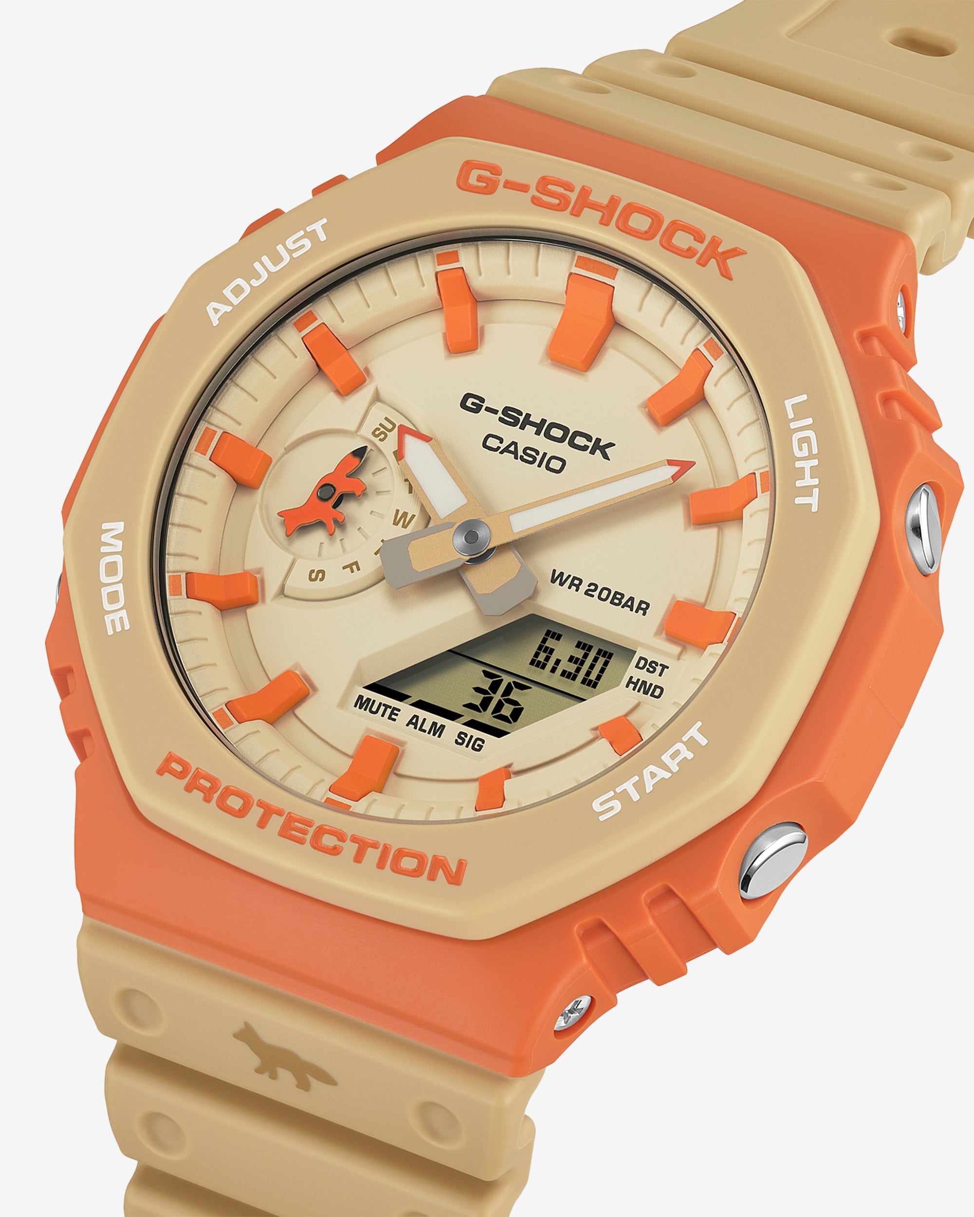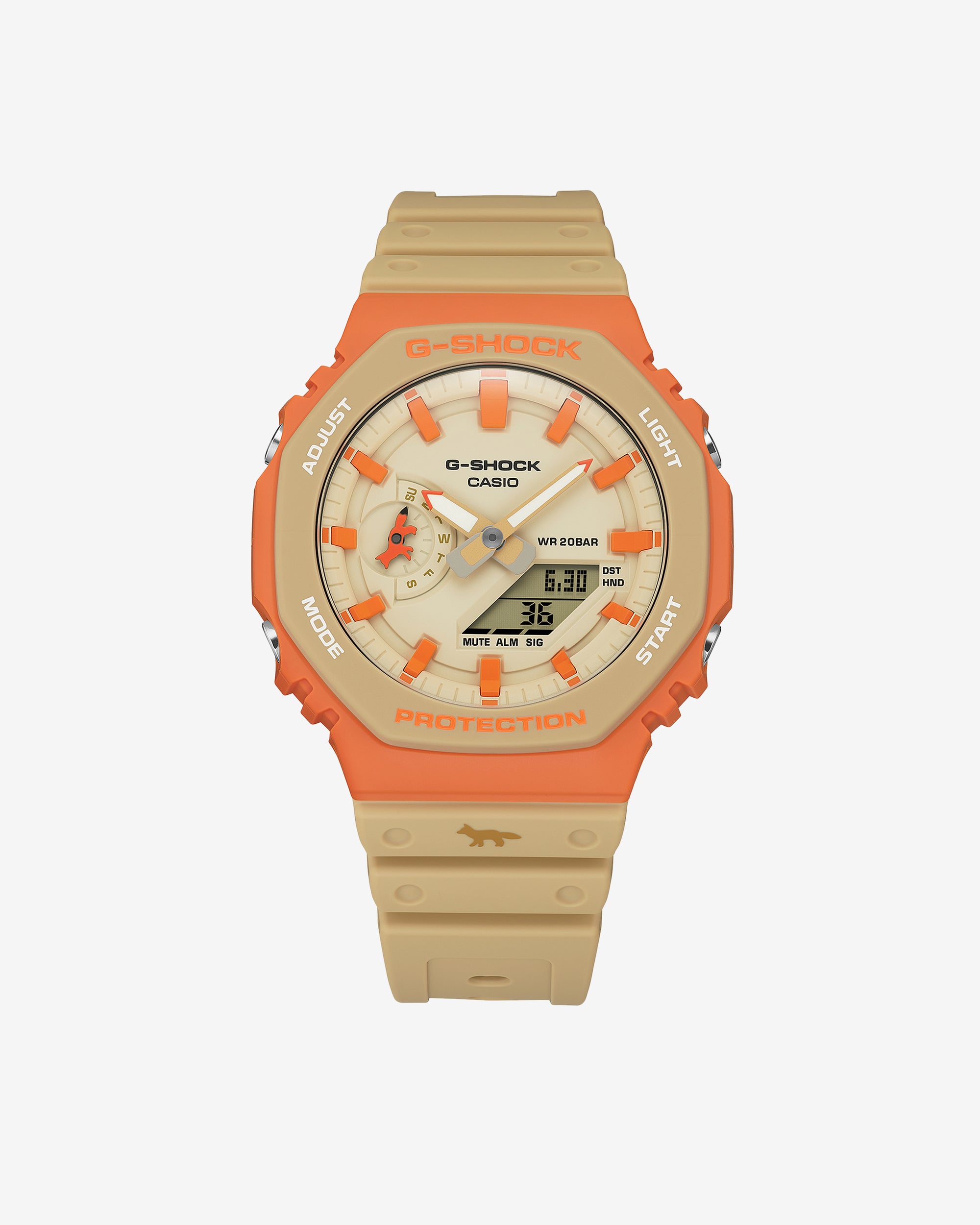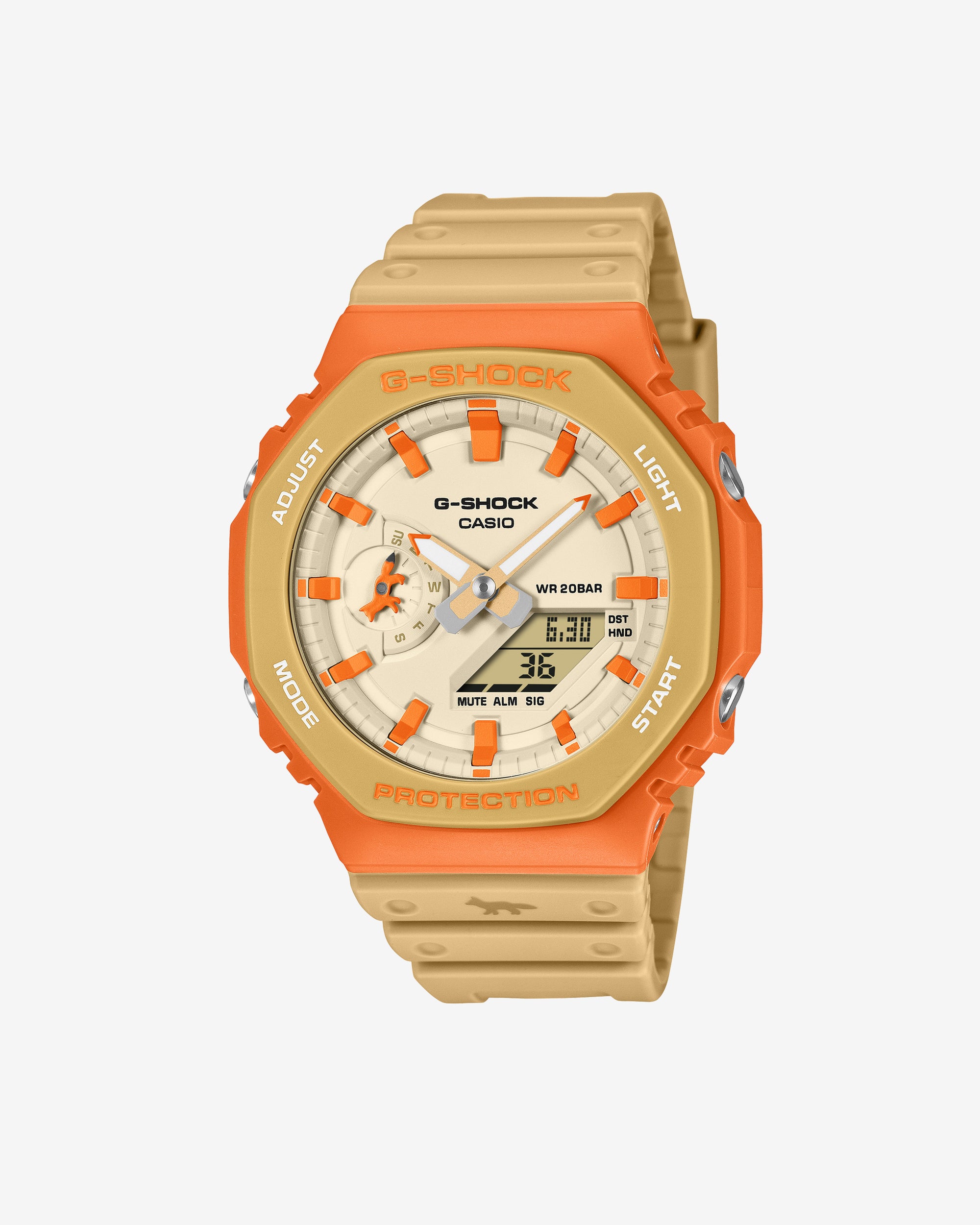 The GA-2100, a rising star on the streetwear scene, takes on a natural and neutral camaieu color scheme inspired by Haussmannian architecture, accented with a bold orange bezel that evokes the glow of the setting sun over the Paris skyline.