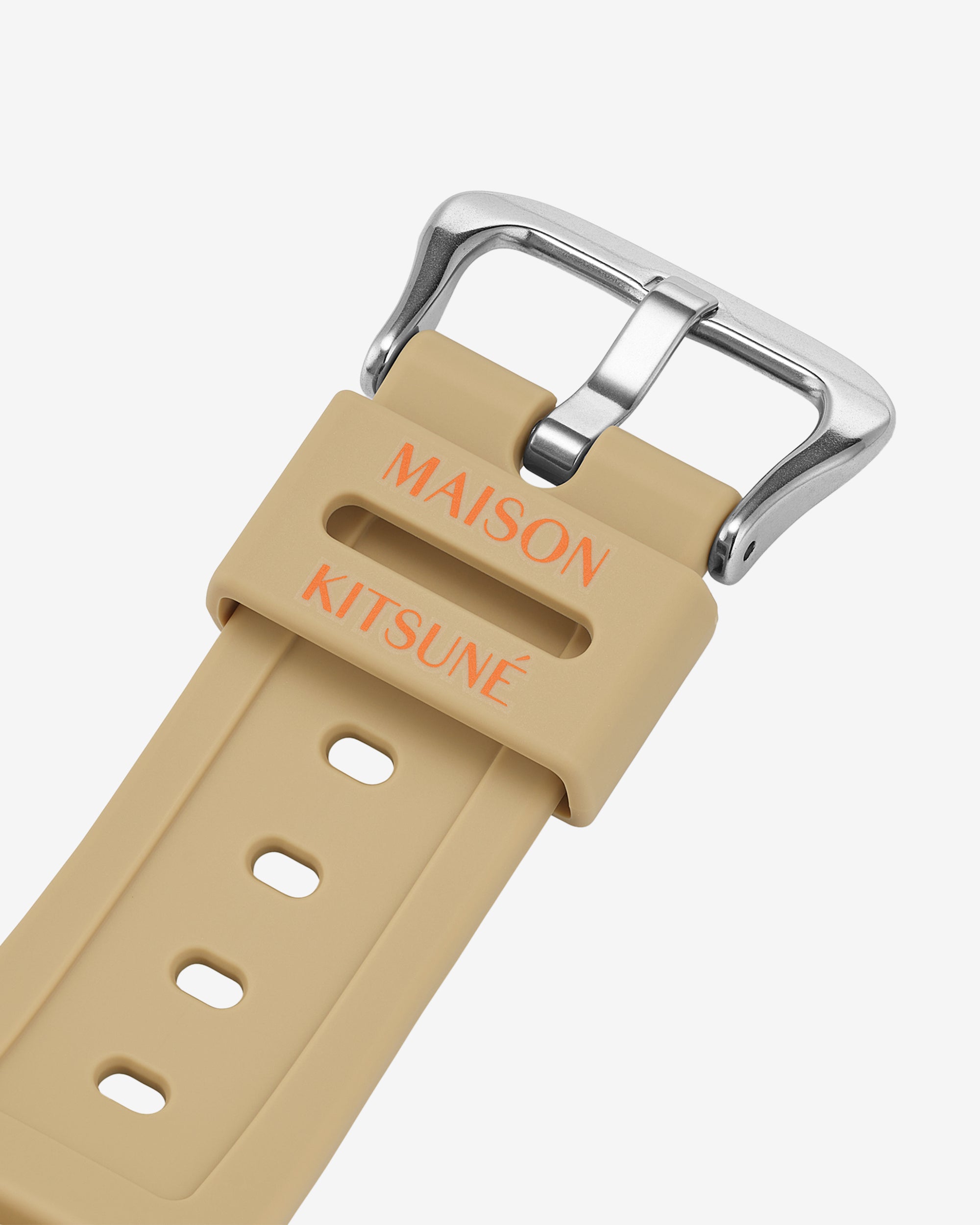 In an artful nod to the Maison Kitsuné brand iconic symbol, a fox appears as the indicator on the inset dial at the 9 o’clock and at the base where the band meets the case. The band loop and case back both feature the fashion brand’s logo, as well.