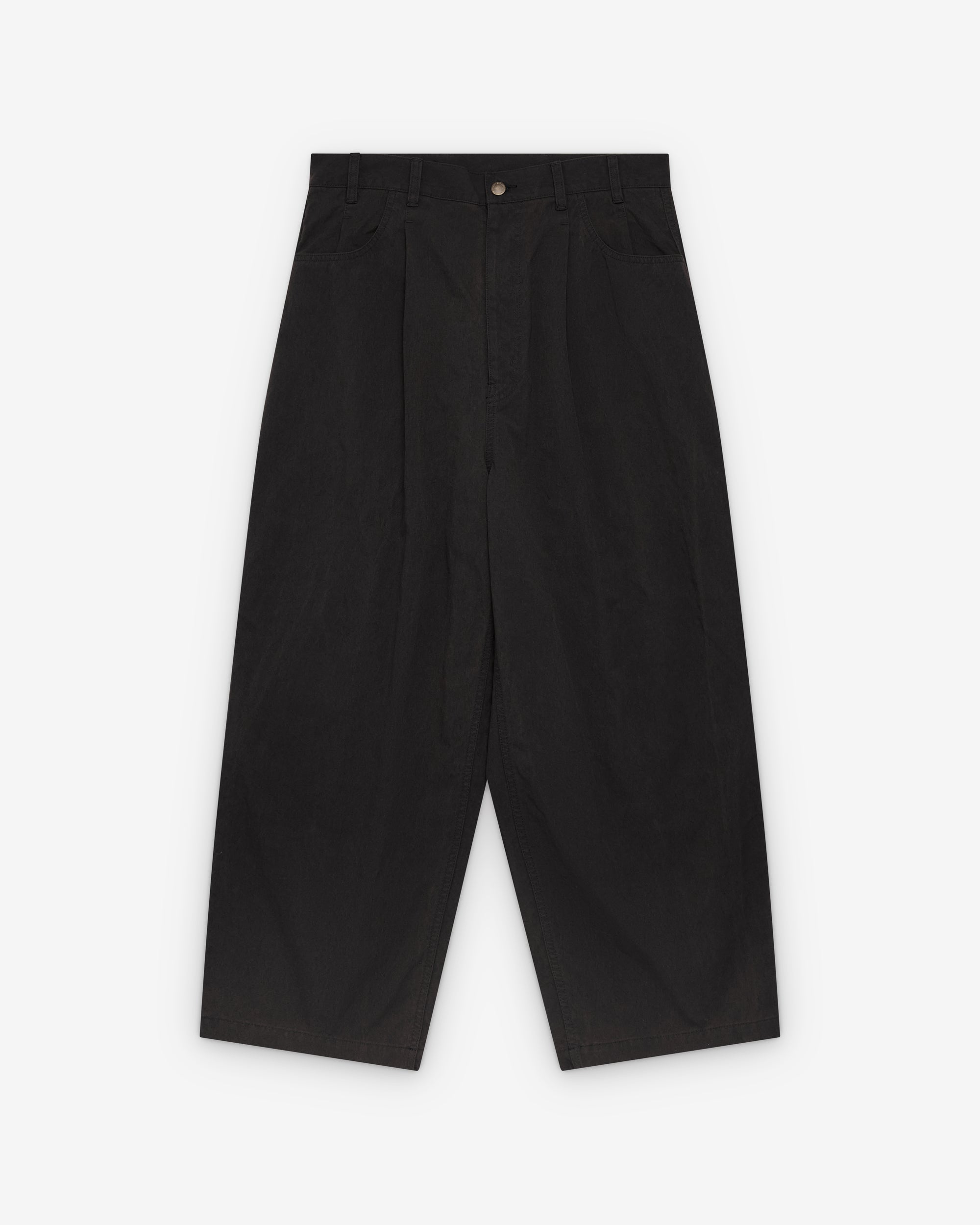 Button waist, zip flyWide fitFront and back pocketsDual front pleats