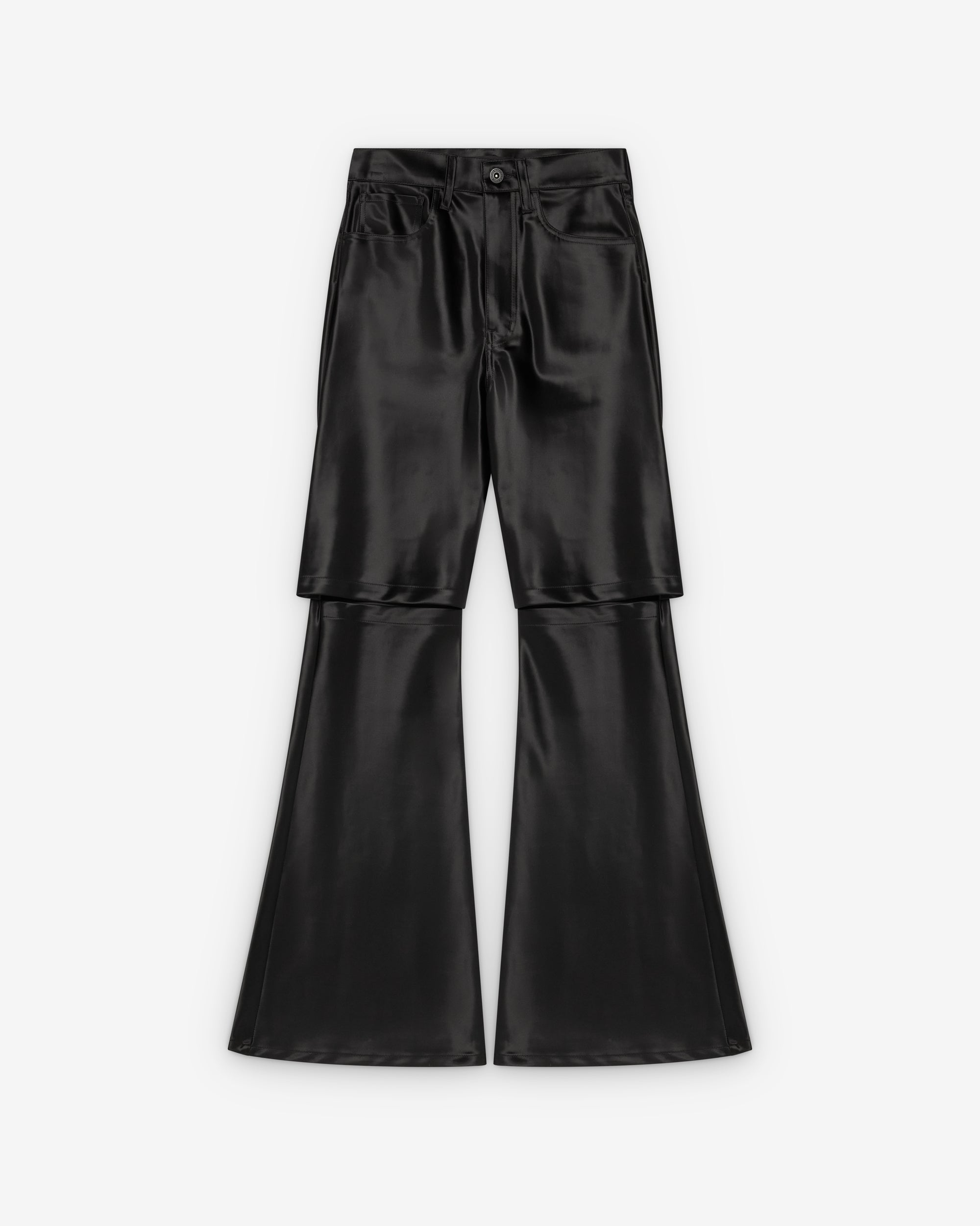 Button waist, zip flyFlared cutCut out at kneeFive pocket construction