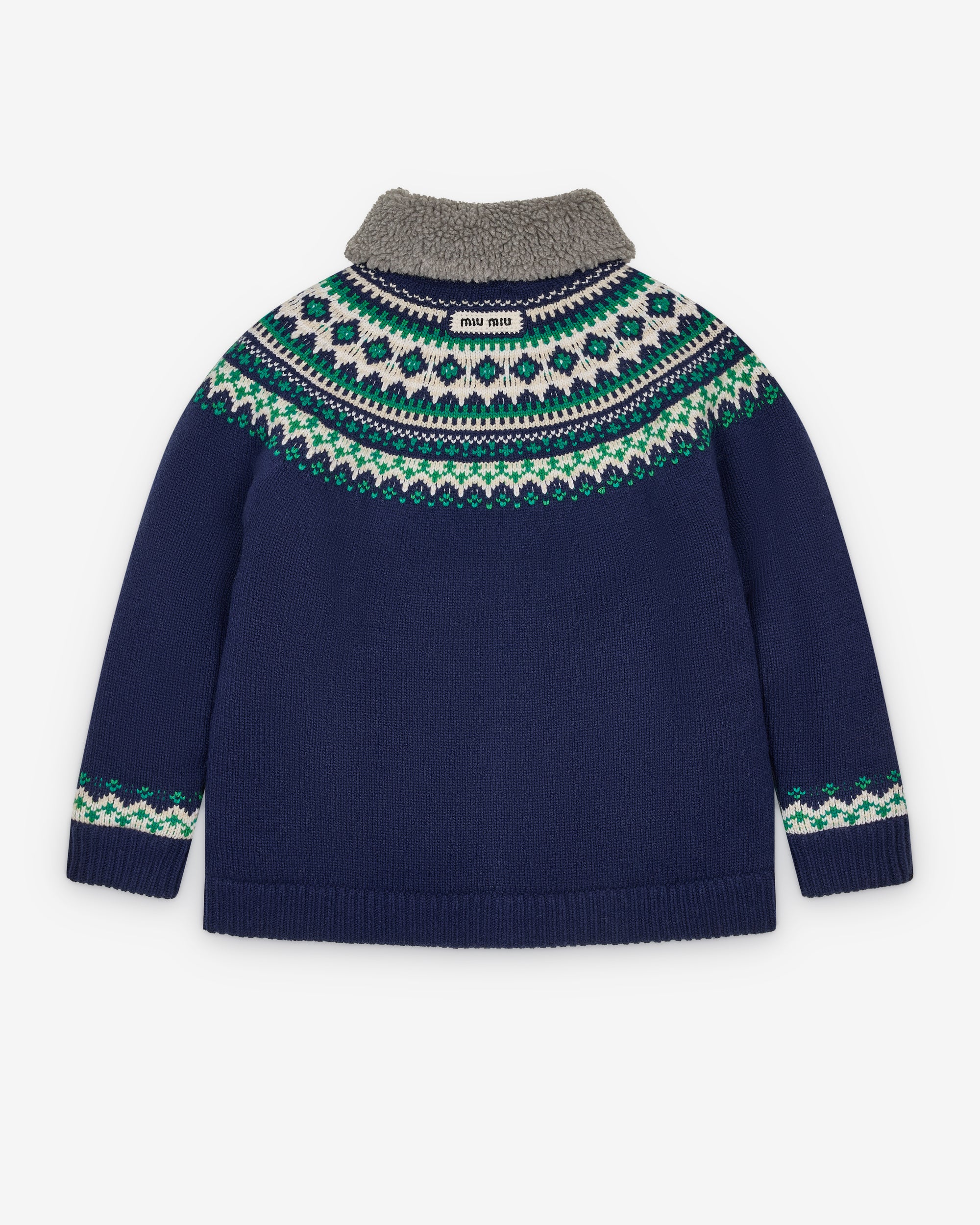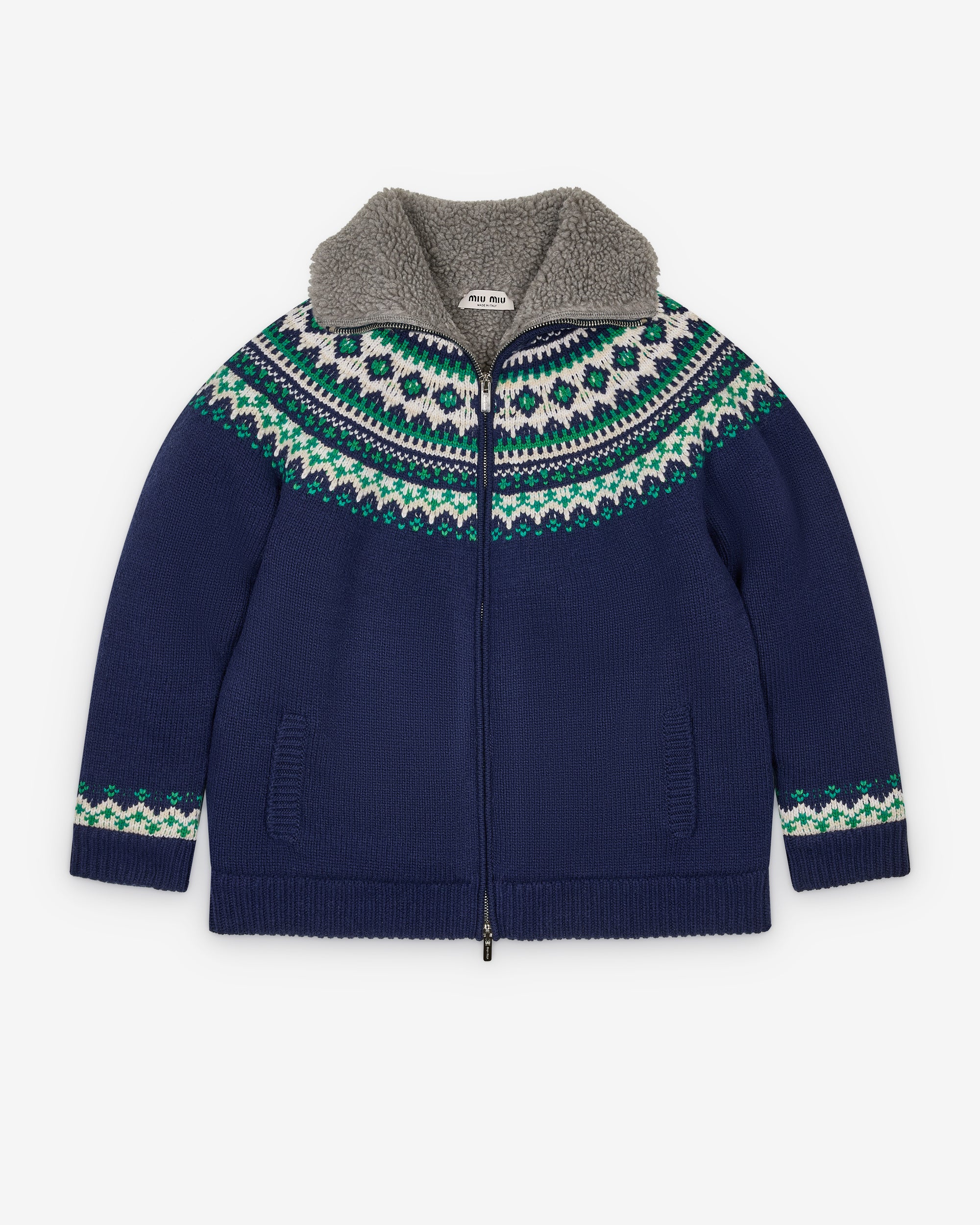 Jacquard knitOversized fitFleece linedRibbed knit crew neckLong sleevesRibbed knit cuffs and hemFront zipper closureSide pocketsKnit logo patchSeamless garmentCrochet logo patch100% Virgin WoolMade in Italy