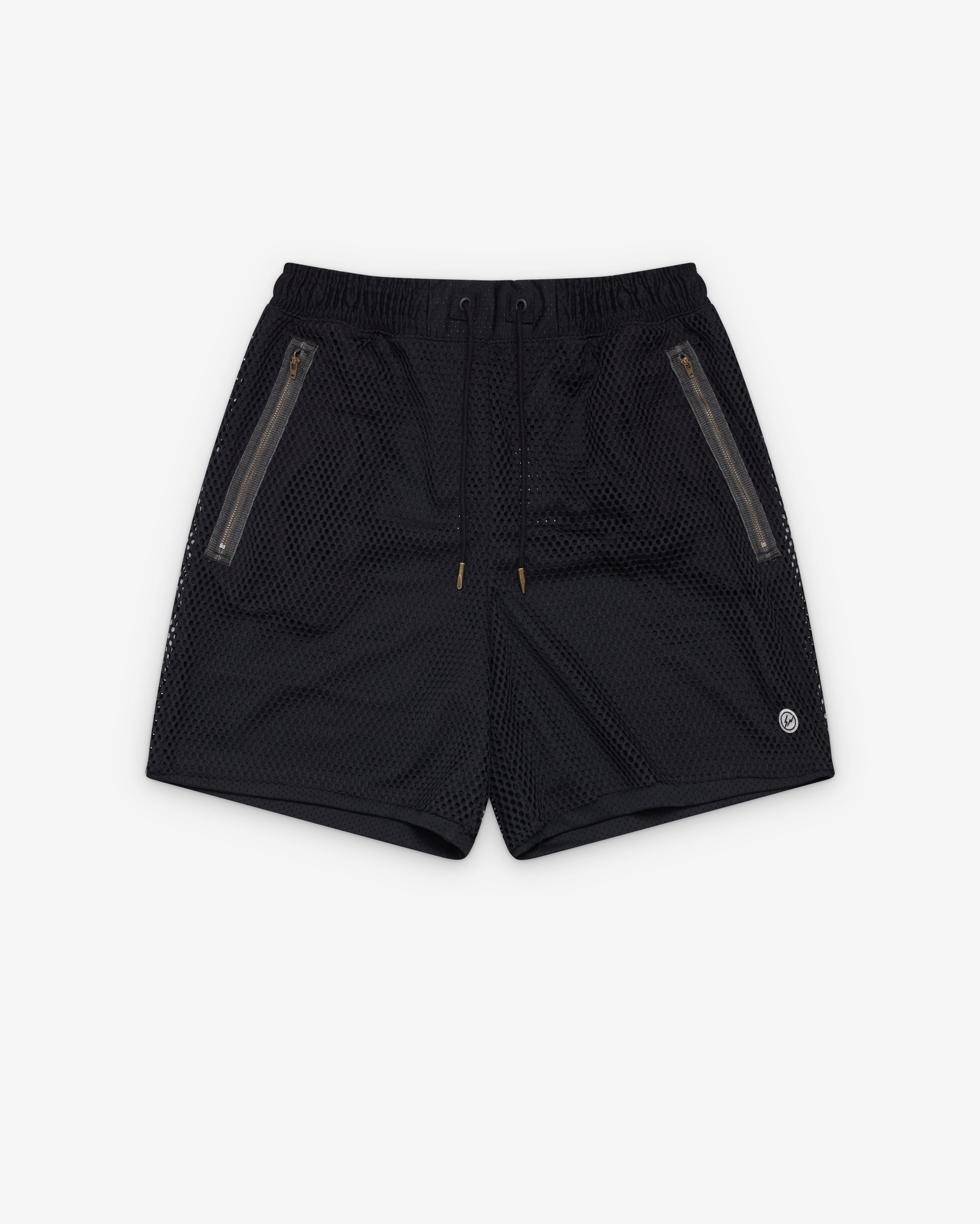 Elasticated drawstring waist bandZip front pocketsEmbroidered graphicsThigh lengthMesh fabricInternal lining