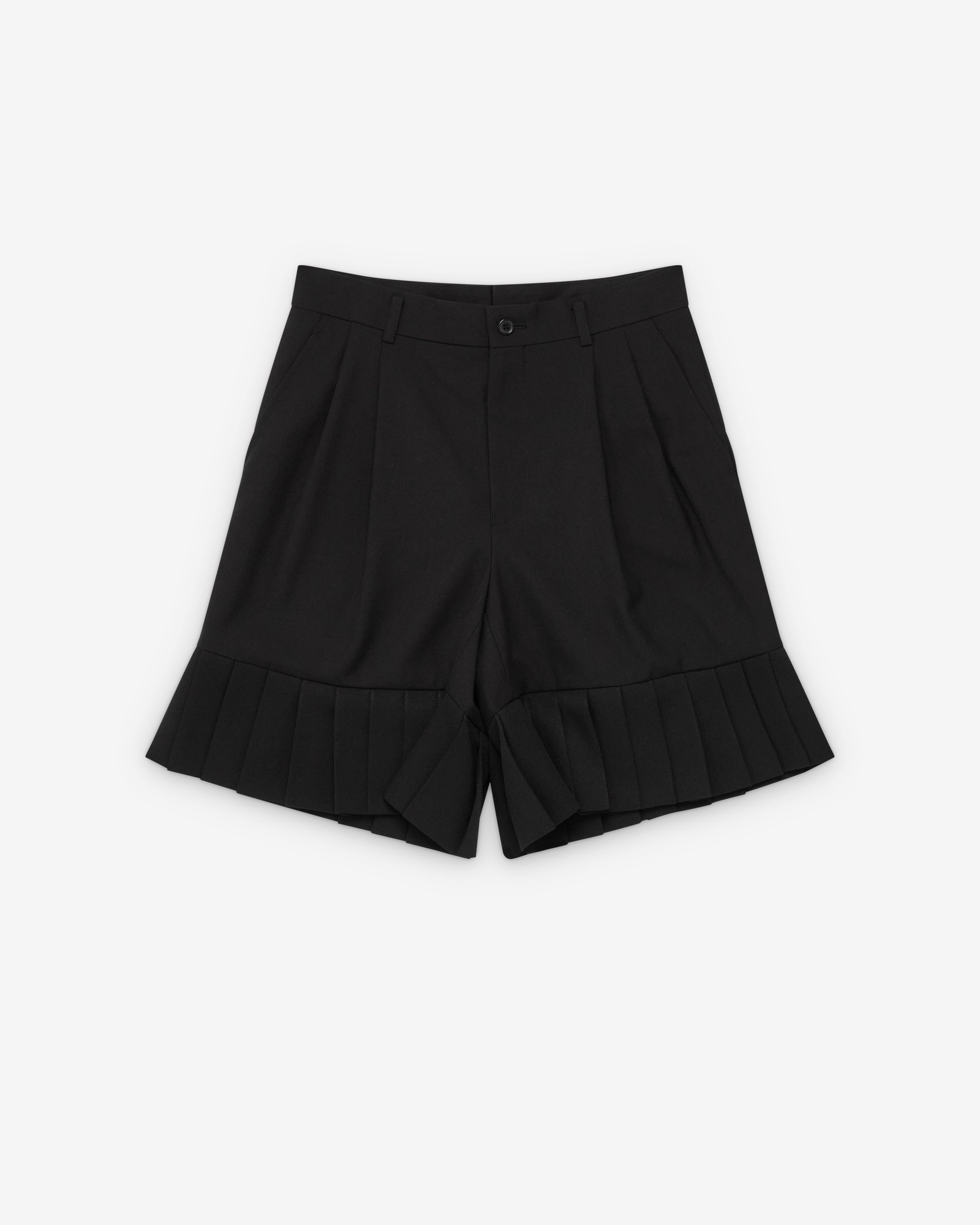 Button waist closure, zip flySide seam pocketsFront and back pocketsPleated hemsFront dual pleats