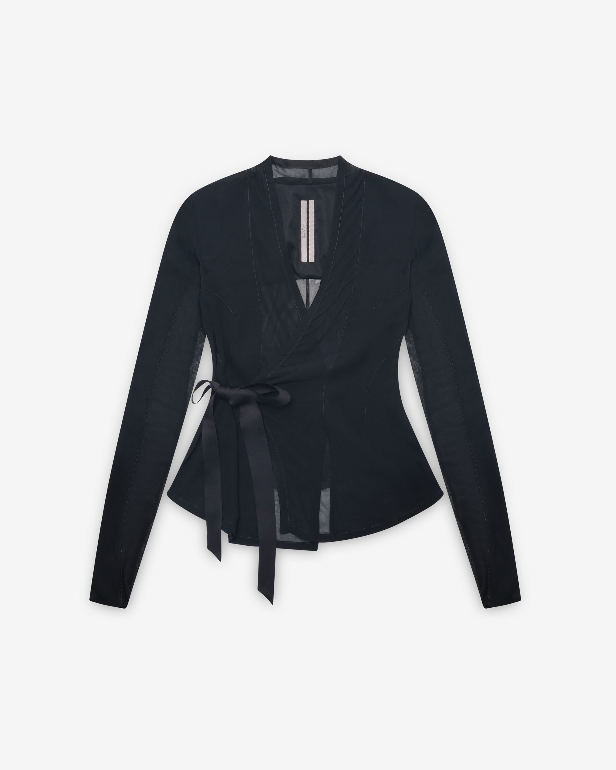 Above-hip lengthLong slim sleeves with a knit undersideCollarless V neckDouble-breasted front Tie and internal concealed elastic beltFitted shape that flares over the hipsSide back ventsLinedInternal buttoned pockets