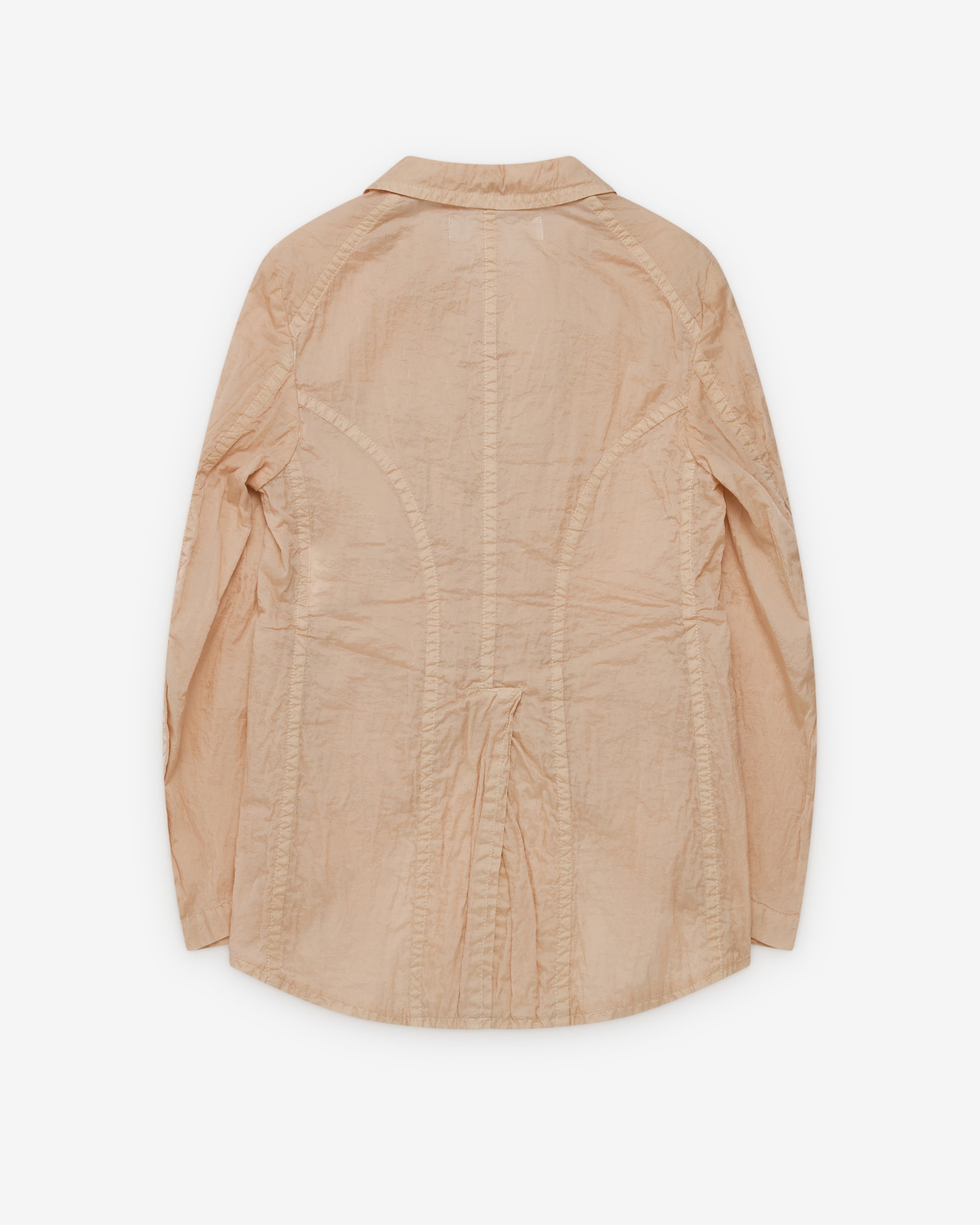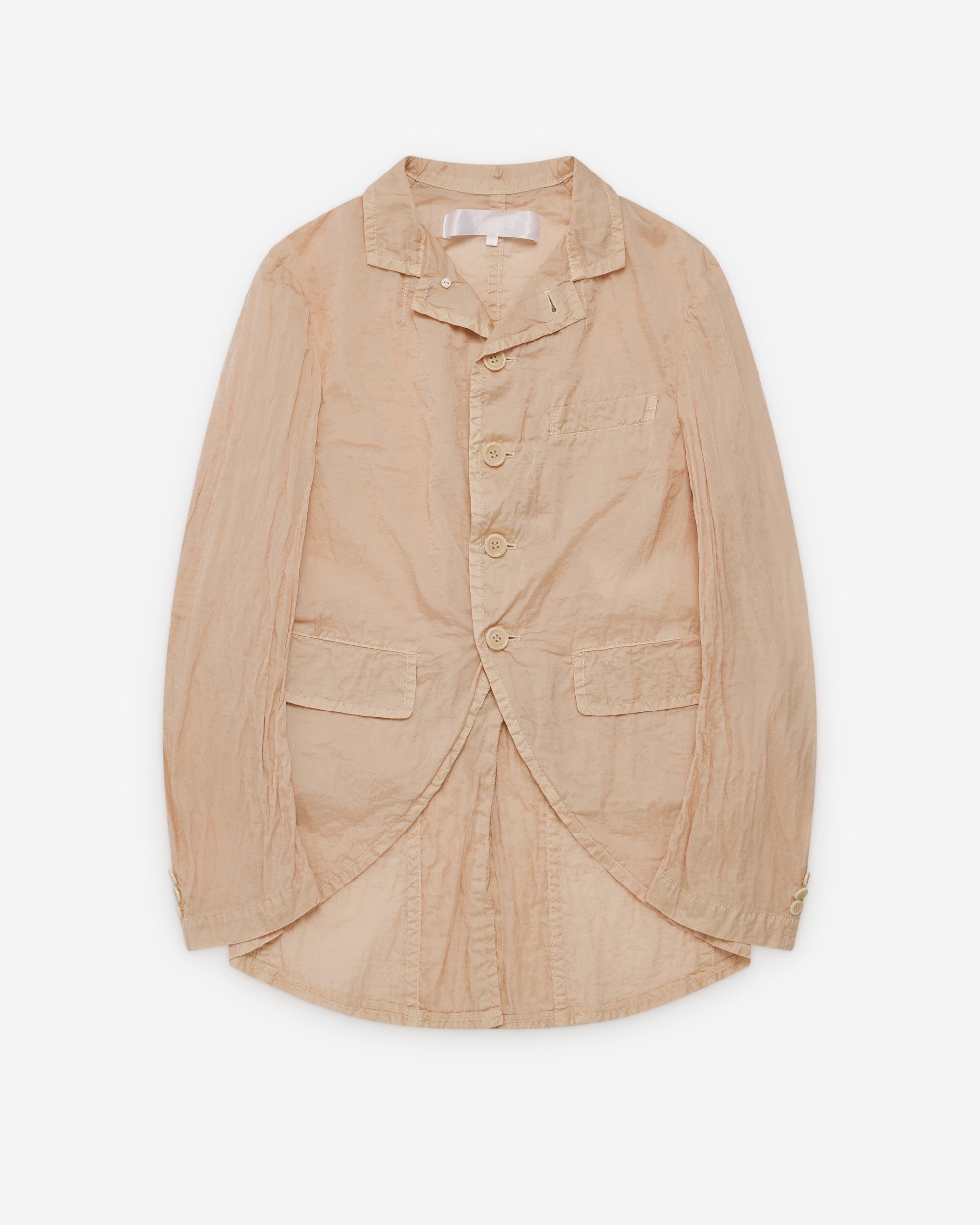 Notched lapel collarFour button front closureFront patch pocketsCrinkled fabricSplit rear shirttail seam