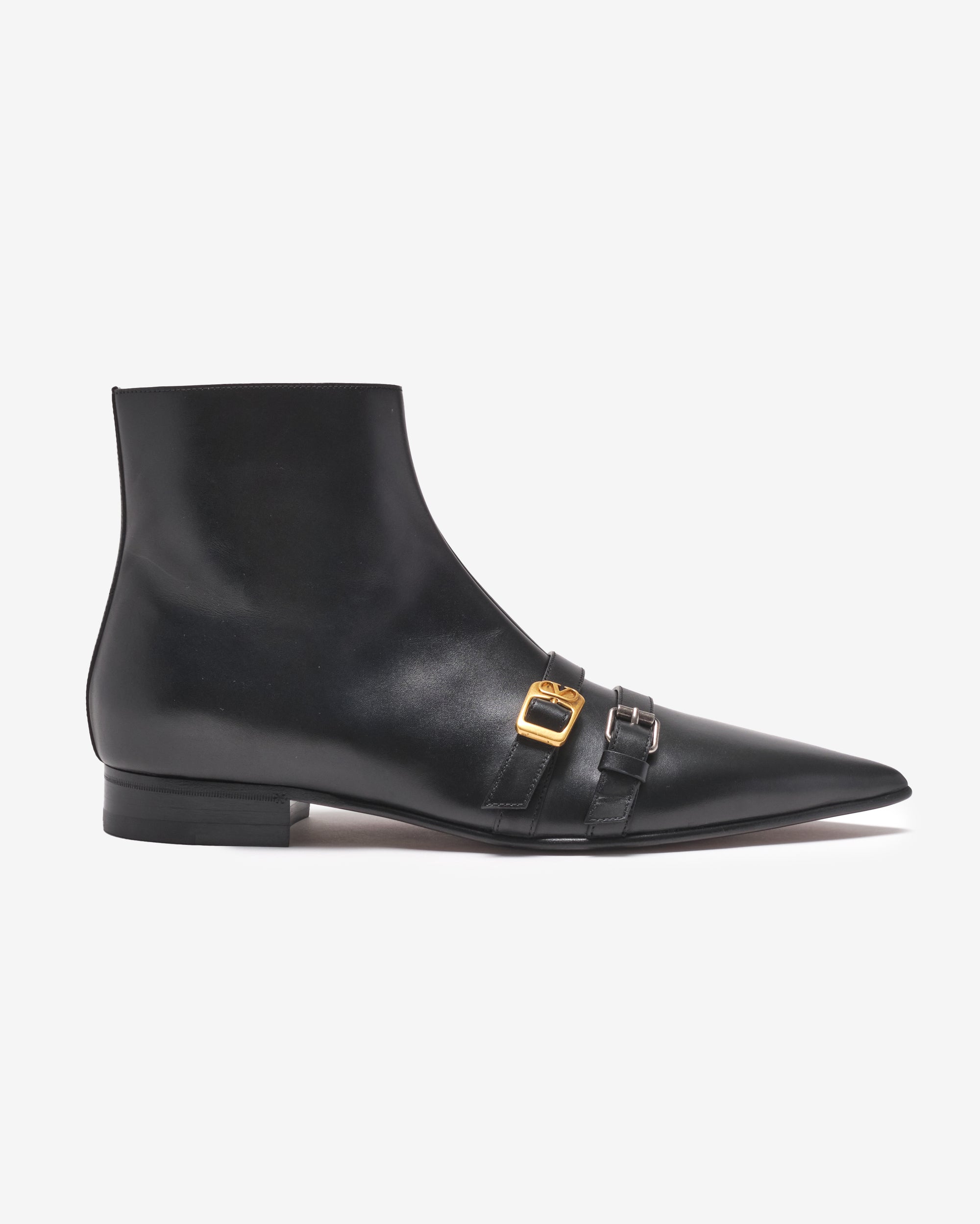 Valentino Garavani Mockers calfskin ankle boot Double buckle detail with antique brass and antique silver finish VLogo Signature detail with antique brass finish Leather sole Heel height: 25 mm / 1 in.
