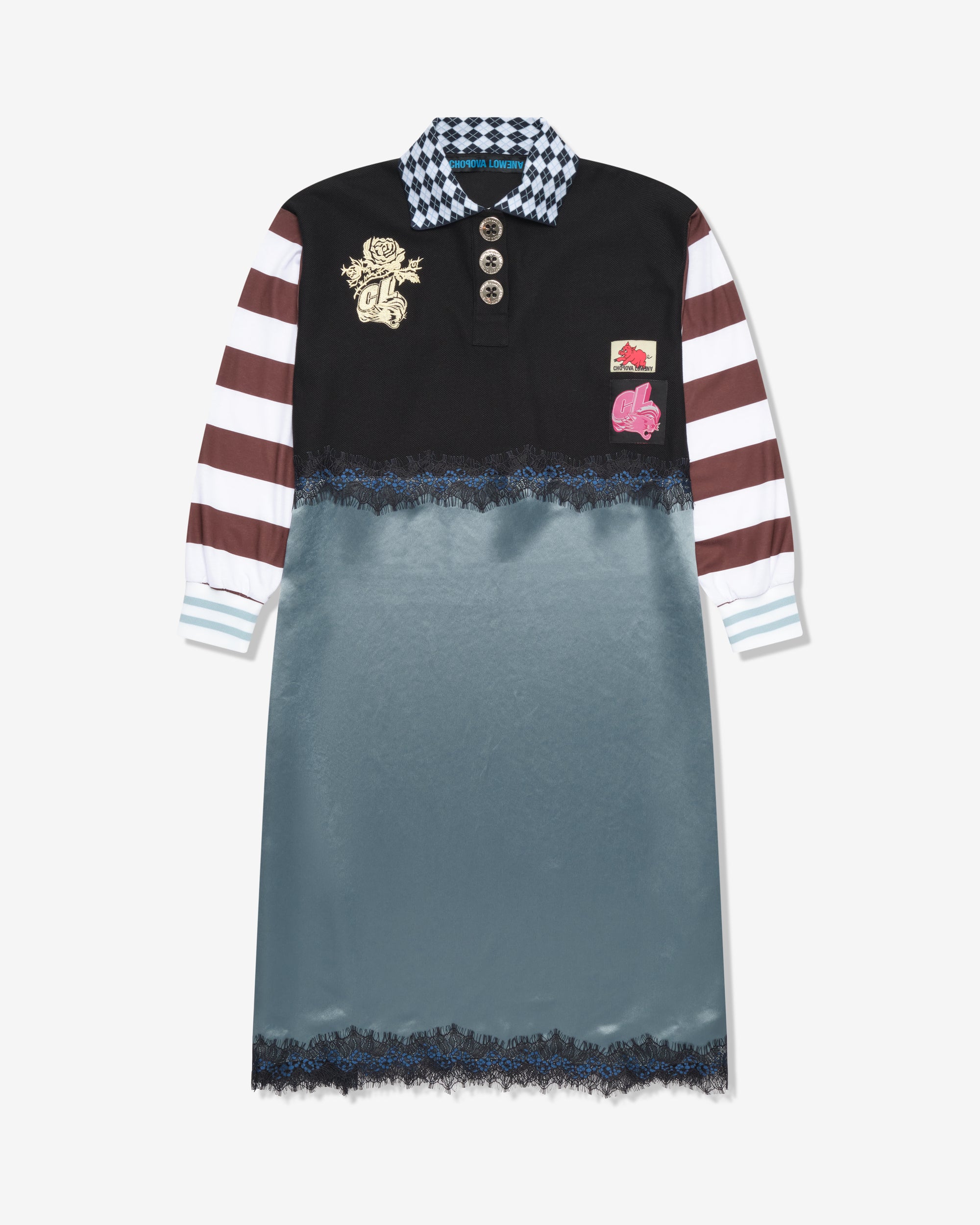 Jersey and satin knee-length dressOversized fitBlack, brown, and white striped upperBlue satin slip skirtArgyle collarLace hemLong sleeveJersey, SatinMade in Bulgaria