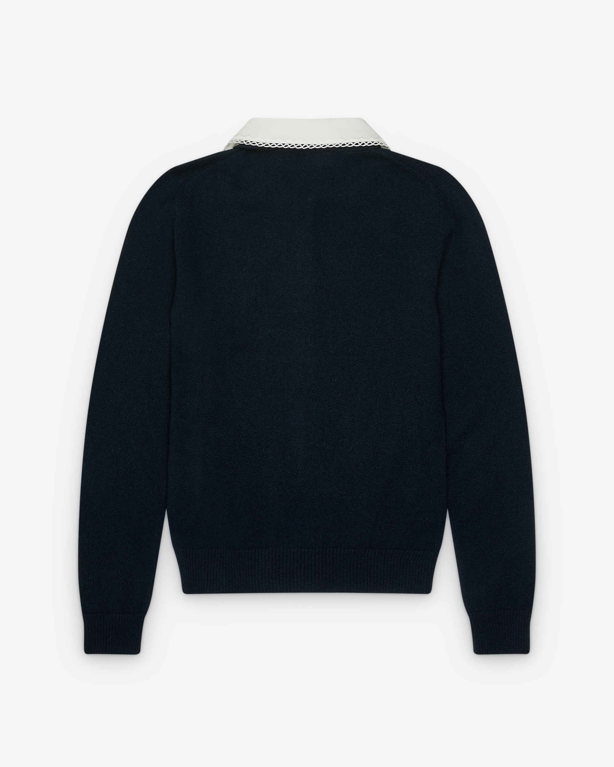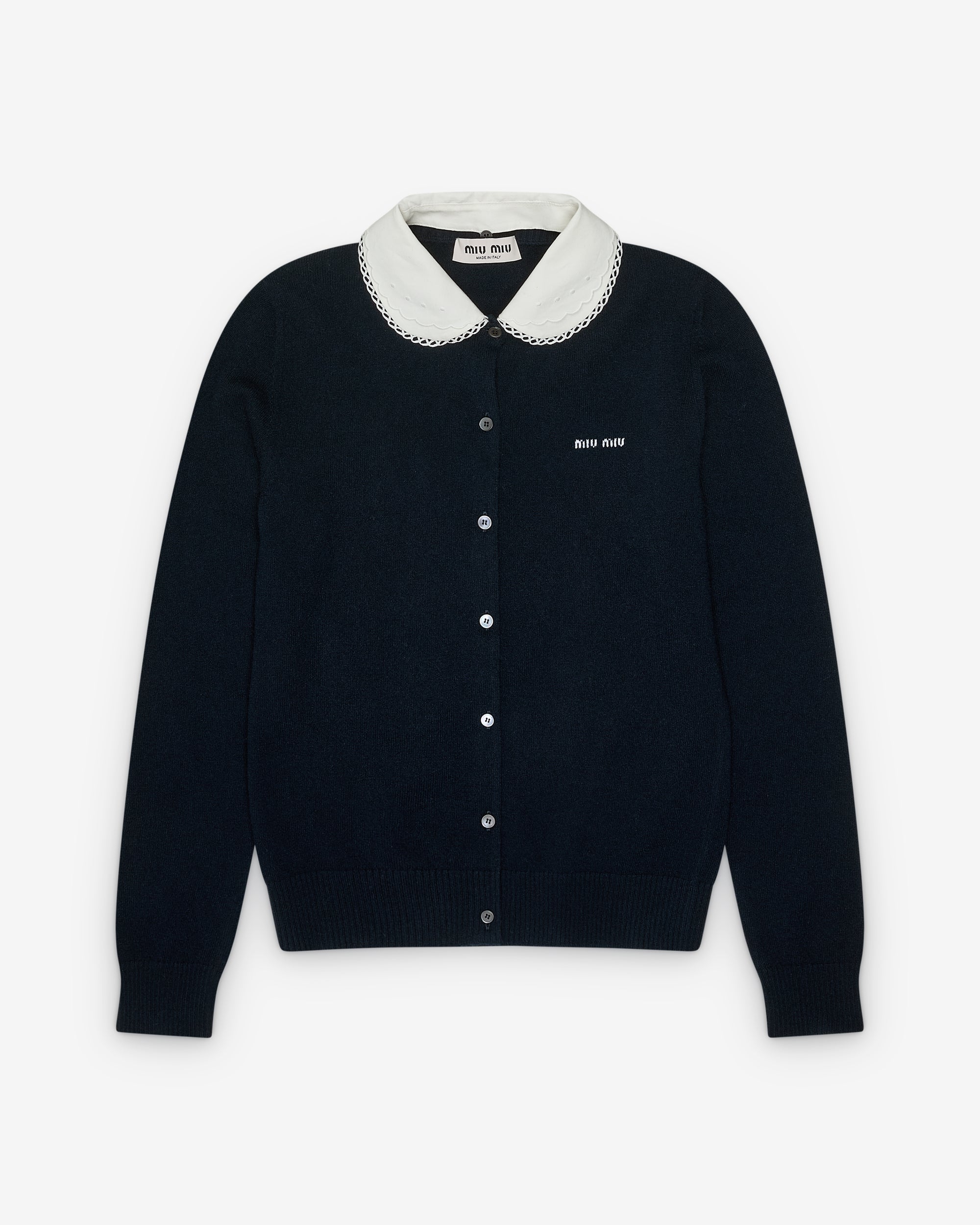 Contrast collar and buttonsPeter Pan collarRibbed trimEmbroidered logo at chestCashmereMade in Italy