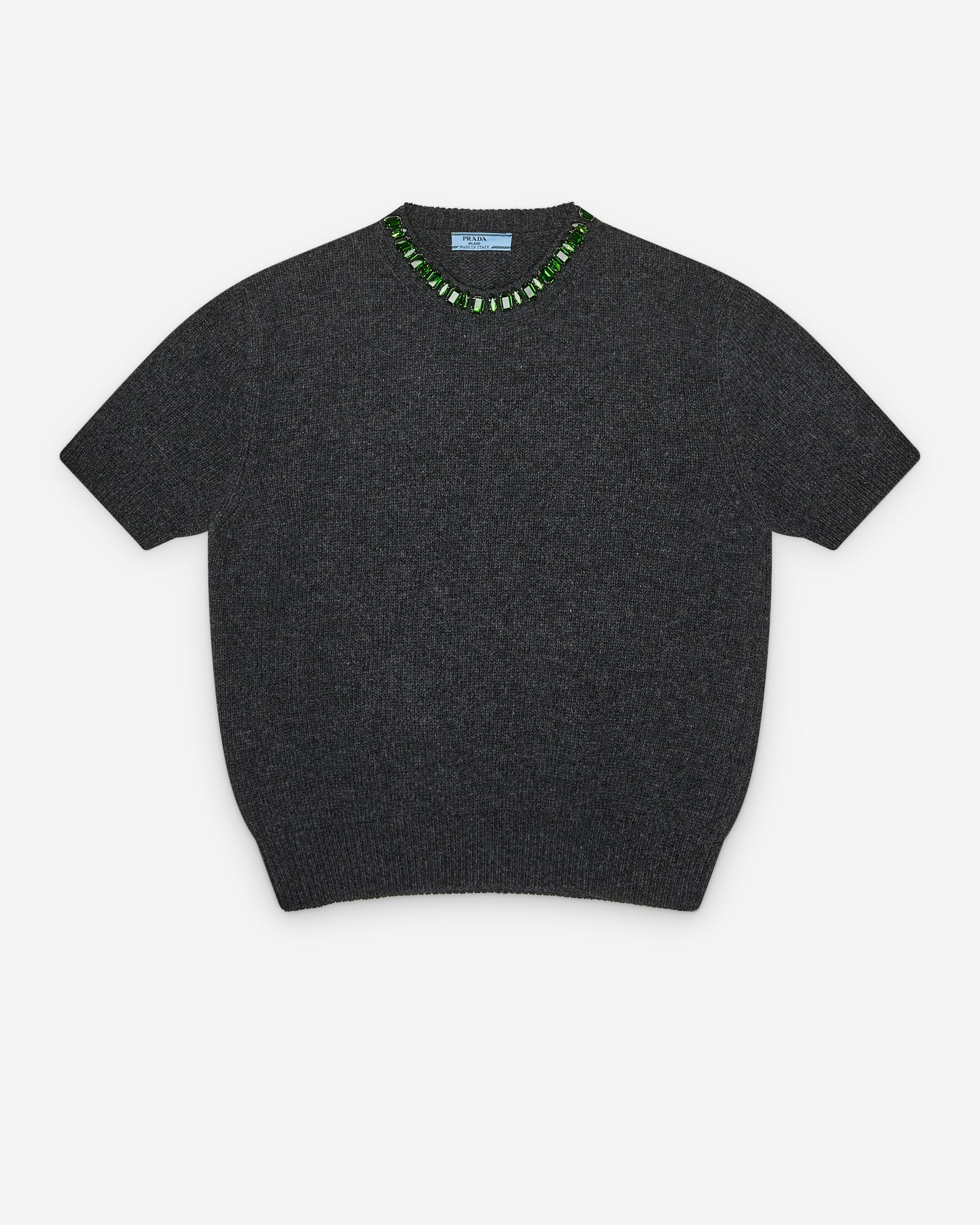Short sleevesRibbed trimRound neckBejeweled embroidery at neckline70% Virgin Wool, 30% Cashmere; 60% Glass, 40% BrassMade in Italy