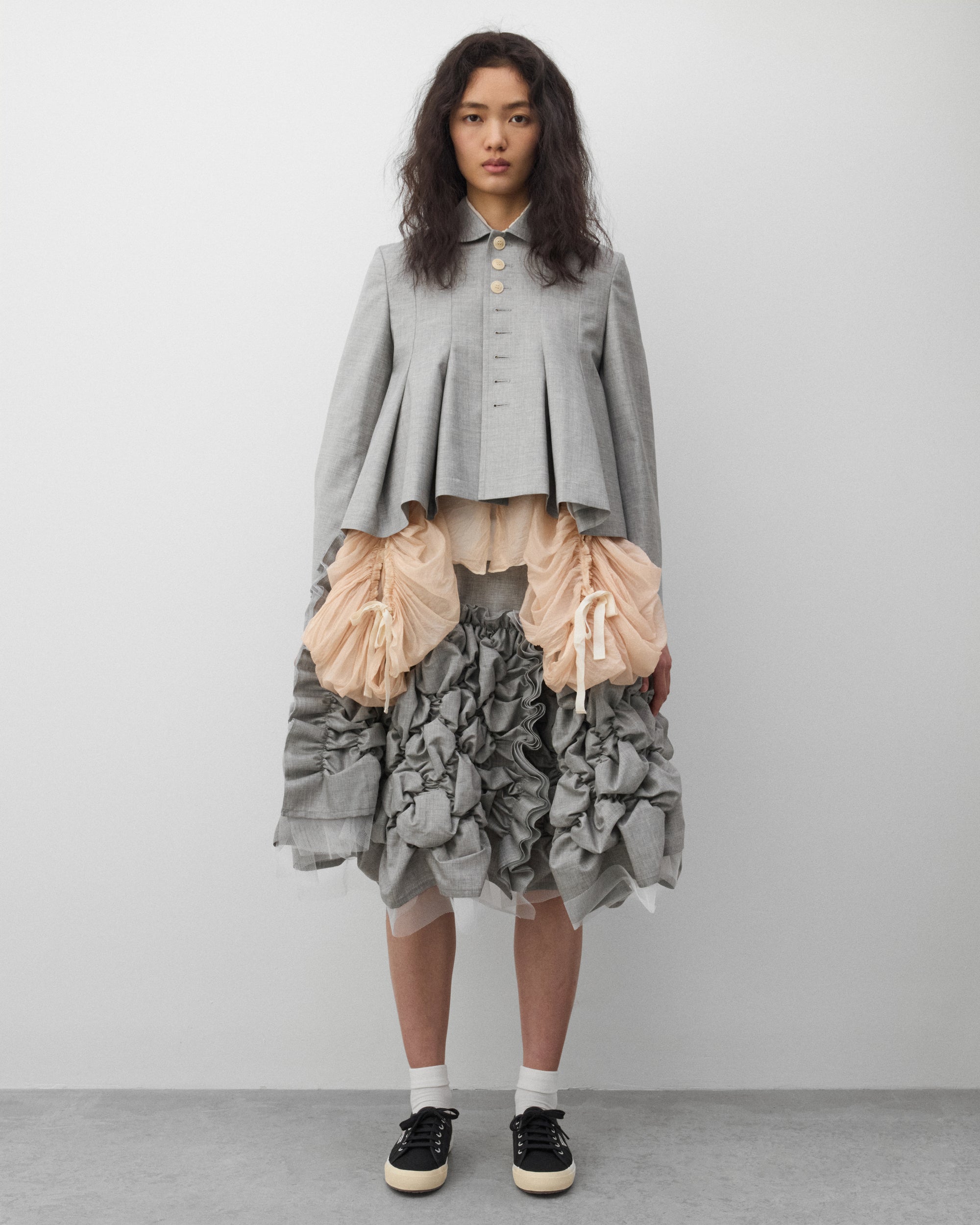Wool upper sectionRuffle nylon attached lower Back zip closureTulle underlay Knee length