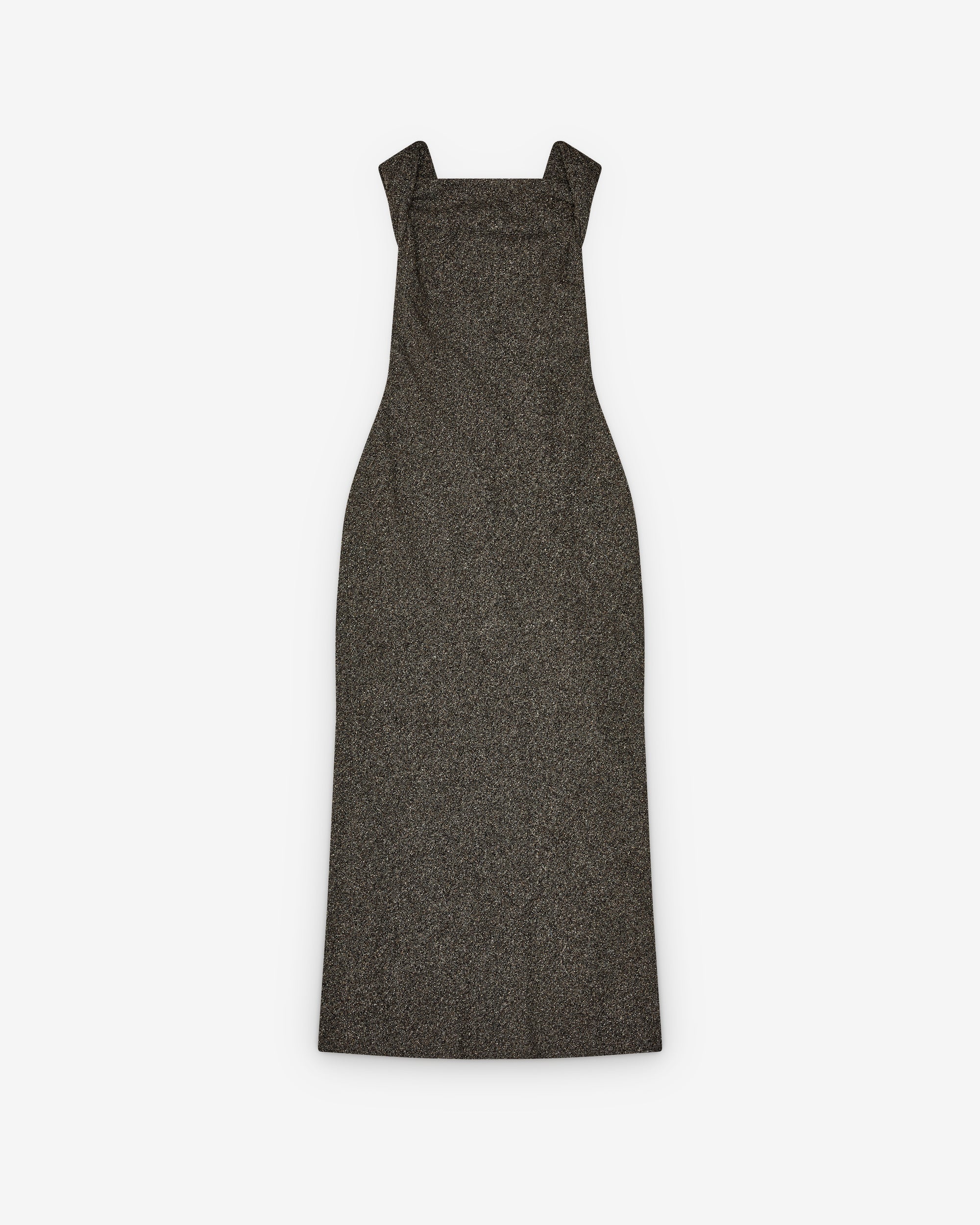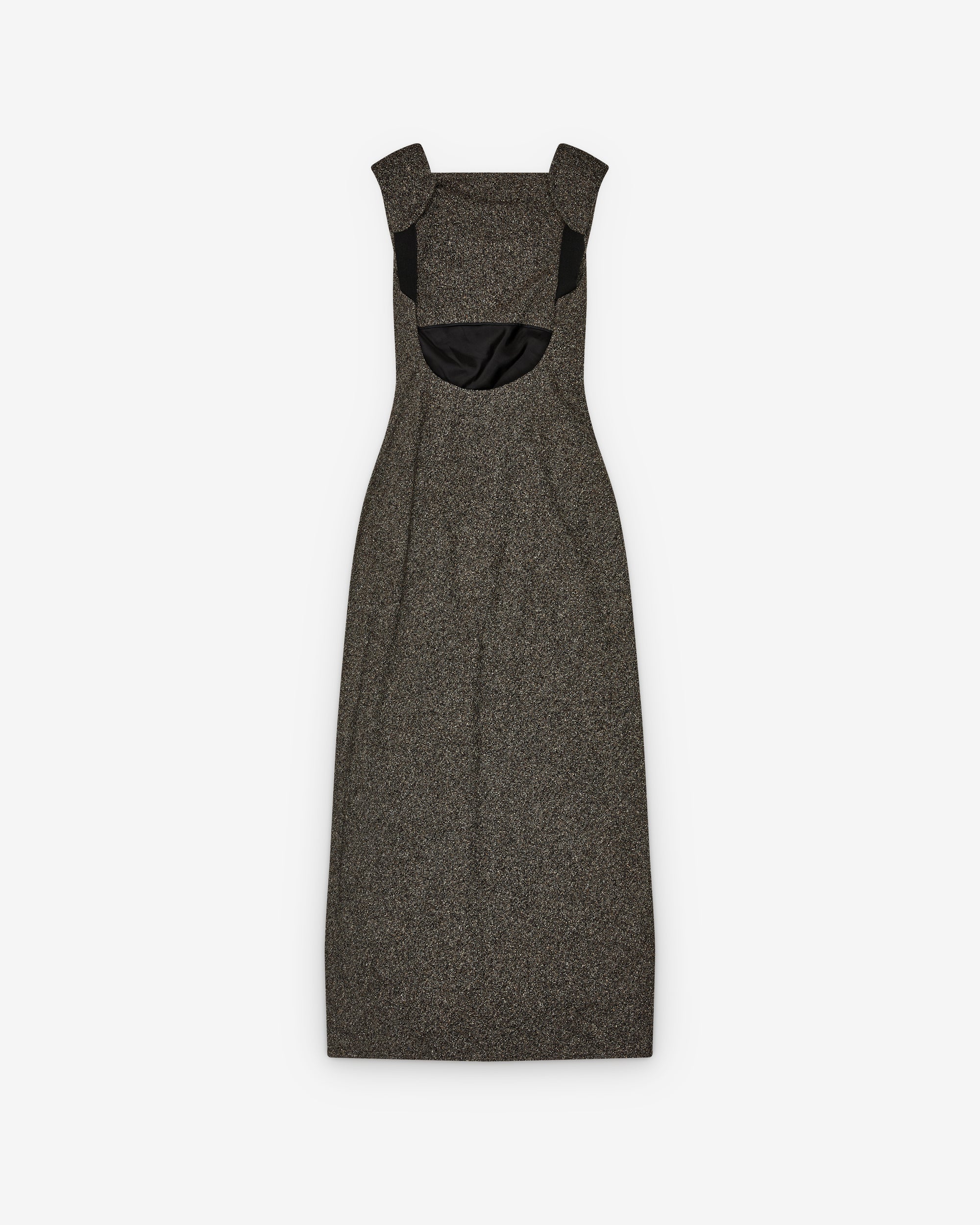 Maxi lengthExaggerated hipsSquare neckOpen backSilk, WoolMade in USA