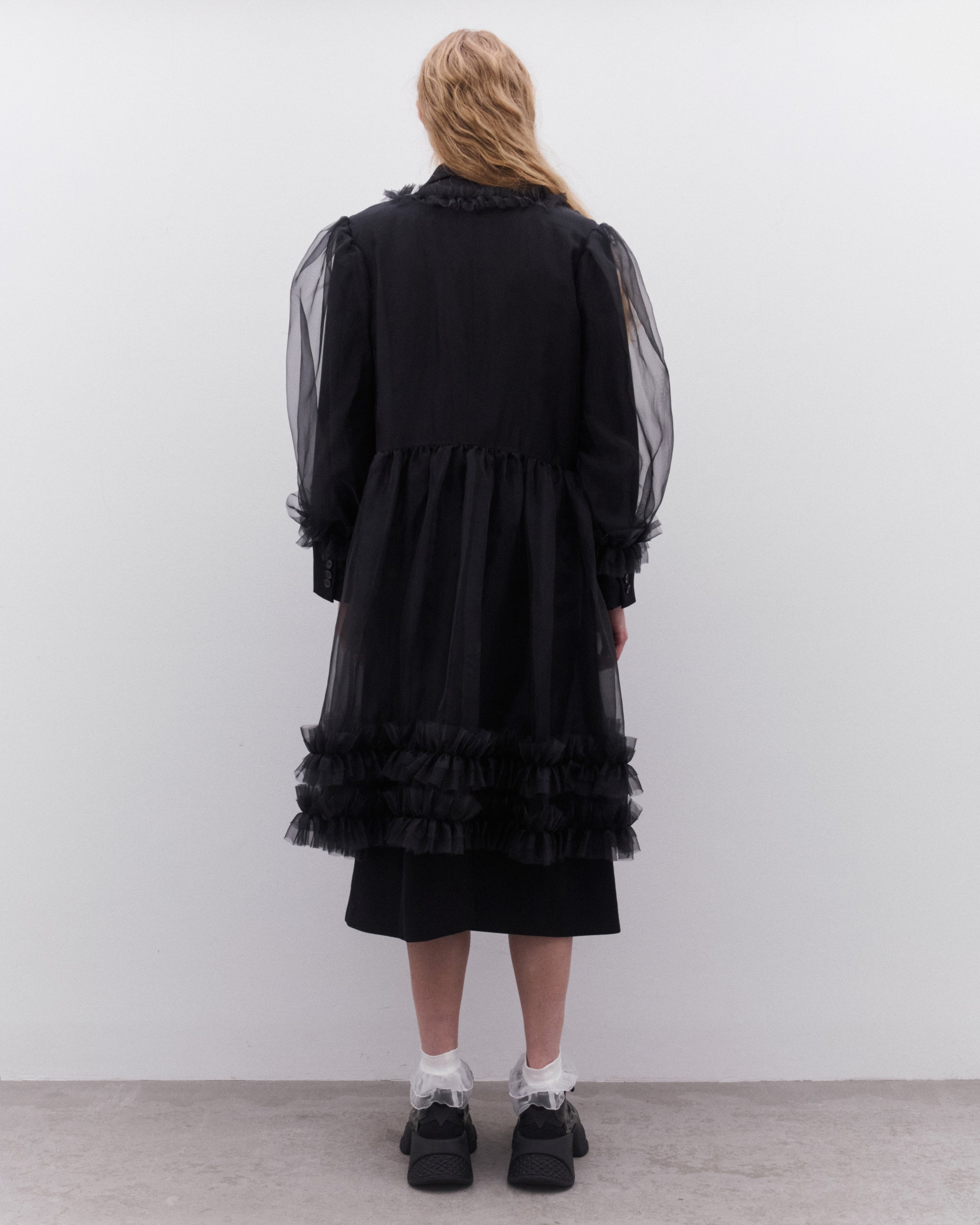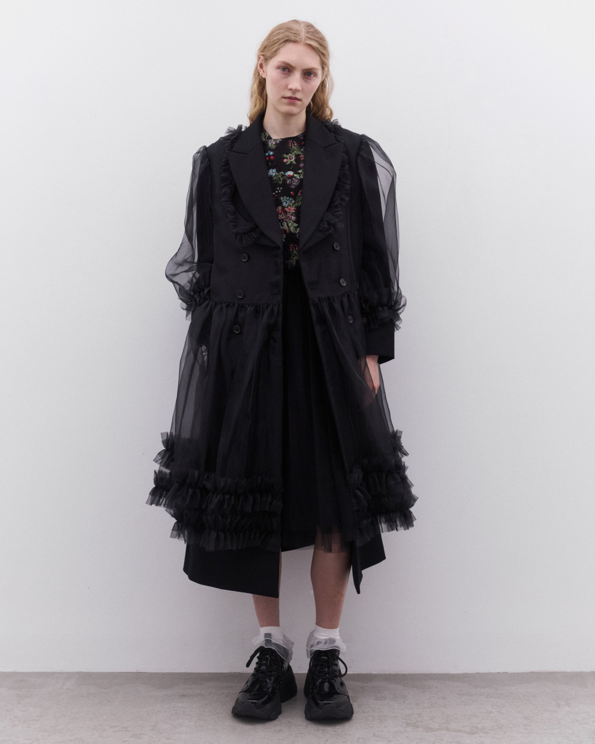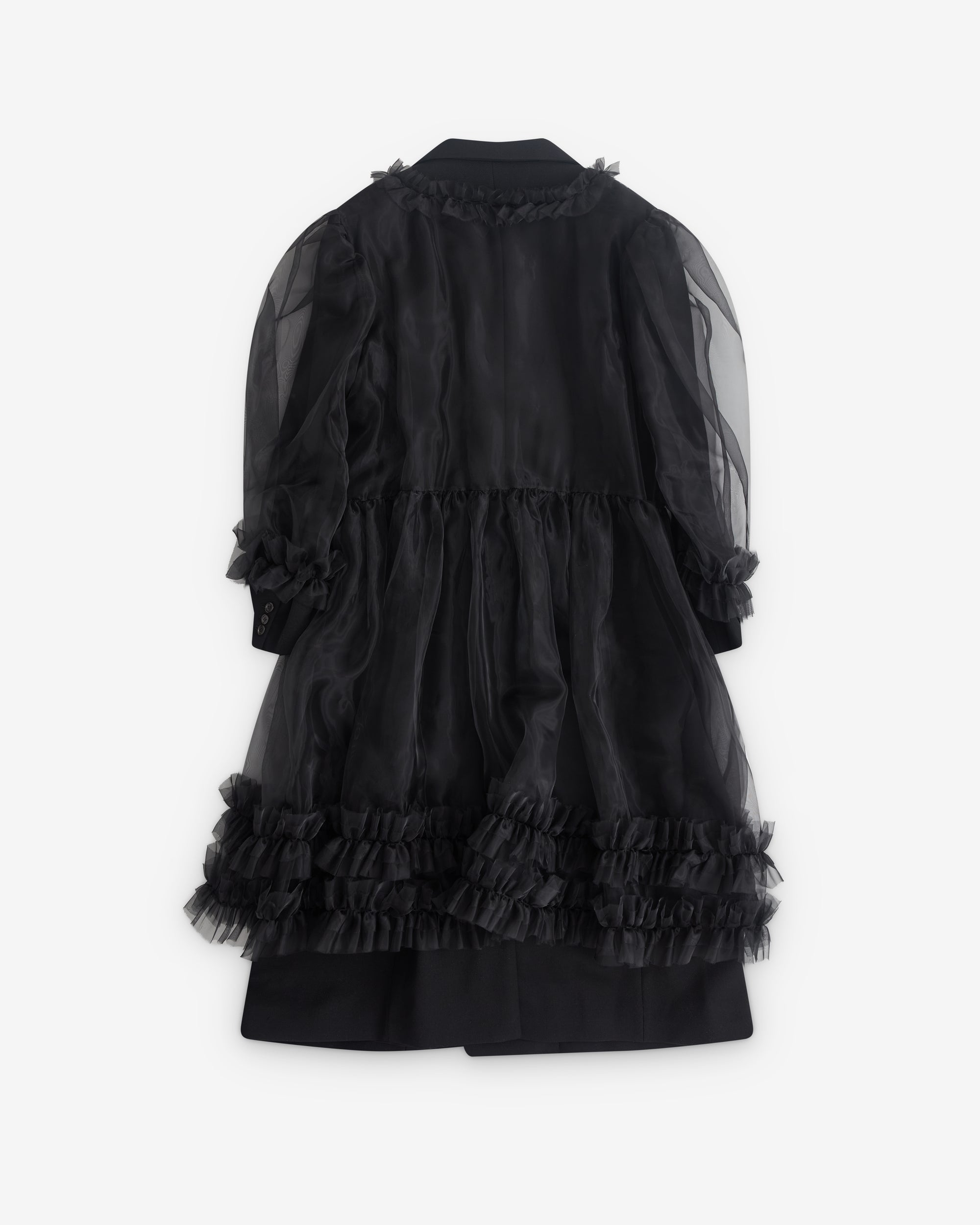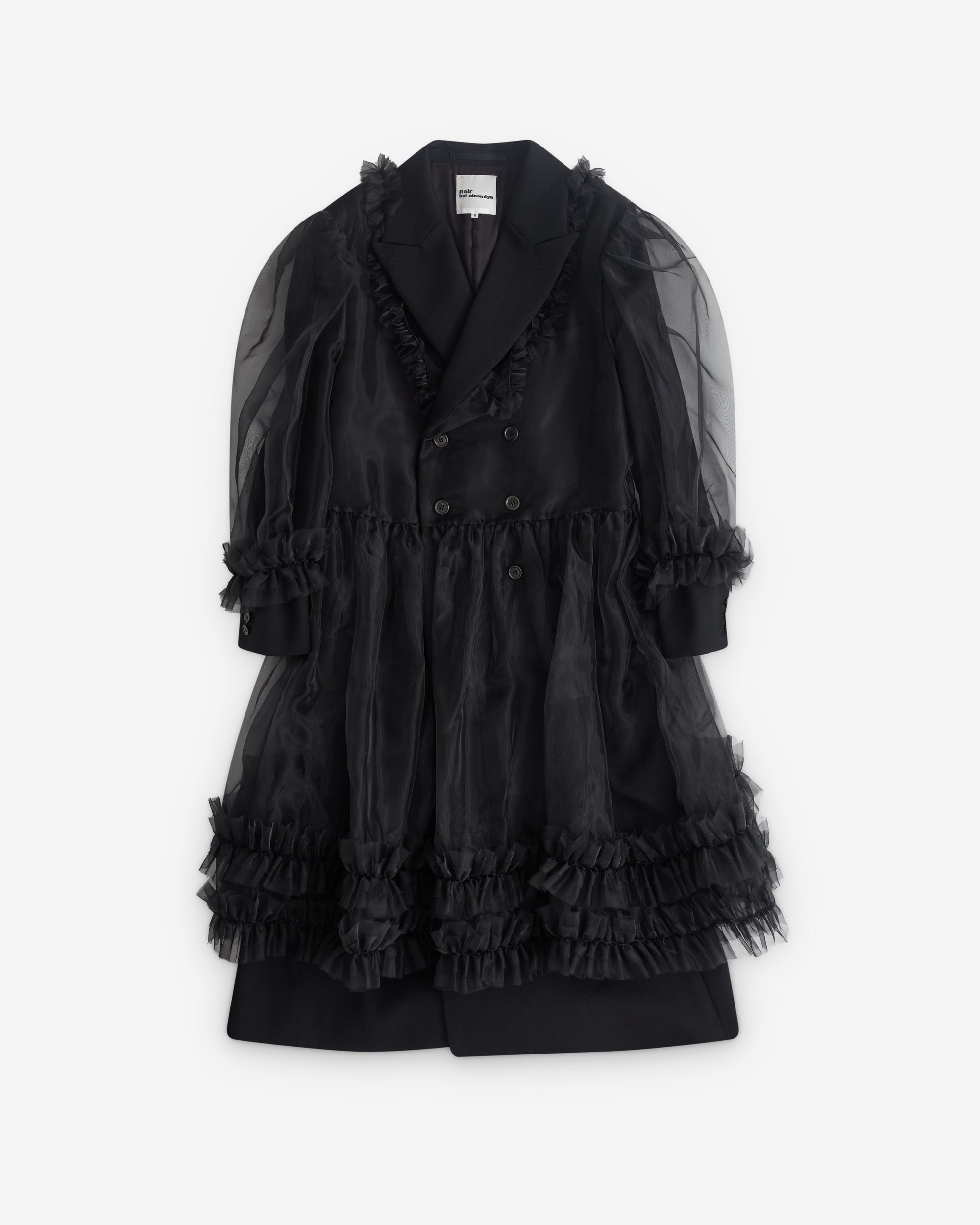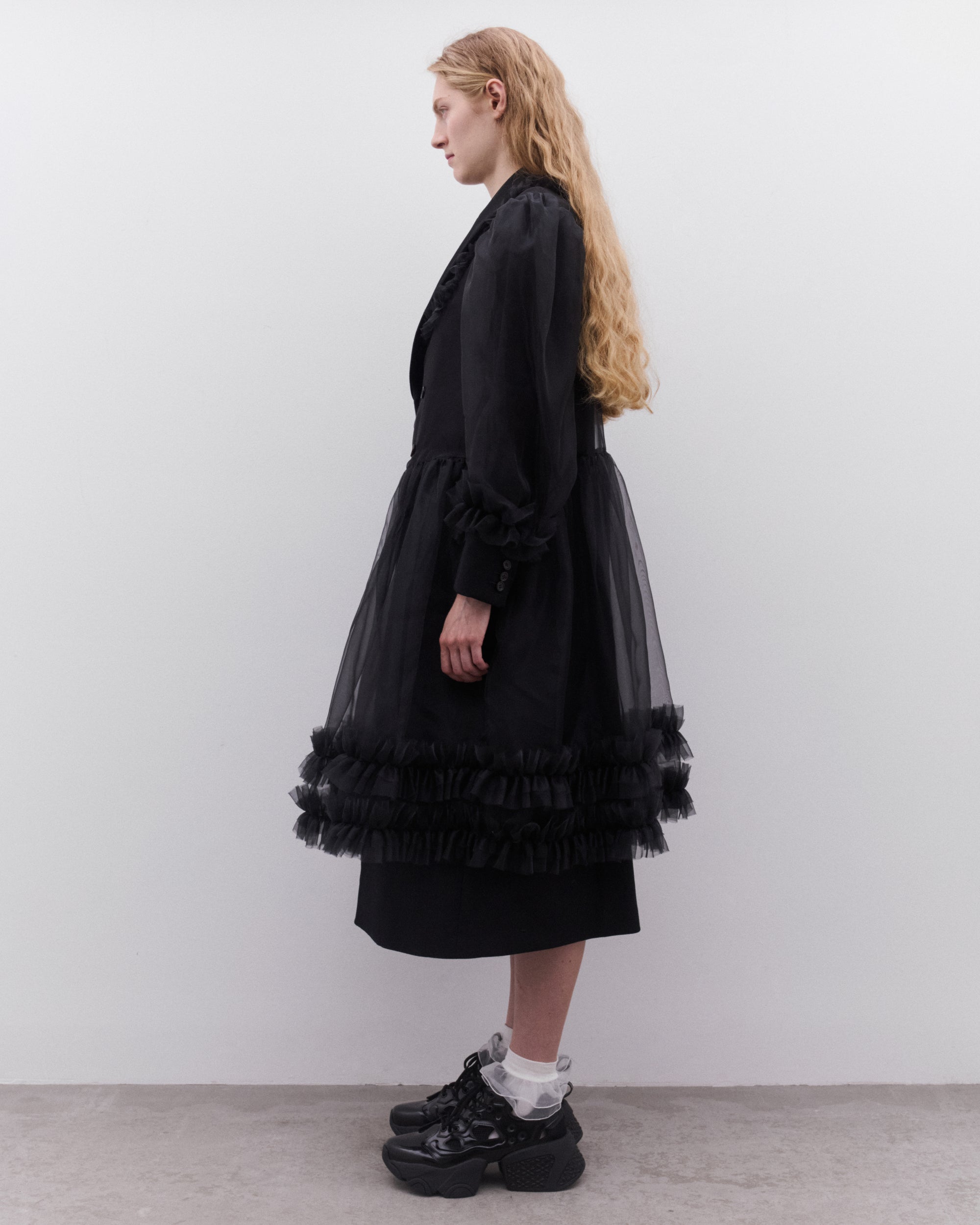 Classic notch lapel collarDouble breastedSide welt pocketsDouble internal welt pocketsTulle overlay with ruffle detail at seamsLinedBody: 100% Wool Tulle: 100% PolyesterLining: 100% CuproMade in Japan