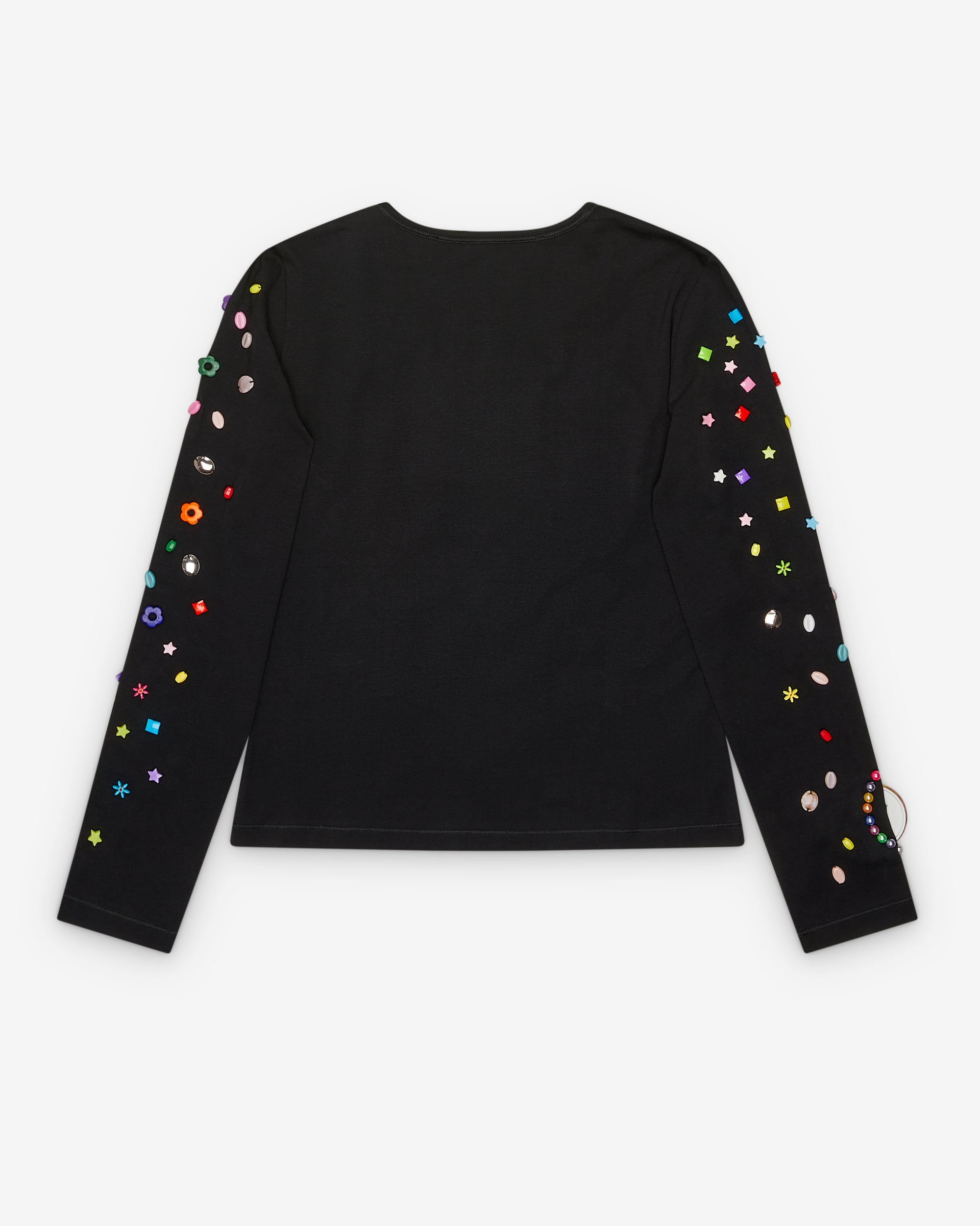Black long sleeve topHand-beadedCentral butterfly panelRemovable pin badgesCrewneck100% CottonMade in Bulgaria