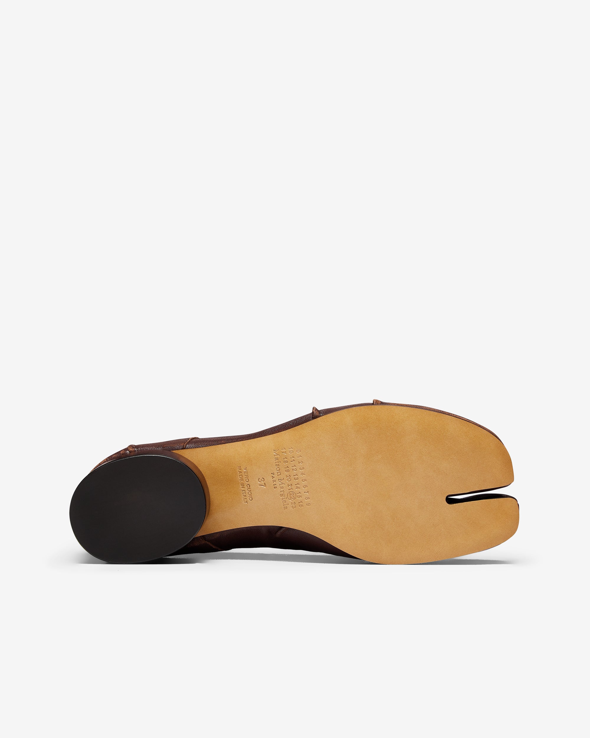 In soft nappa leather, the Maison presents the Tabi new ballerinas, which take their design from ballerina shoes in the archives. They are crafted with handmade folds, manually worked to create an artisanal vintage effect at the sides. Complete with a 3cm cylindrical heel. They feature the Tabi split-toe, inspired by the traditional 15th century Japanese sock bearing the same name – launched for the Maison's debut collection in 1989.
