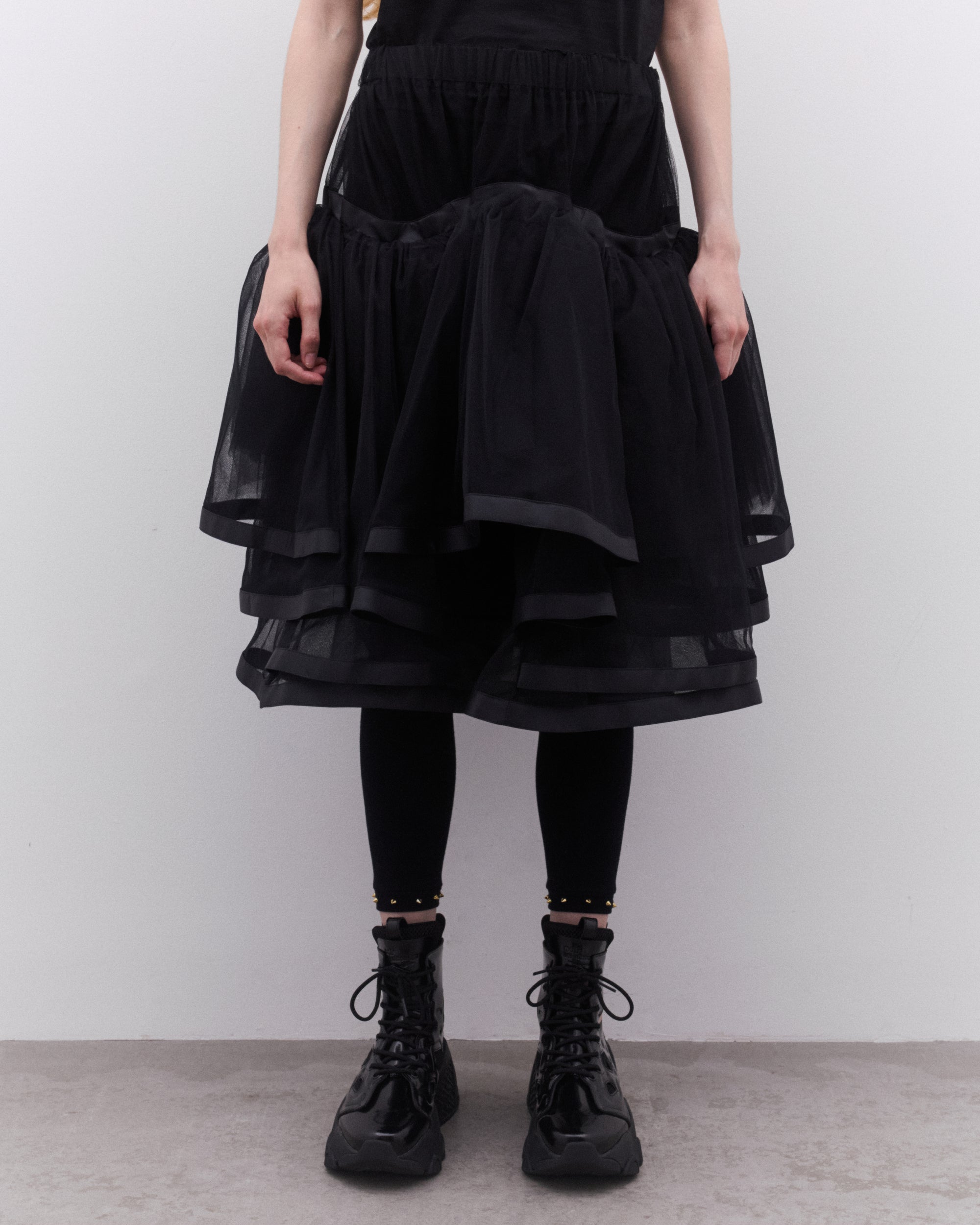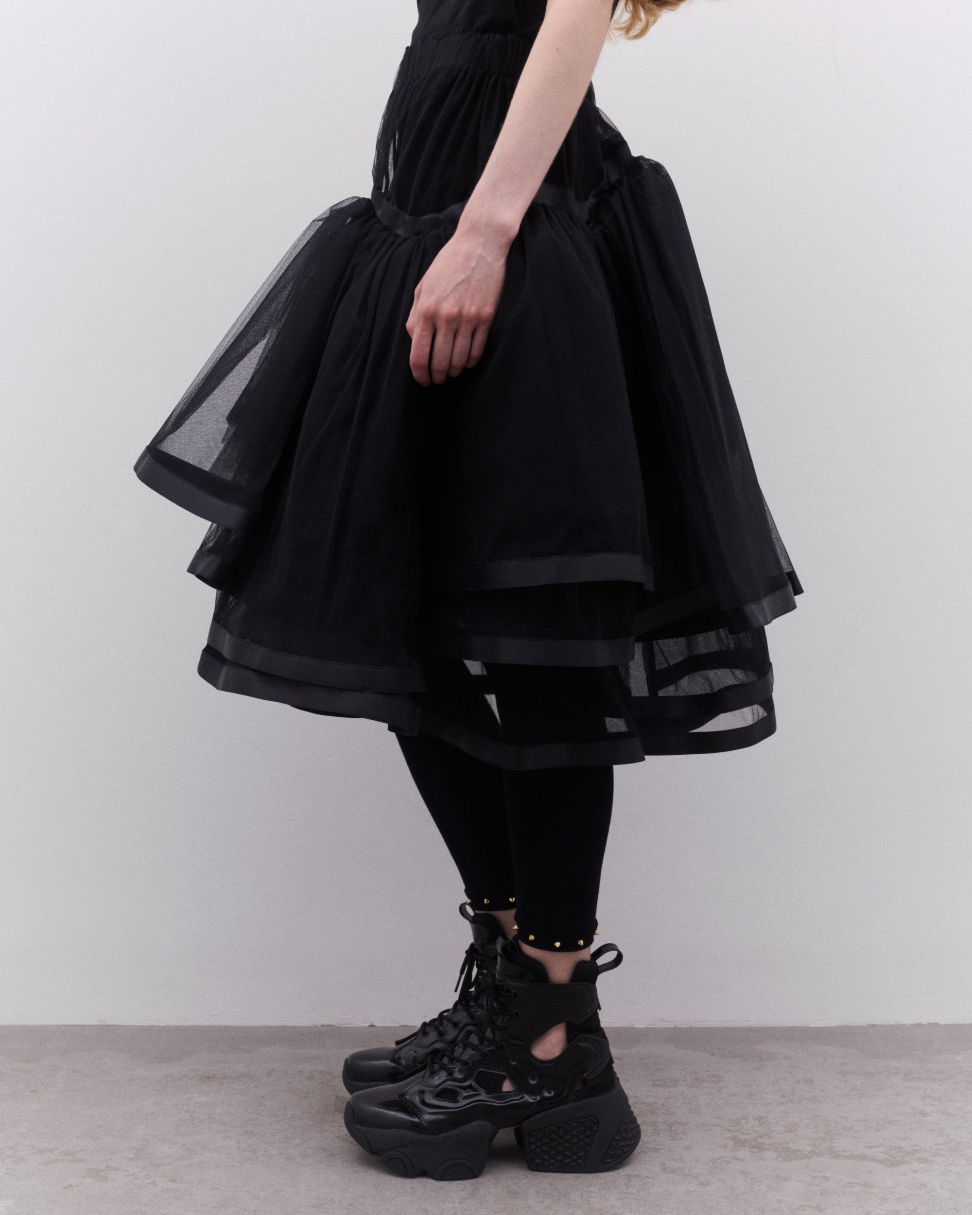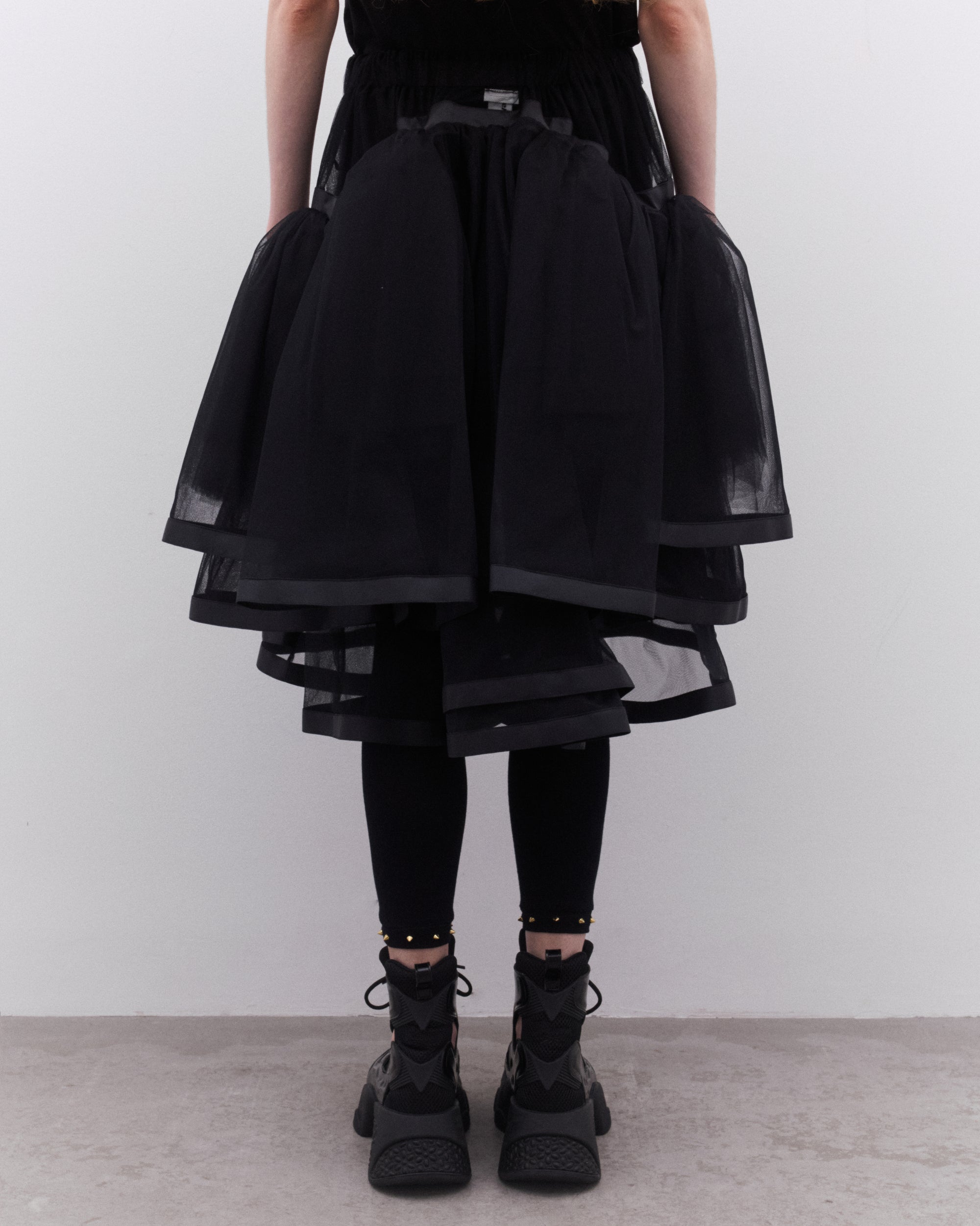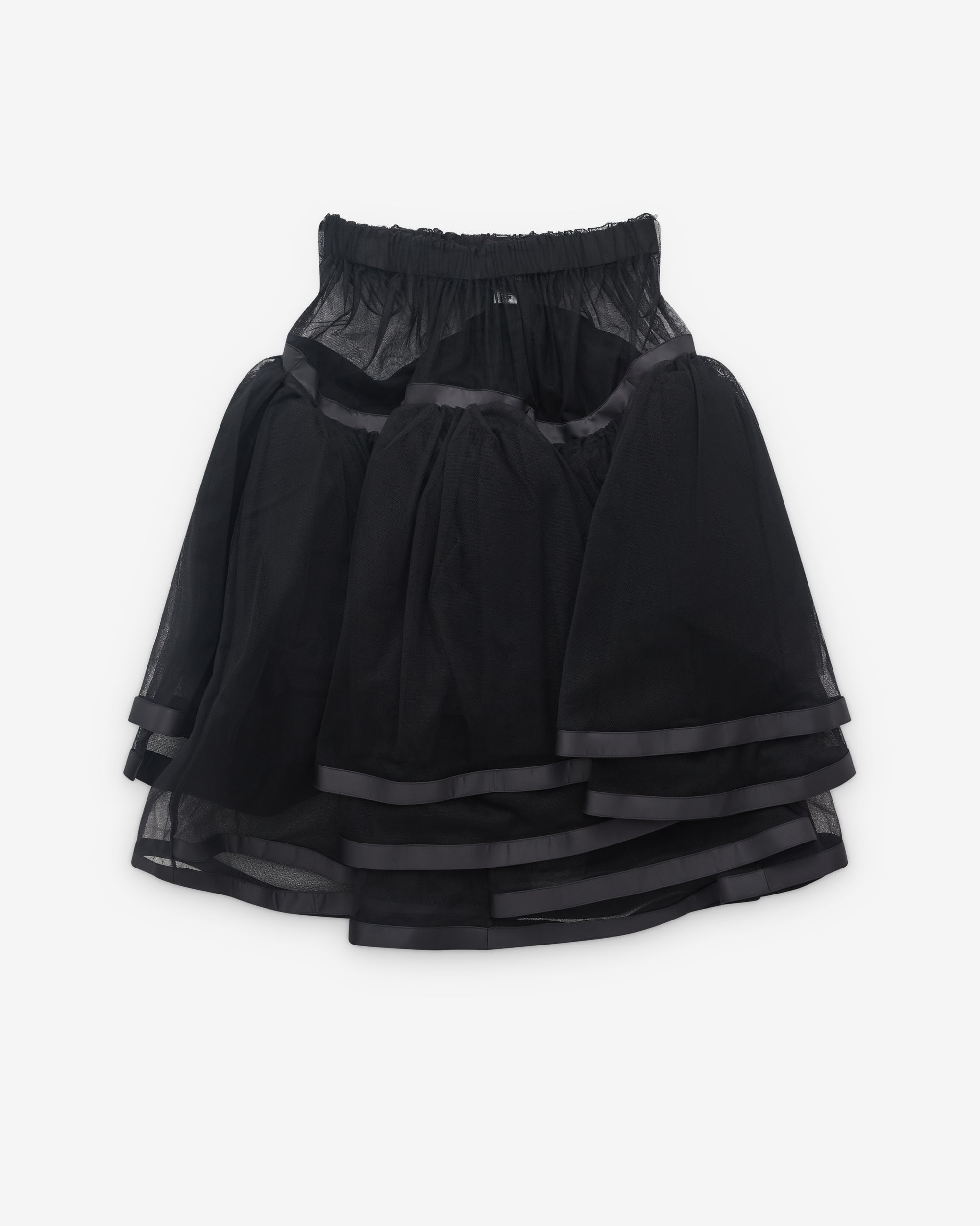 Elasticated waistband with internal drawcordRibbon trim panellingVoluminous attachments throughoutMid lengthA-line silhouetteSemi-sheer