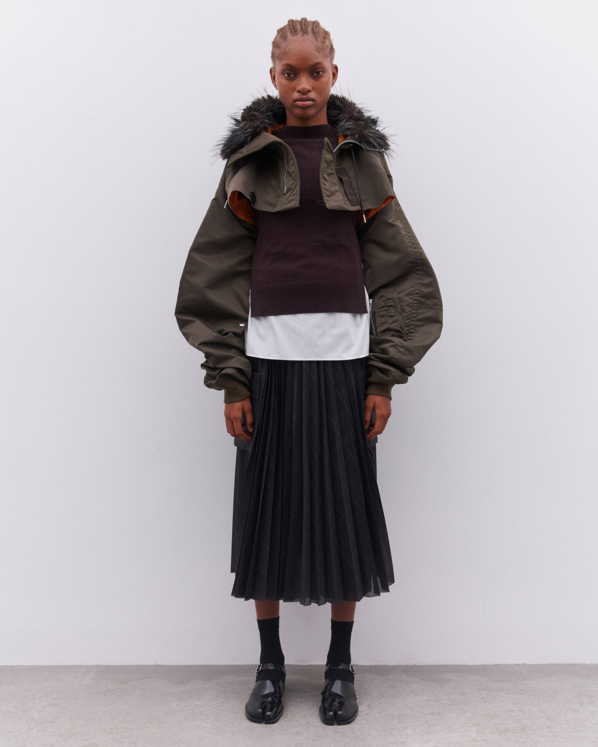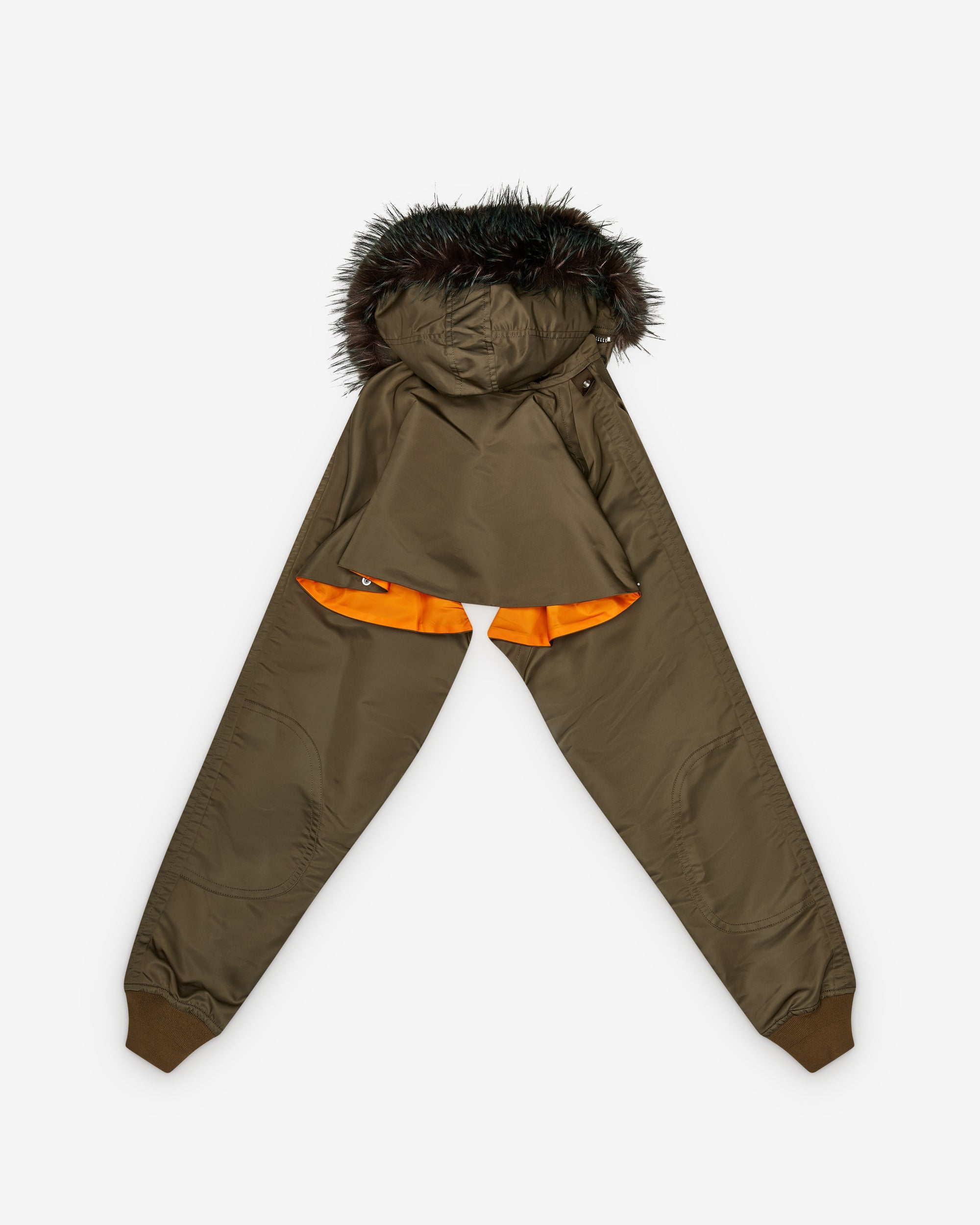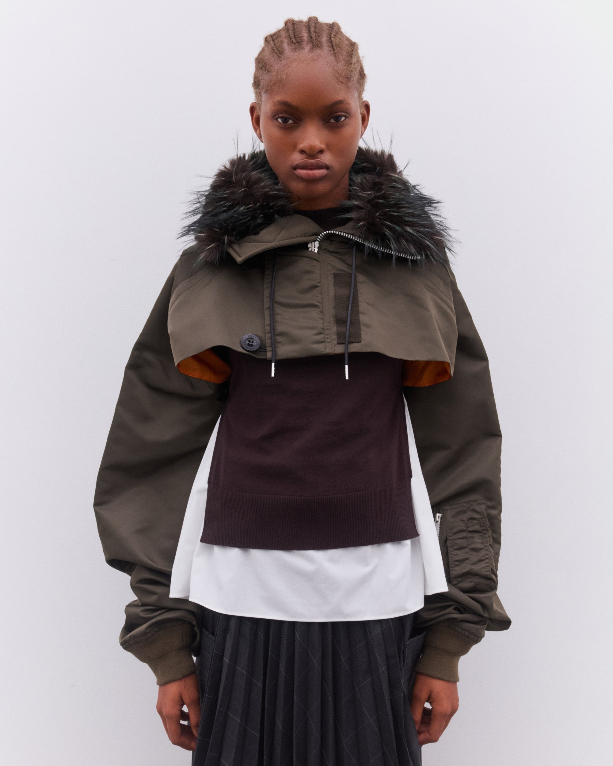Ultra cropped fitZip front closureFaux fur trimmed hood100% NylonMade in Japan